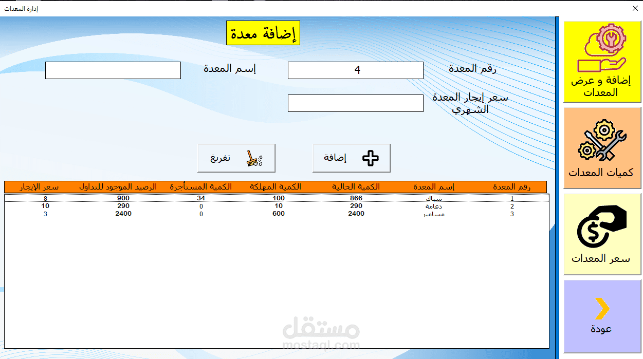 1-1شاشة لإضافة معدات (إسم المعدة - الكمية الابتدائية -سعر المعدة ) ويظهر أيضا فيها المعدات المضافة سابقاً وكمياتها الحالية والمهلكة والمستأجرة والرصيد المتوفر للتداول