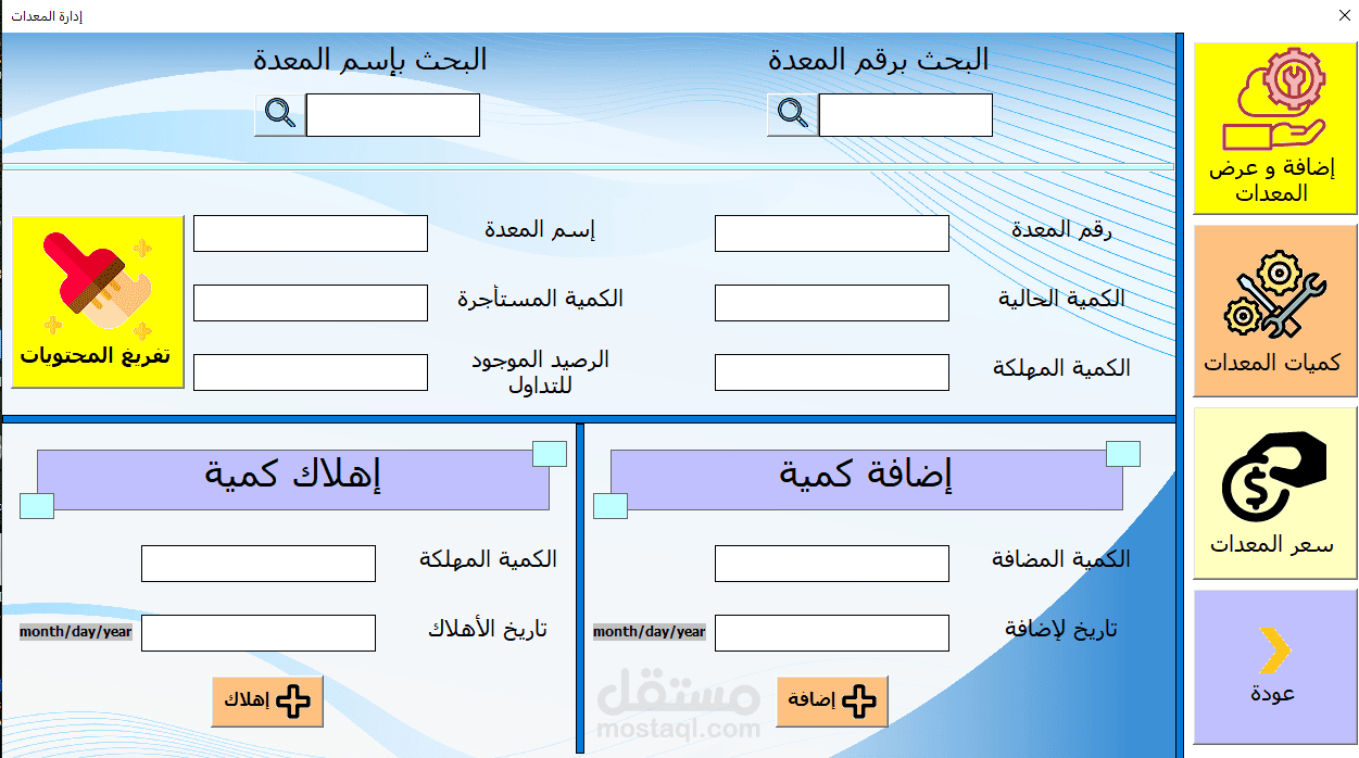 2-1 شاشة لإضافة كميات أو إهلاكها من المعدات التي تم إضافتها سابقا حيث يتم البحث عن المعدة بإسم أو رقم المعدة لتظهر بيانتها وبالتالي يمكن لك إضافة كمية لها أو إهلاكها وذلك بتاريخ لكل إضافة أو تعديل