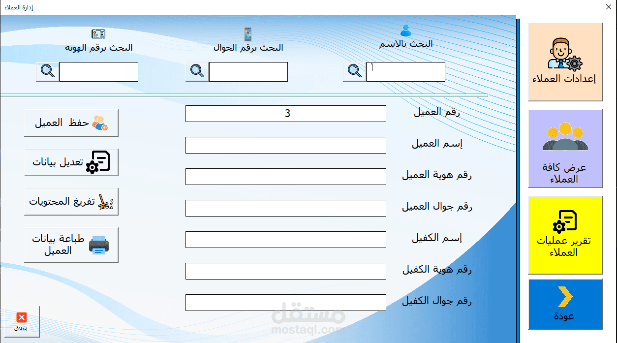 1-2 شاشة لإضافة العملاء أو التعديل علي بياناتهم مع سهولة البحث عنها وطباعة بياناتهم