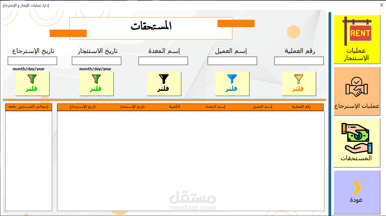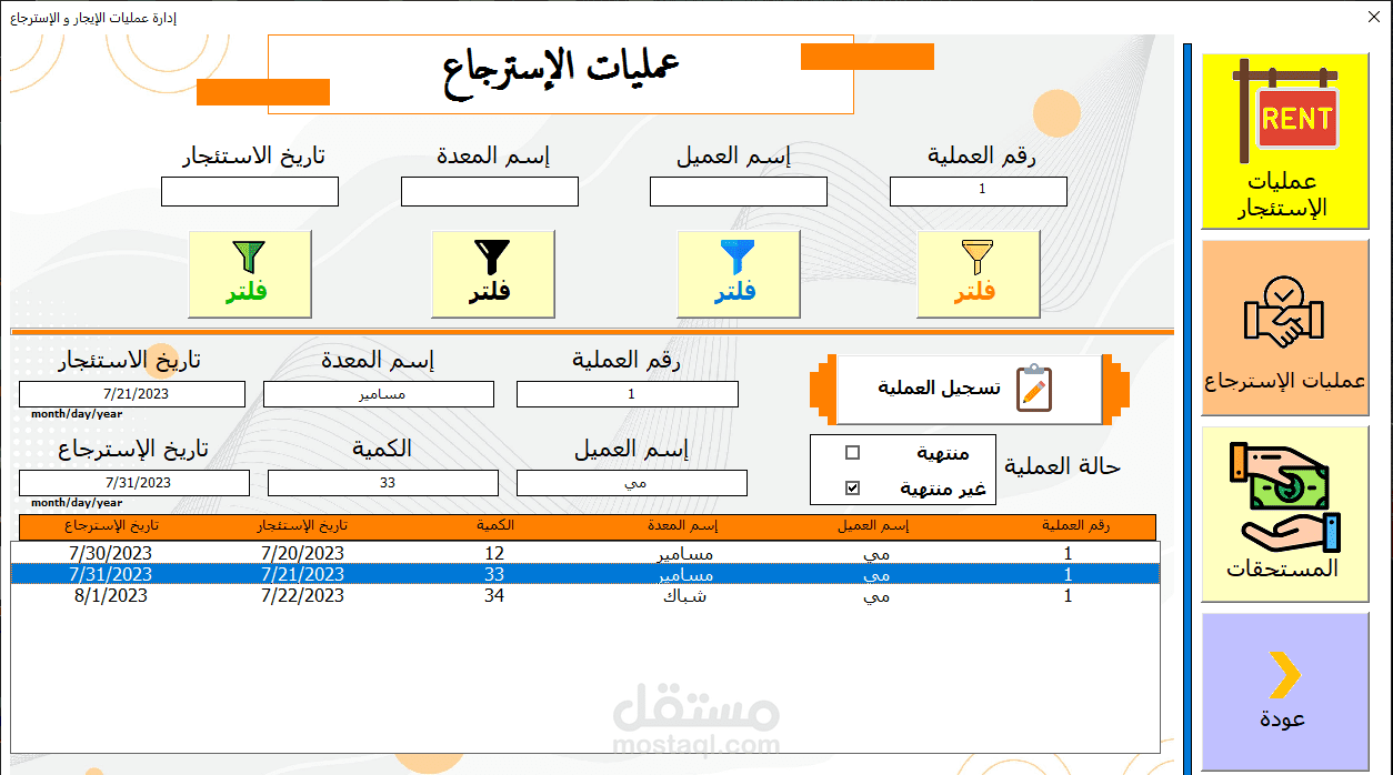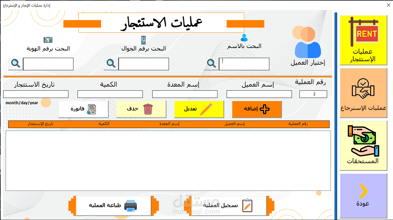 1-3 شاشة لتسجيل عمليات الاستئجار للمعدات