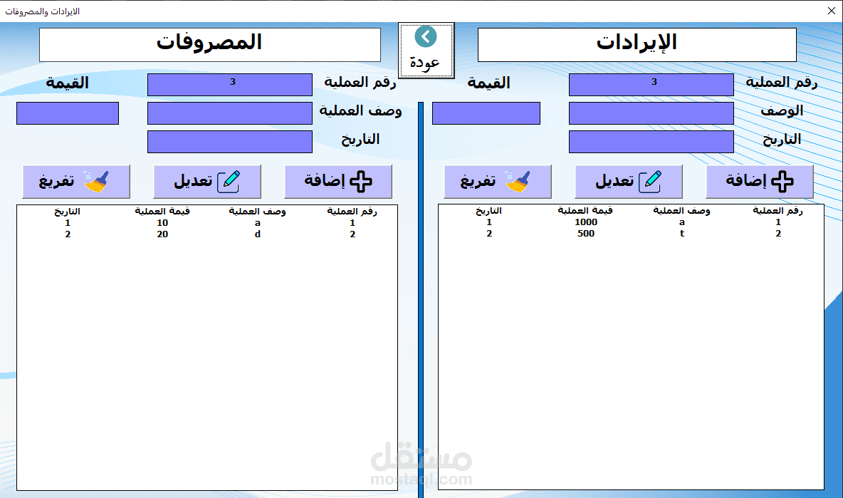 4- شاشة لتدوين عمليات الايرادات والمصروفات وسهولة تعديلهم#####################