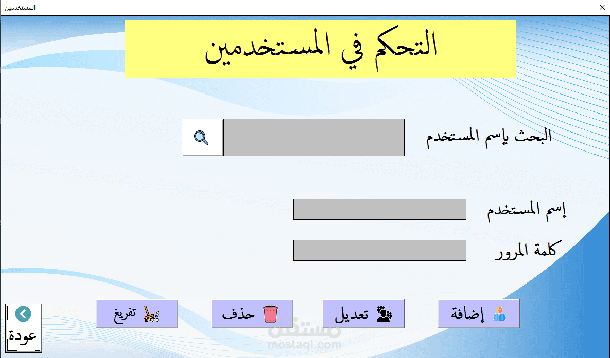 5- سهولة شاشة للتحكم في المستخدمين حيث يمكن إضافة مستخدمين أو حذف أوتعديل بياناتهم سواءاً إسم المتغير أو كلمة المرور ##############