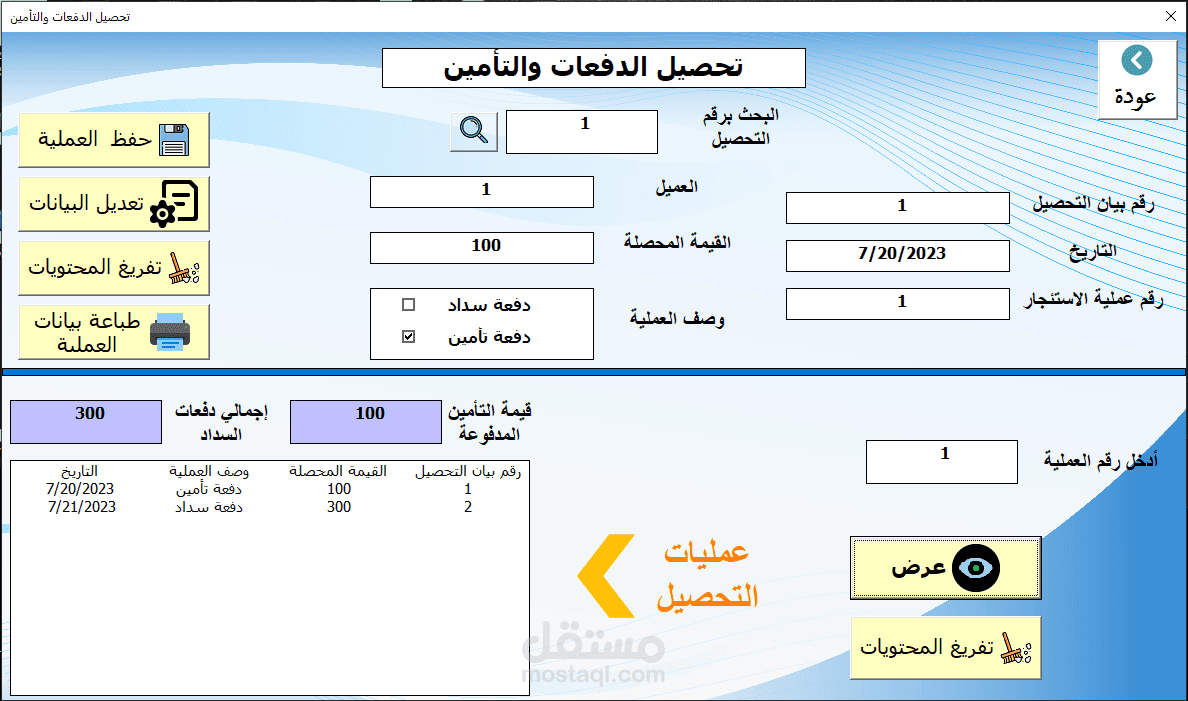 6- شاشة لتسجيل عمليات التحصيل للعمليات والعملاء المختلفة مع سهولة حفظهم وتعديلهم وطباعة إيصال بهم وكذلك سهولة عرض عمليات التحصيل المختلفة بناءاً علي رقم العملية