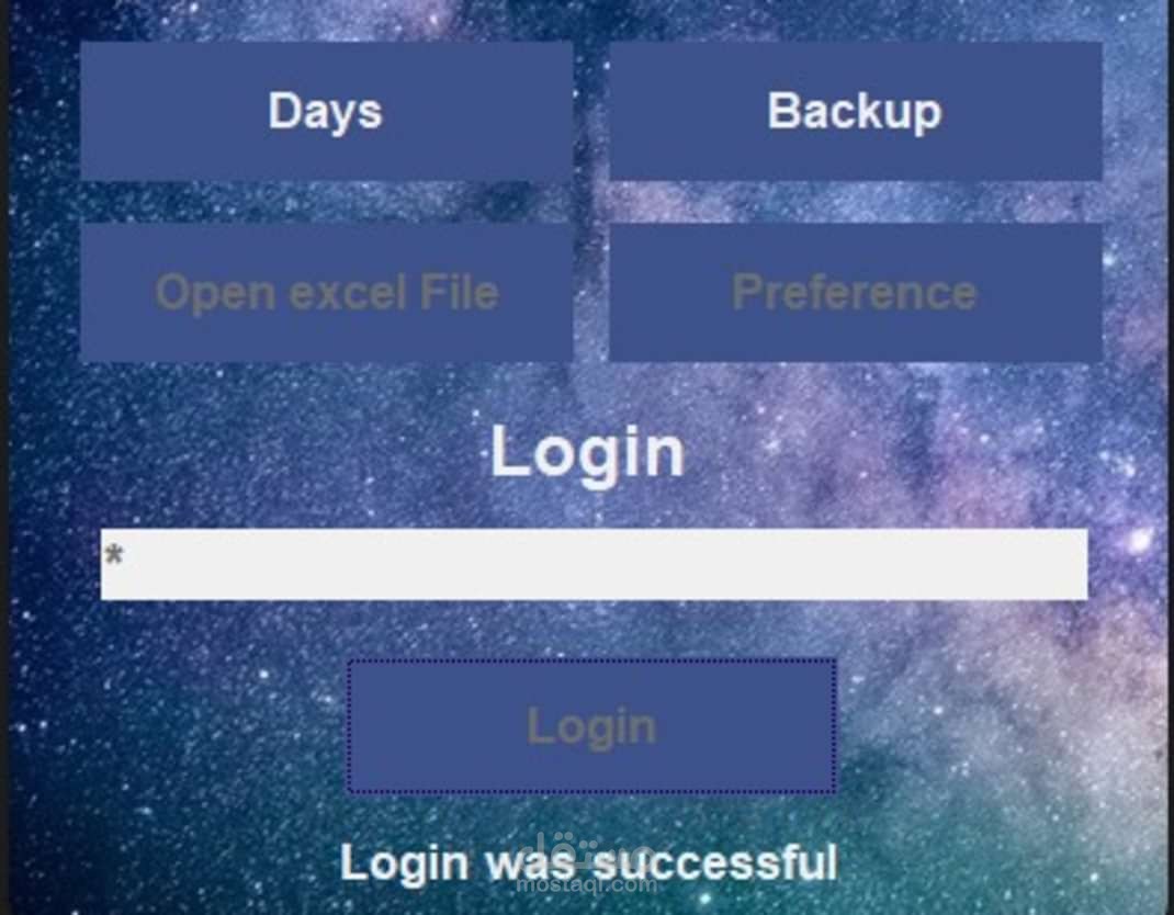 2- اول واجهة فيها نظام لتسجيل الدخول للمستخدم عشان مش اي حد يفتح البرنامج ،اول مره تفتح البرنامج هيتطلب منك تحط باسورد للادمن المسؤل عن الشغل وده بيبقي باسورد ملف الاكسل اللي فيه ال database