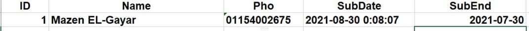 3- اول زرار هو زرار تسجيل العملاء ،بتحط اسم العميل ورقم تلفونه ومدة الاشتراك (شهر-3 شهور-6 شهور- سنة) وبتحط صورة العميل وبتدوس تسجيل وفي handle لجميع انواع ال errors اللي ممكن تحصل