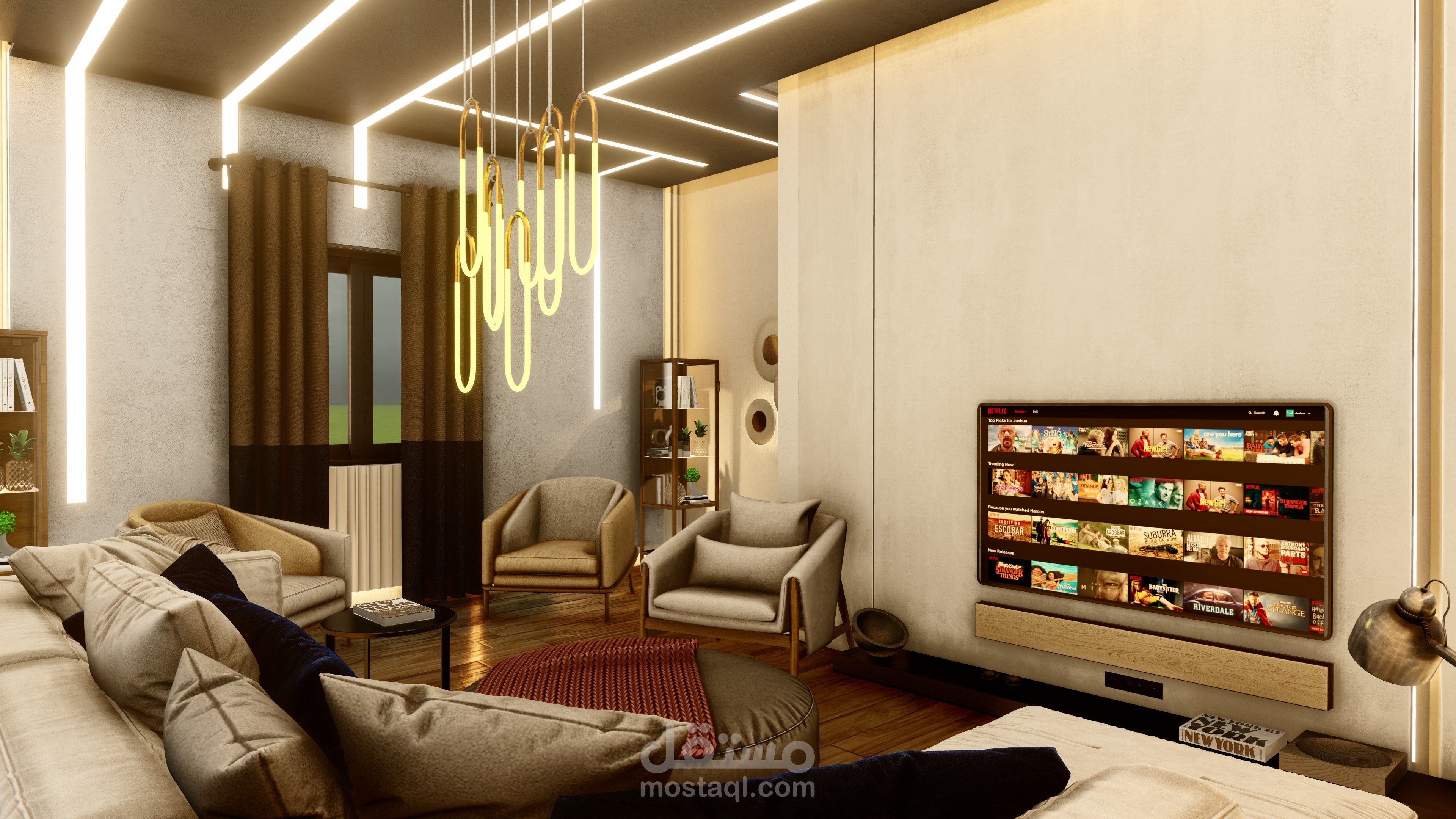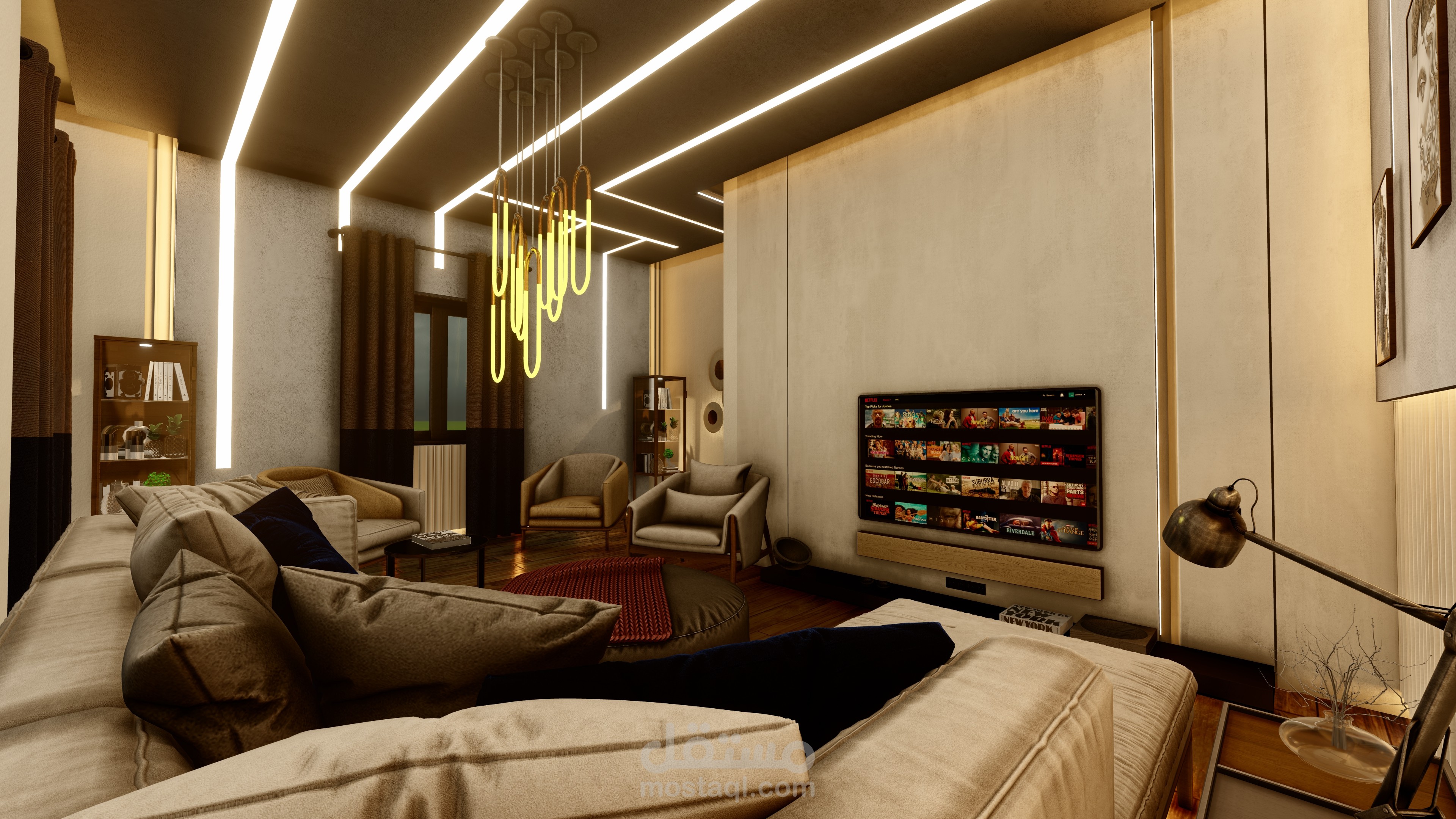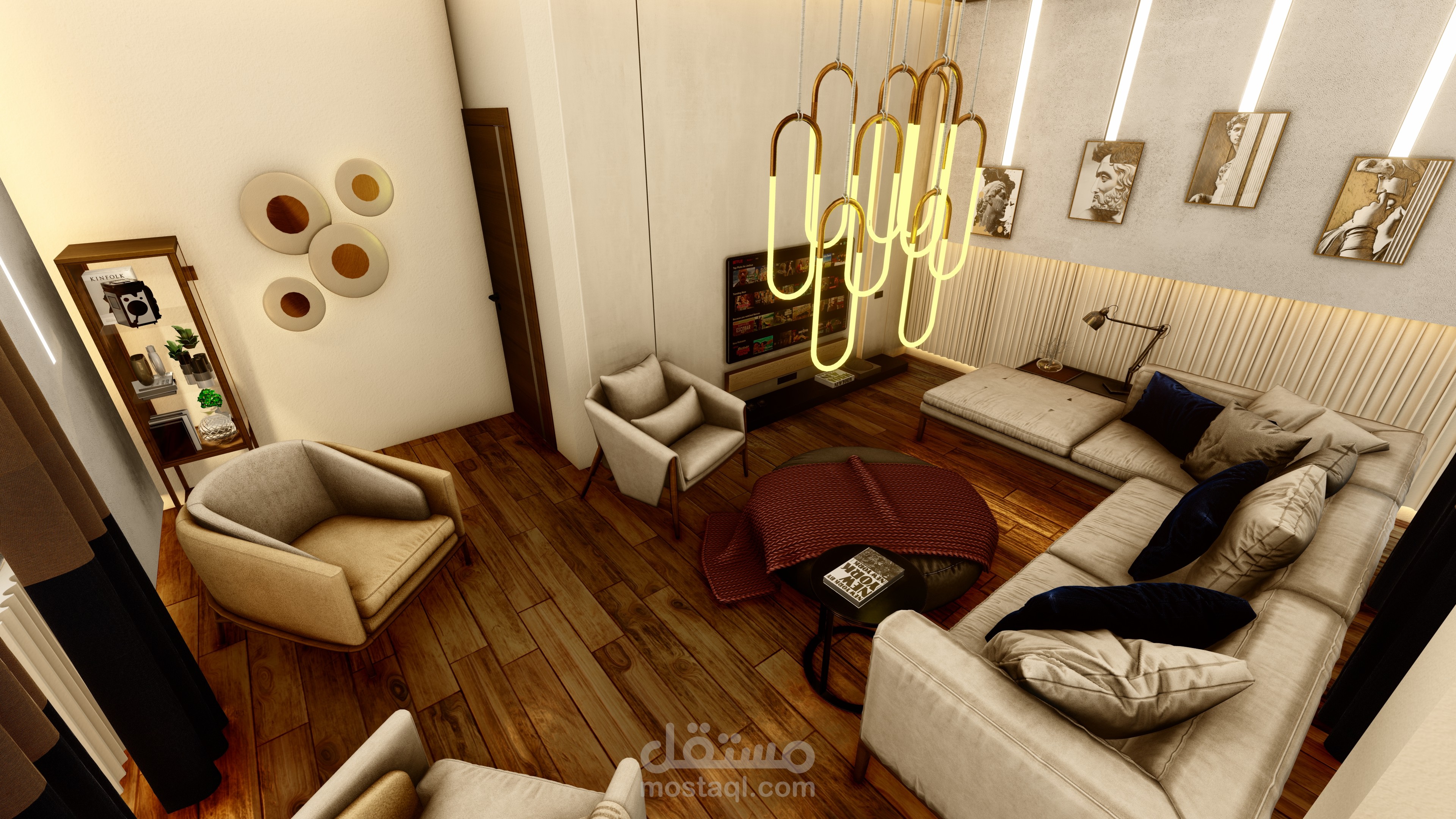 اما في غرفة المعيشة تم اختيار ارضية غرانيت على شكل الباركيه بلون غامق لكسر الالوان الفاتحة المستخدمة