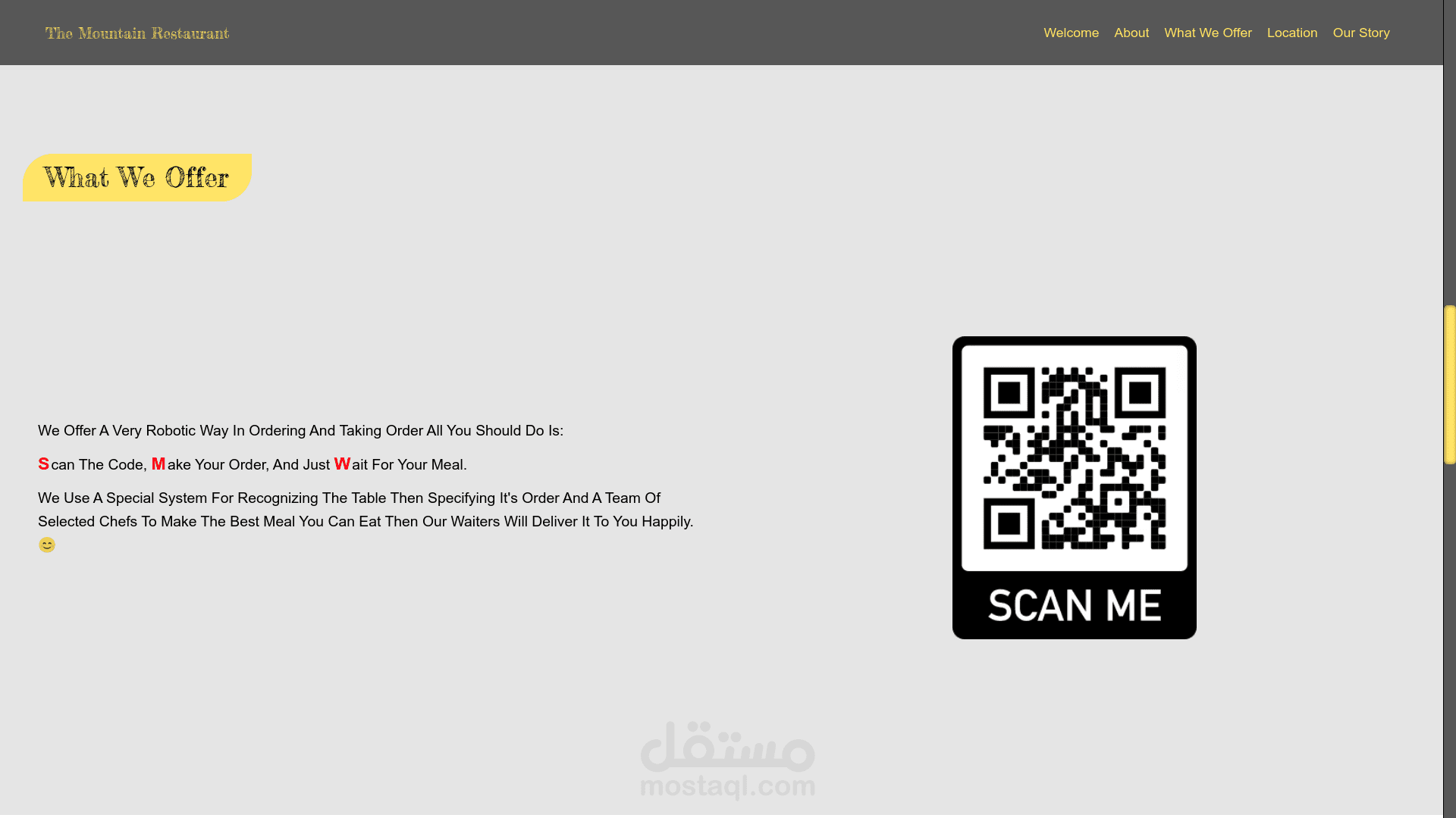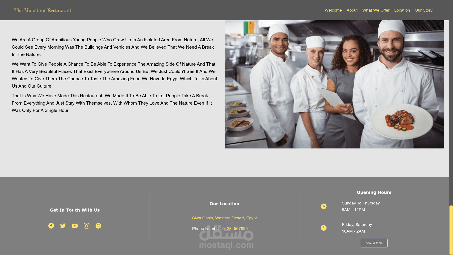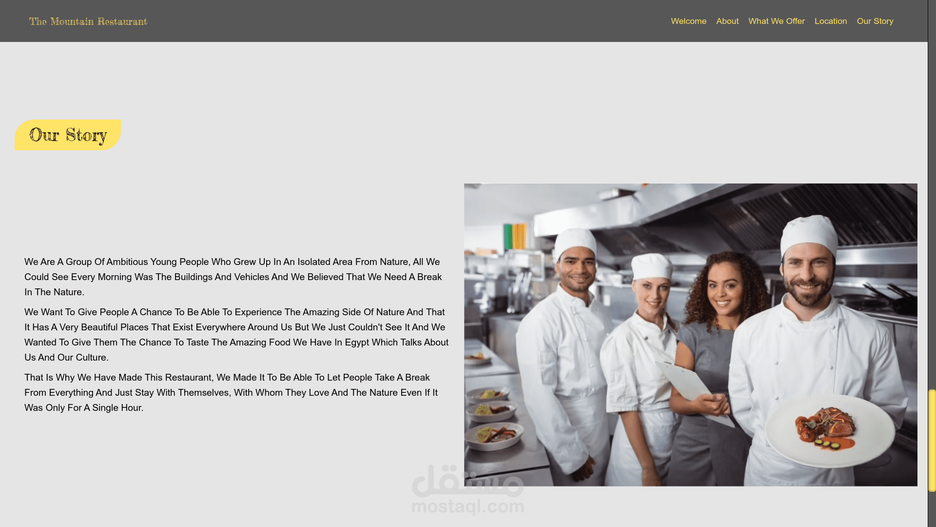الصفحة تحتوى على معلومات عن المطعم وأين يقع، وكيف يمكن للعميل طلب الاكل، والقصة الخاصة بتأسيس المطعم.