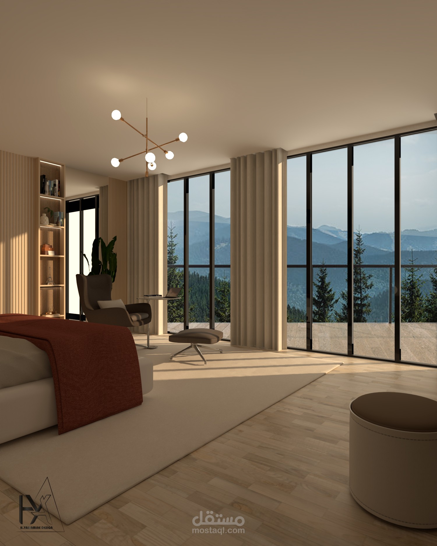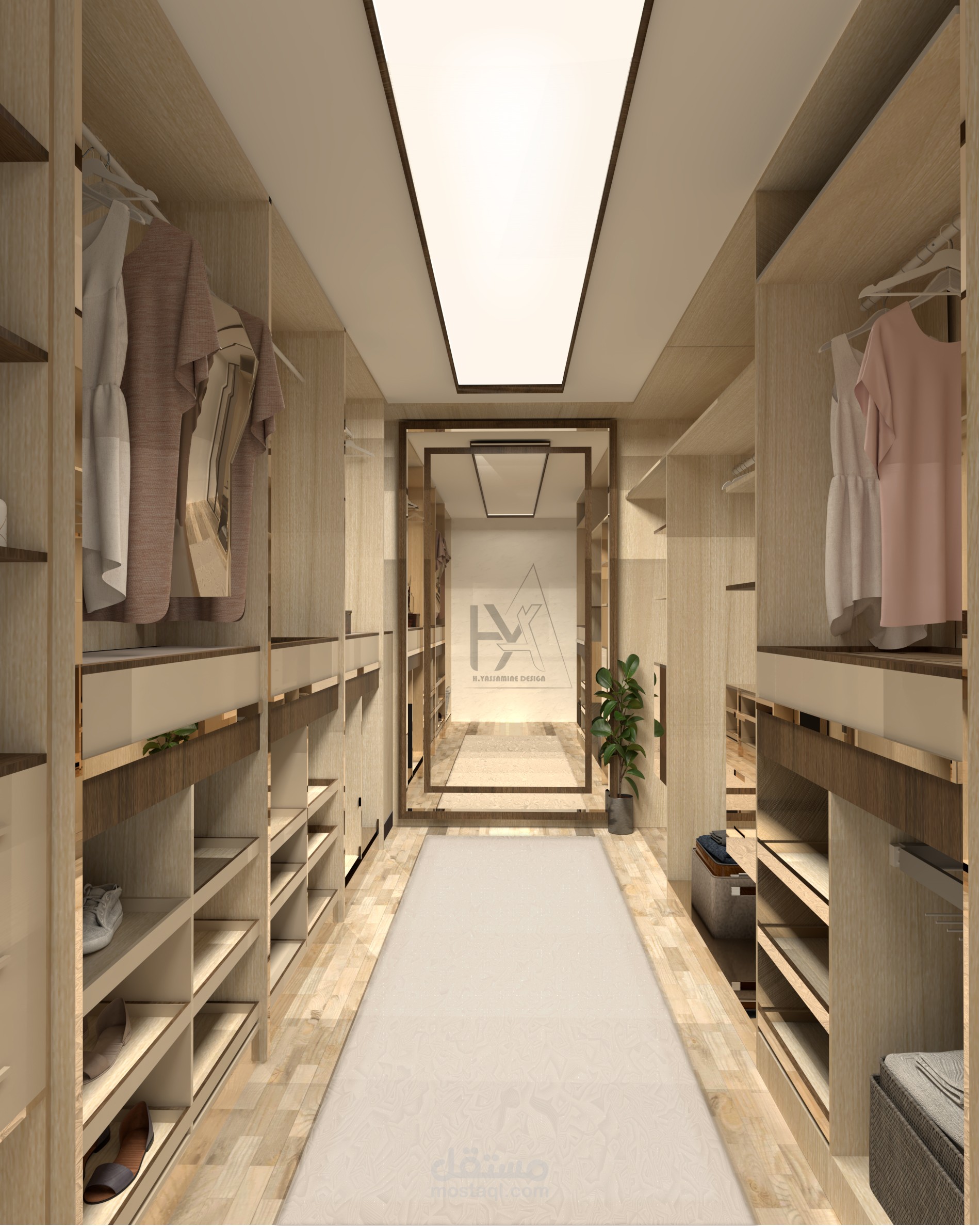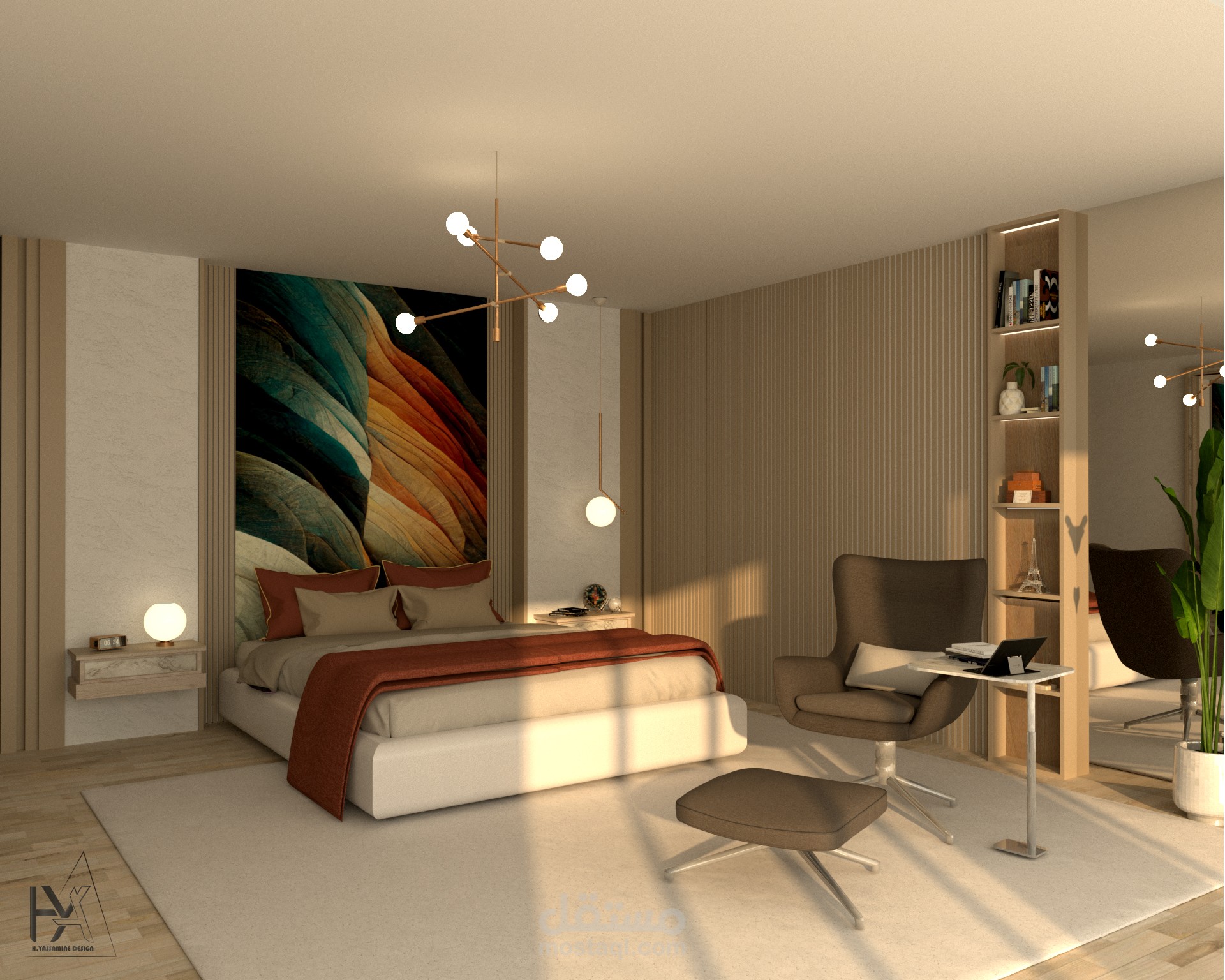 تصميم غرفة نوم ذات اطلالة جذابة مع غرفة الملابس الوان هادئة (تدرج في اون الكرام )مع لوح حائط ذاو الوان جذابة تسعاد في اختيار الفرش لمناسب للغرفة
