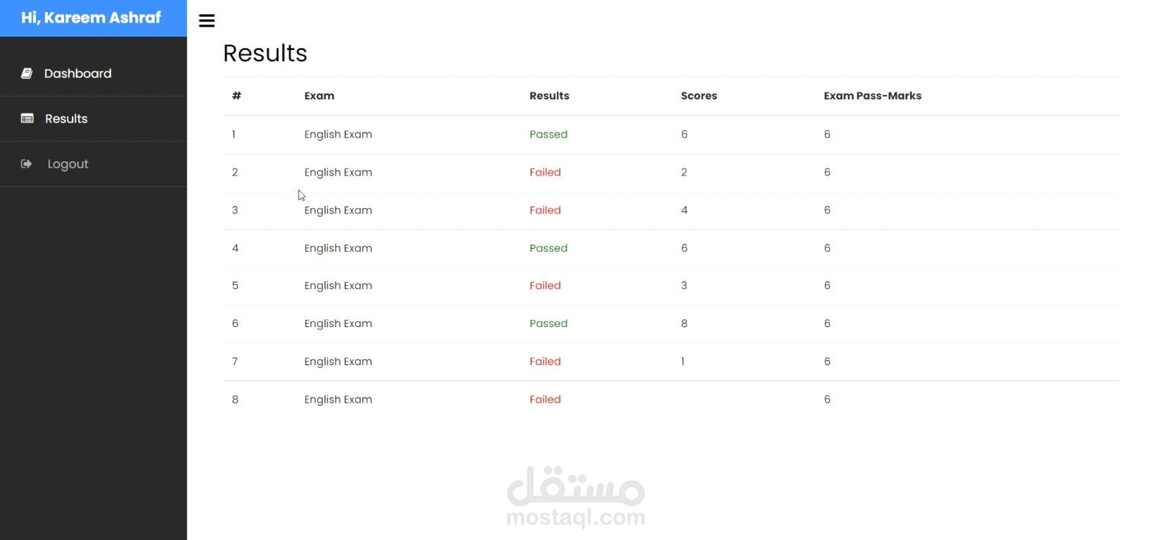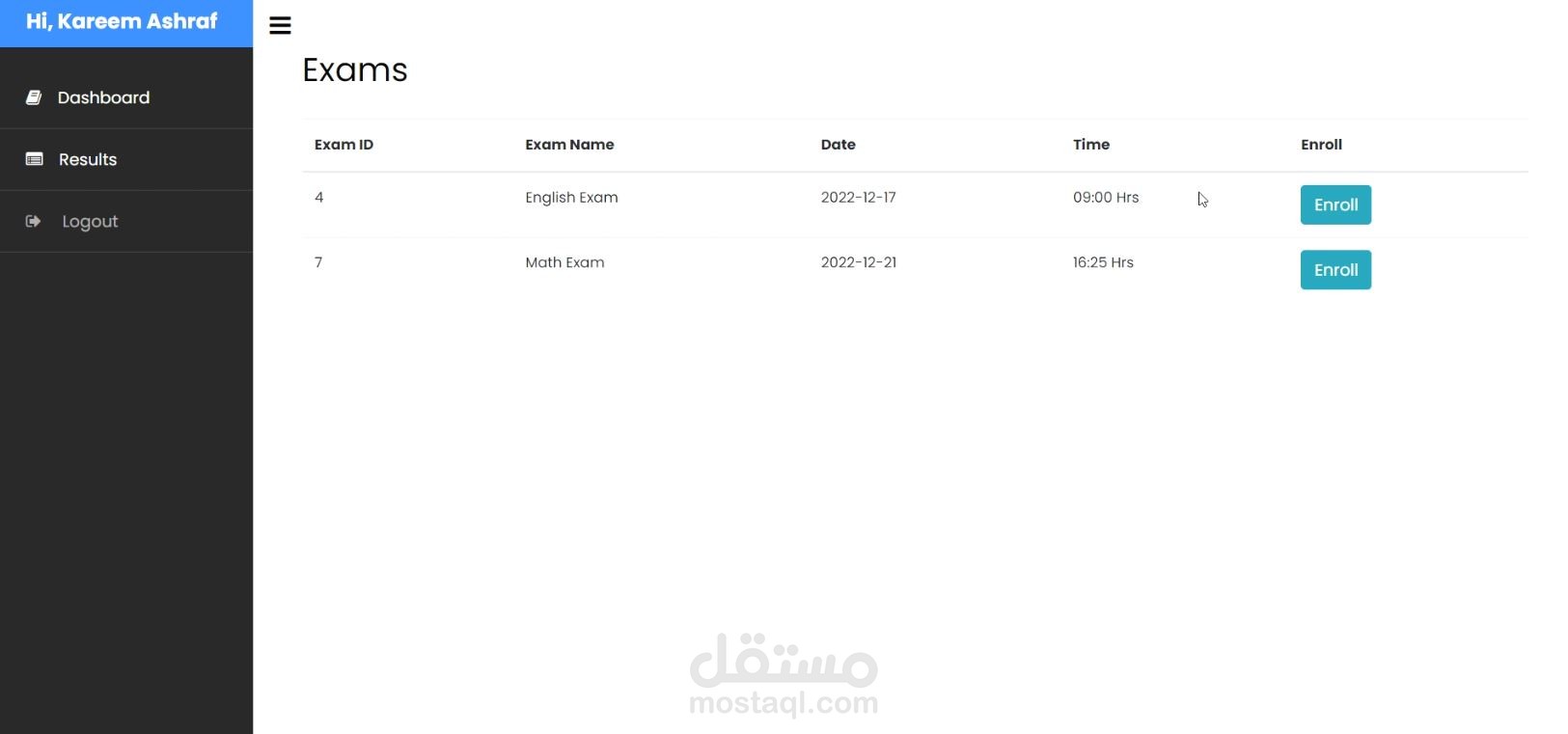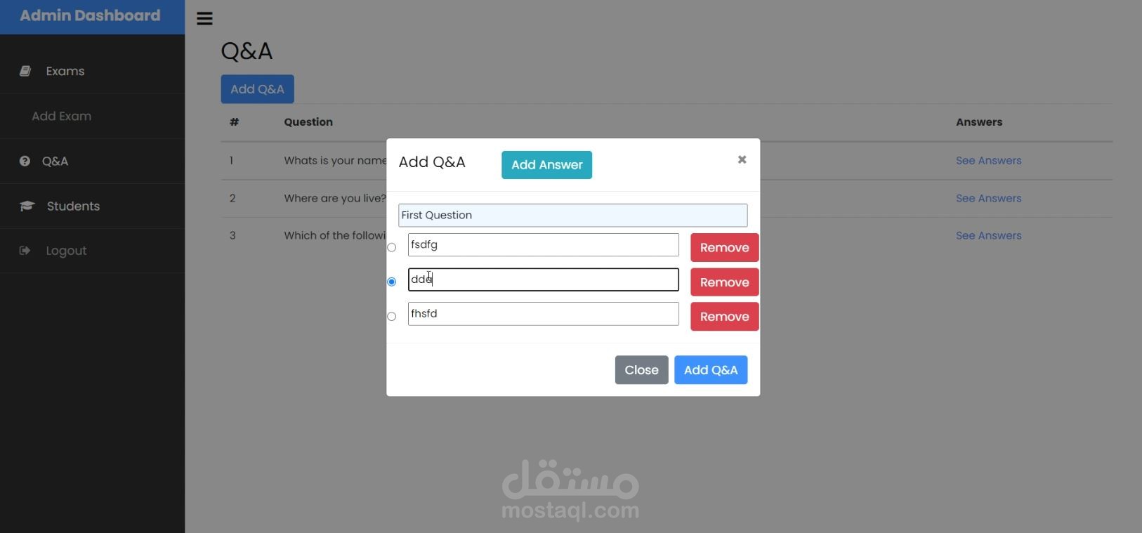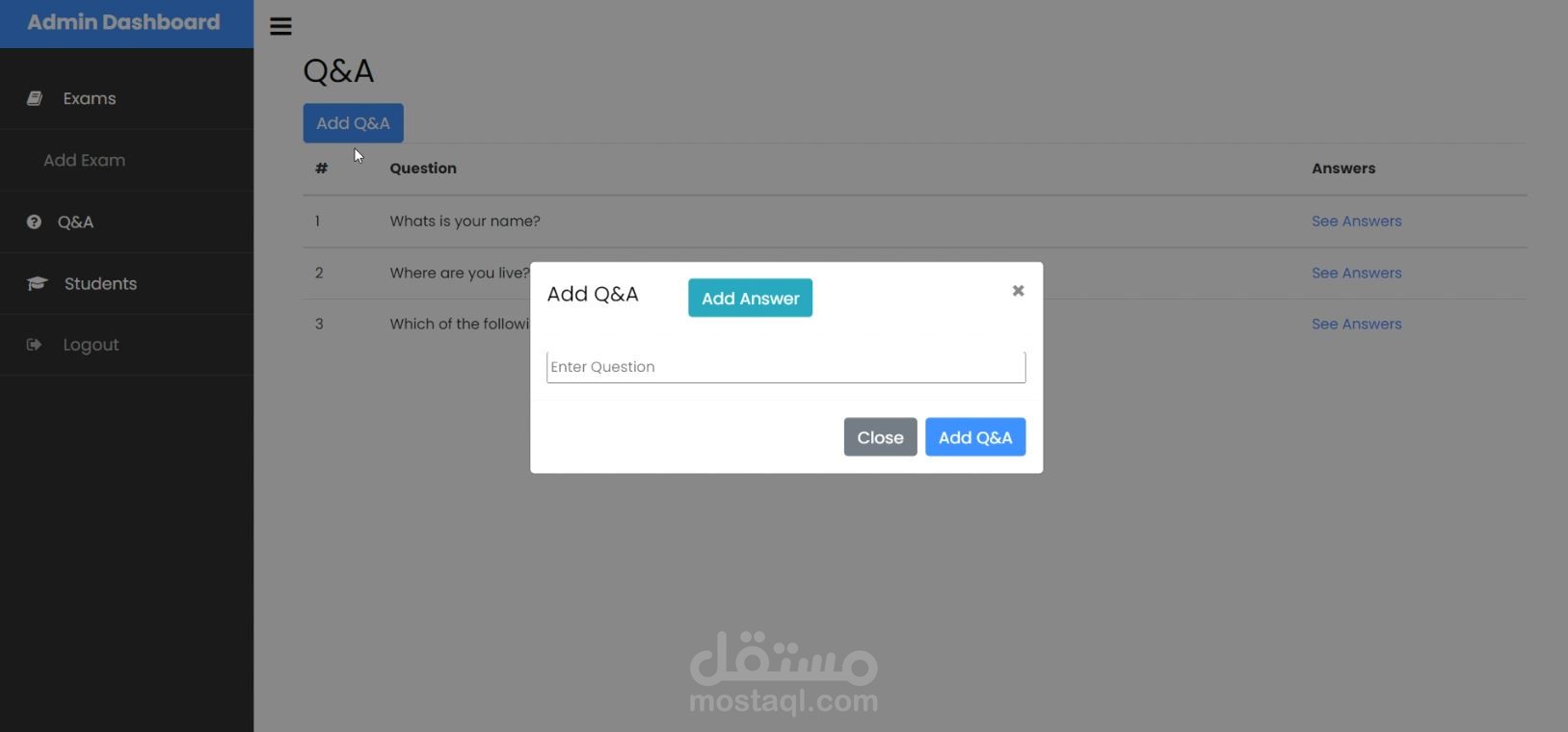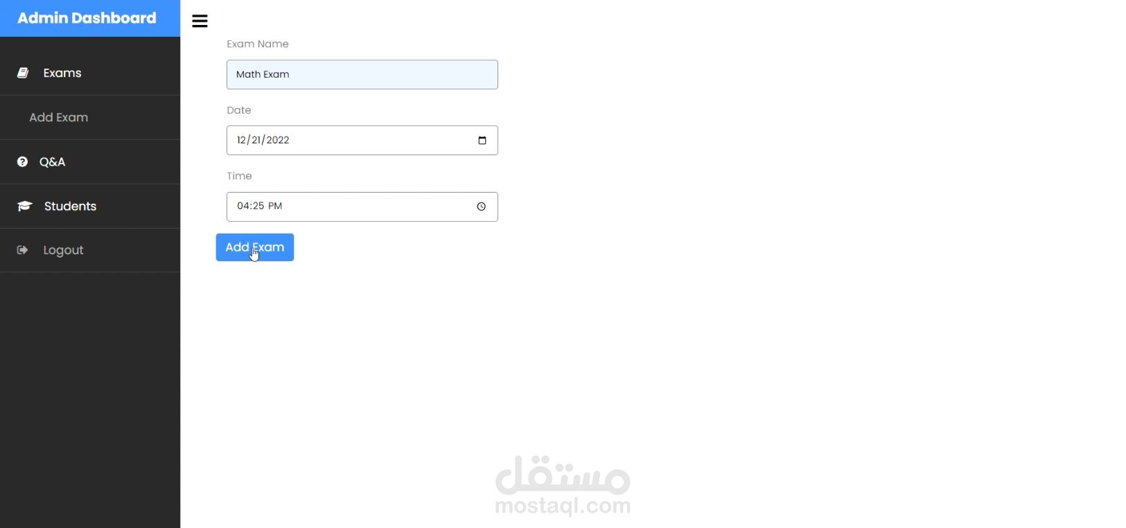 Admin can (add exams ‑ exam dashboard ‑ add exam Questions&Answers ‑ see all students).
