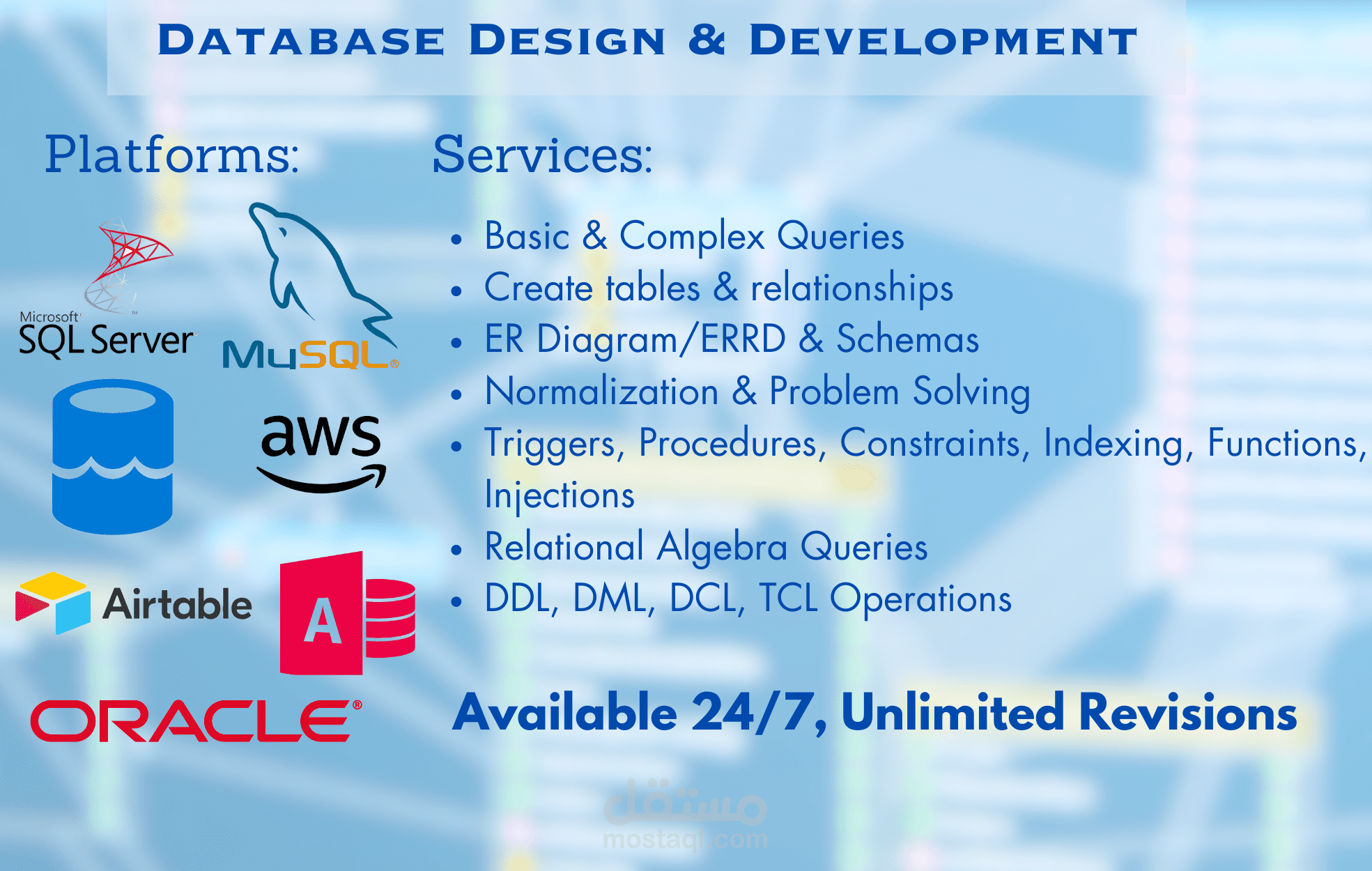 I can do any task on demand in MySQL, MS SQL, SQL Server, Oracle, Airtable, and Microsoft Access.