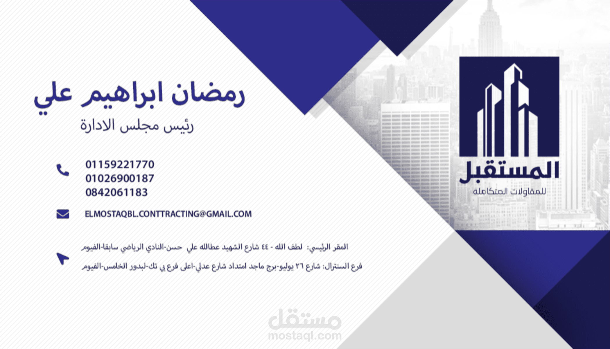 تمت تجربة التعامل مع العميل بشكل إيجابي ومنتج، ونحن فخورون بتلبية جميع احتياجاته وتوقعاته. نحن سعداء لتحقيق الهوية البصرية التي تعكس الحداثة والابتكار لشركة المستقبل للمقاولات، والتي يمكن أن تعزز مكانتها في السوق وتجذب المزيد من العملاء المستهدفين.