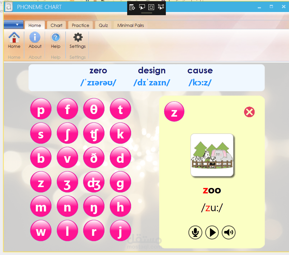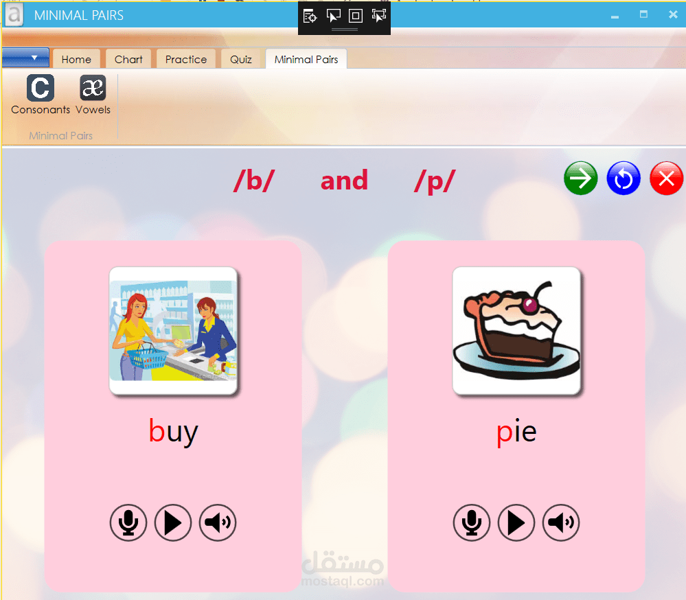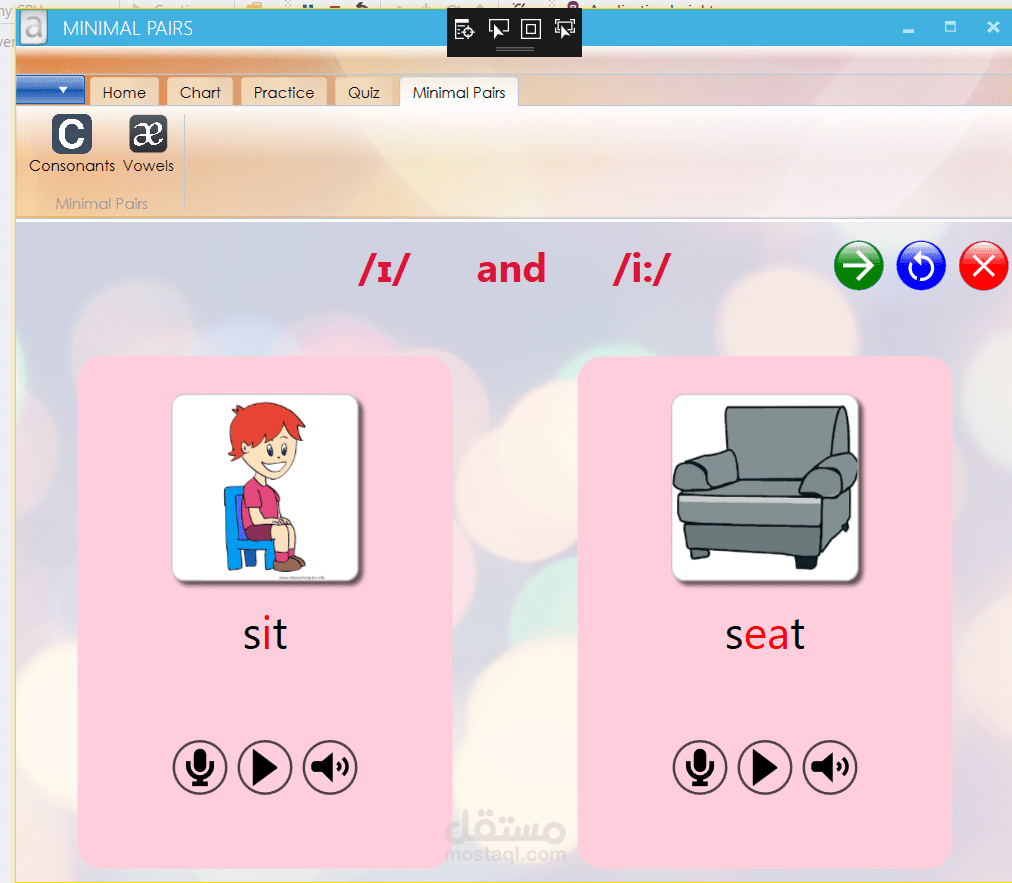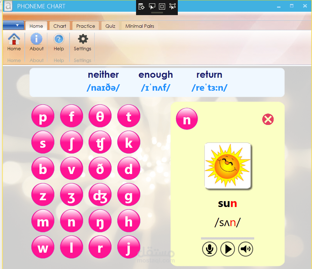 برنامج تعليم نطق الأصوات الانجليزية, من خلال عرض الأصوات وأمثلة من الكلمات التي توضح الصوت