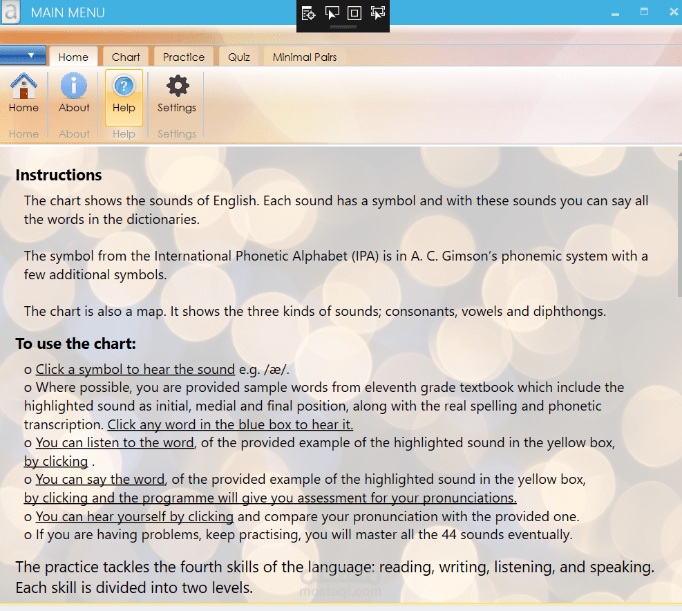 من خلال عدة مراحل تدريبية مع تصحيح للأخطاء, و يمكن للمستخدم التأكد من مهاراته ومدى استفادته من البرنامج من خلال الاختبارات المضافة لكل مهارة .
