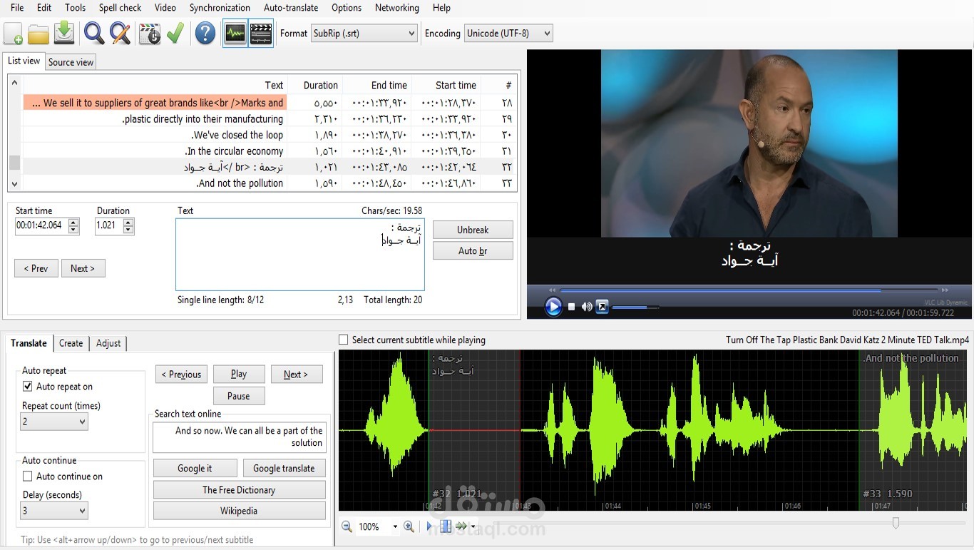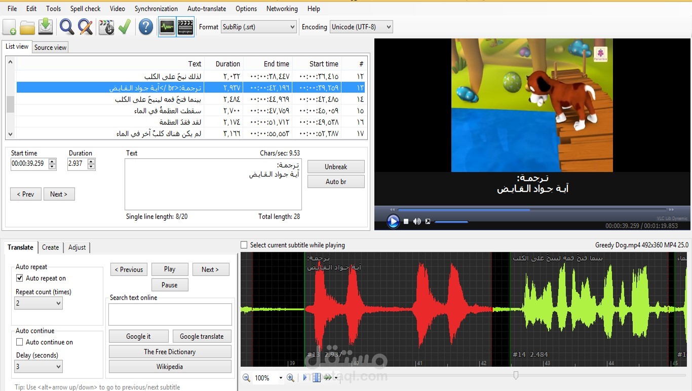 4- اضافة الترجمة على برنامج subtitle edit لتدقيق الثواني لتفادي أي خلل في الترجمة المرئية
