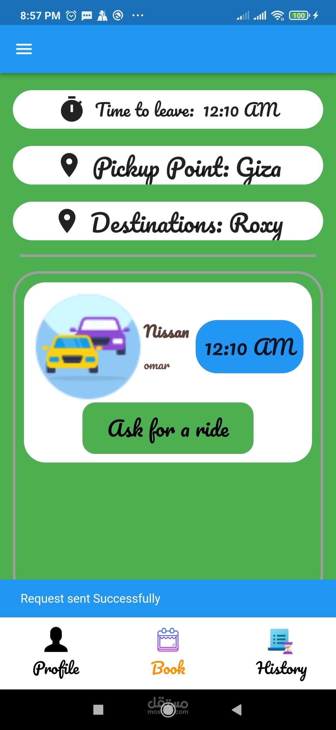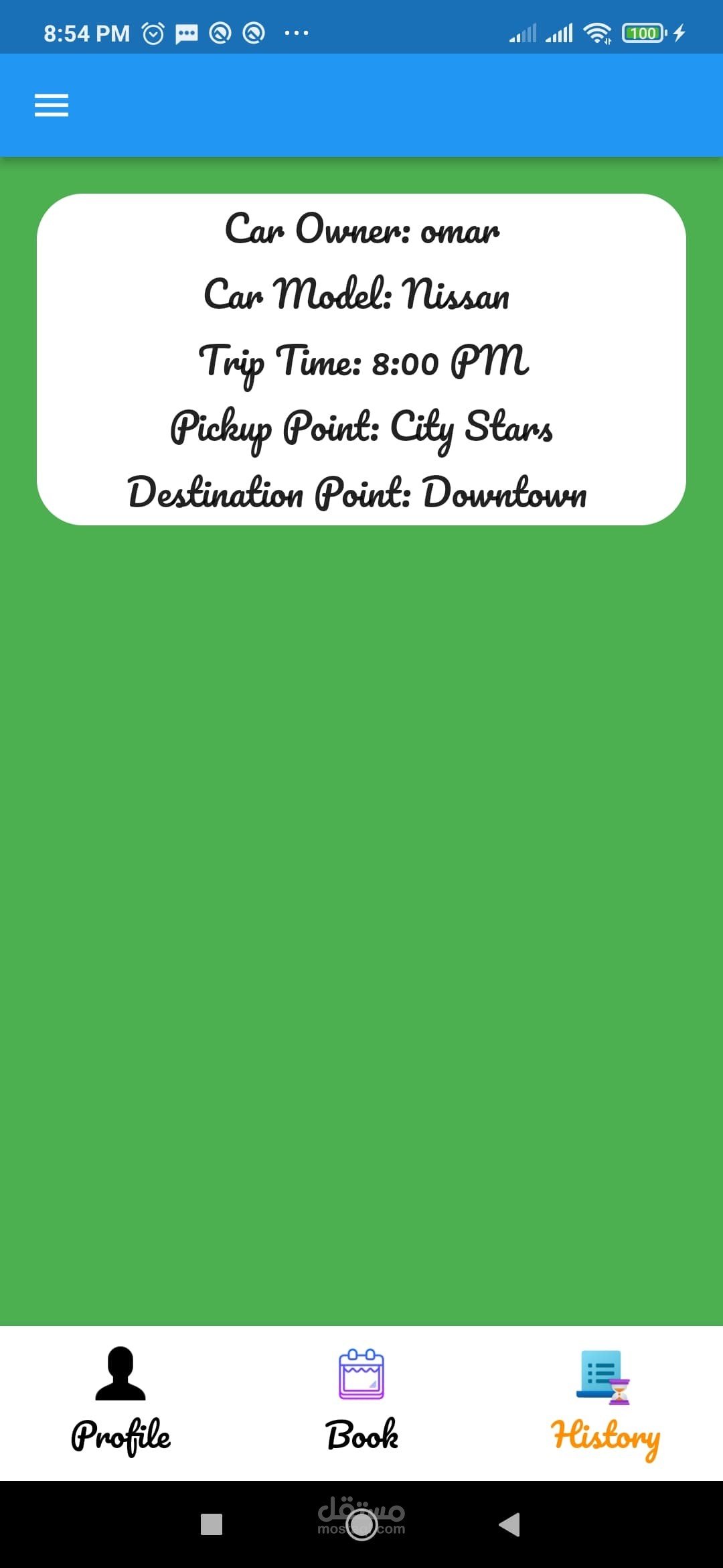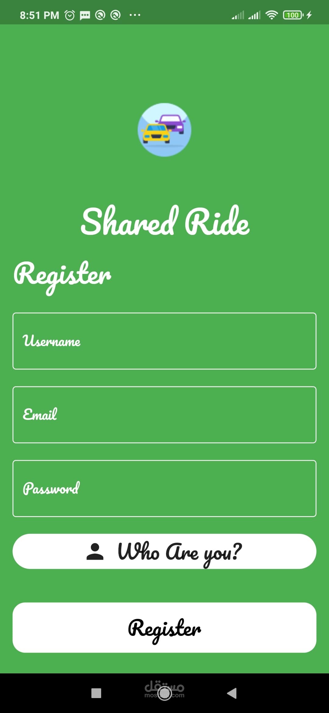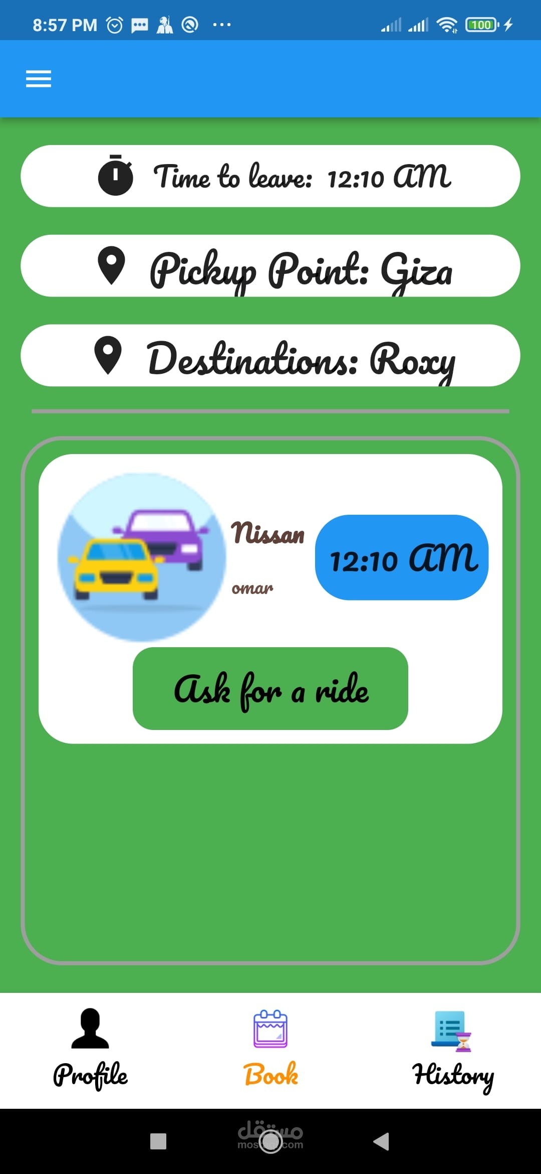 تطبيق يشبة تطبيق uber حيث يقوم الزبون بادخال مكان الرحلة و التوقيت و من ثم يظهر له السائقين المتاحين.