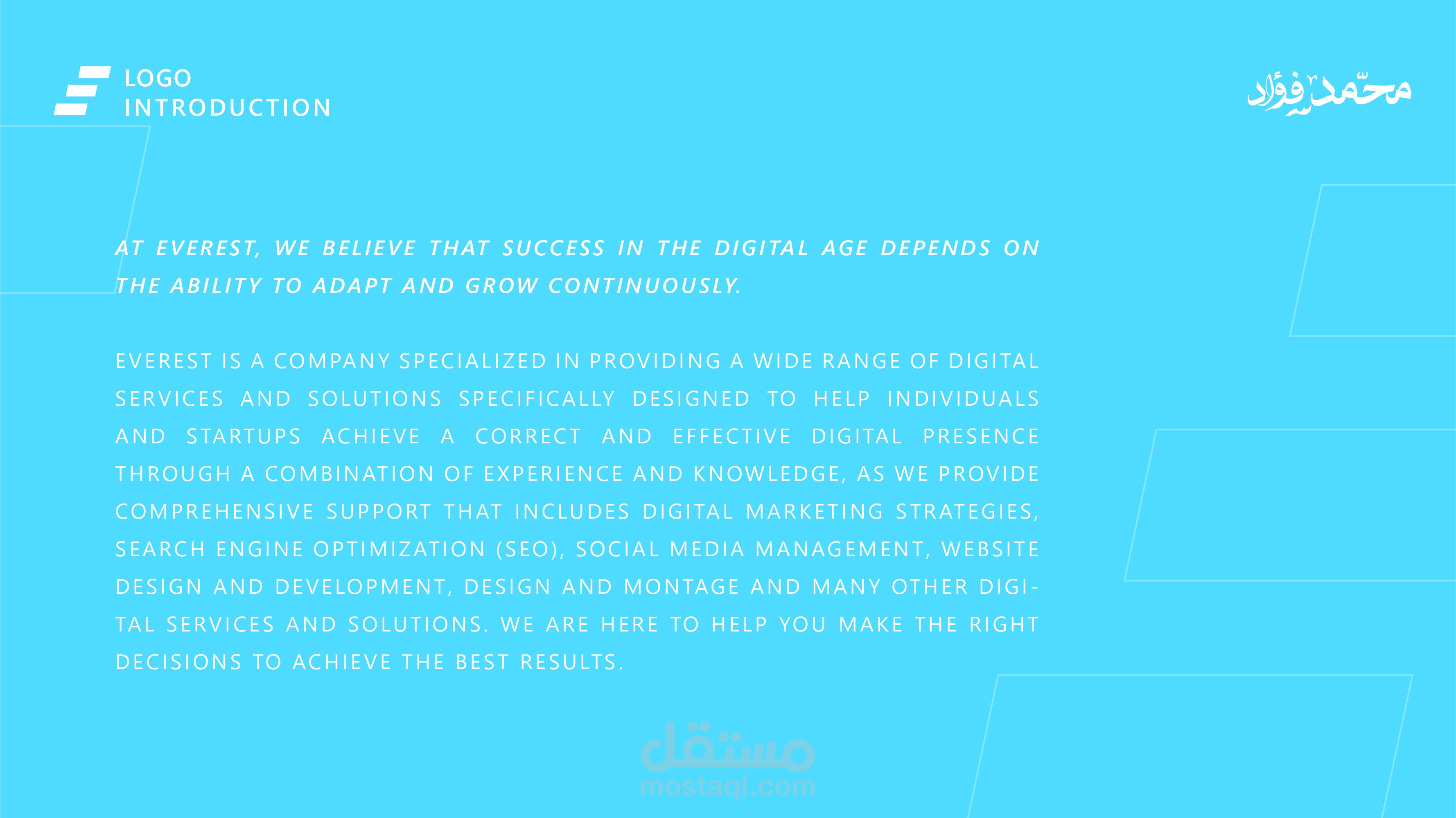 افرست هي شركة متخصصة في تقديم مجموعة واسعة من الخدمات والحلول الرقمية المصممة خصيصاً لمساعدة الأفراد والشركات الناشئة على تحقيق تواجد رقمي صحيح وفعال وذلك من خلال مزيج من الخبرة والمعرفة، حيث نقدم دعماً شاملاً يتضمن استراتيجيات التسويق الرقمي، تحسين محركات البحث SEO )، إدارة وسائل التواصل الاجتماعي، وتصميم وتطوير المواقع الإلكترونية، التصميم والمونتاج والعديد من الخدمات والحلول الرقمية. نحن هنا لمساعدتك في اتخاذ القرارات الصحيحة لتحقيق أفضل النتائج ).