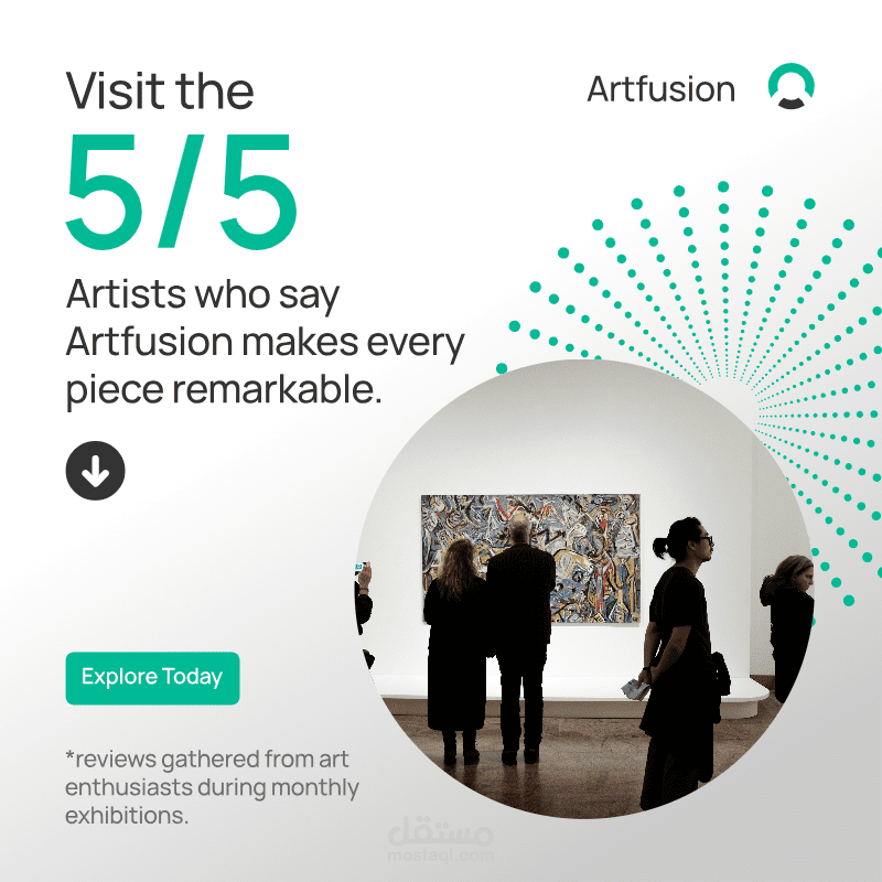 تصميم عصري وإعلاني لمعرض فنّي، مع صورة دائرية تُظهر الزوار يتأملون عملاً فنياً. النص التسويقي واضح، مع استخدام الألوان الخضراء والبنفسجية بطريقة مدروسة، مما يعطي لمسة حديثة ومُريحة بصرياً.