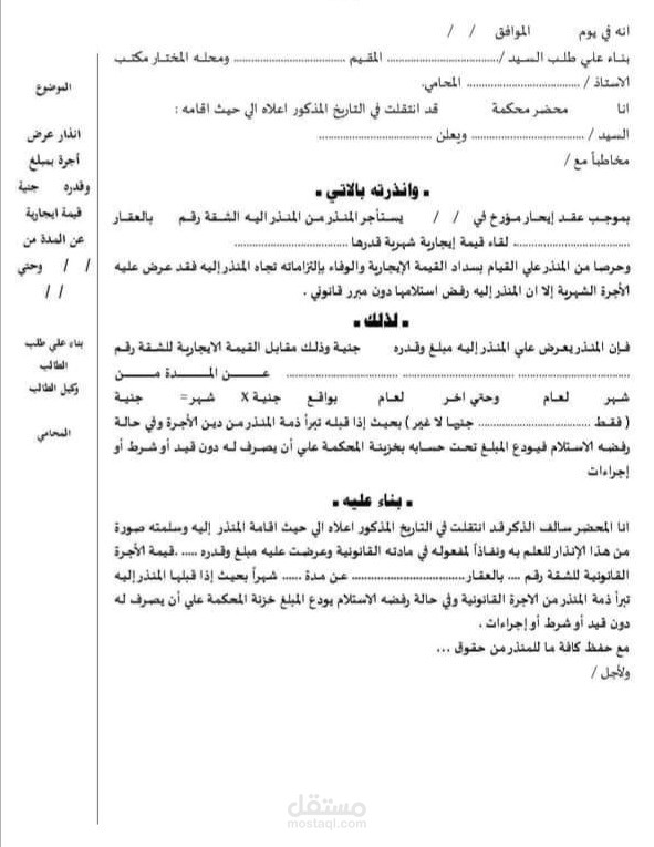 هذة صيغة عامة لإنذار عرض الإيجار للمالك اذا امتنع عن الاجرة