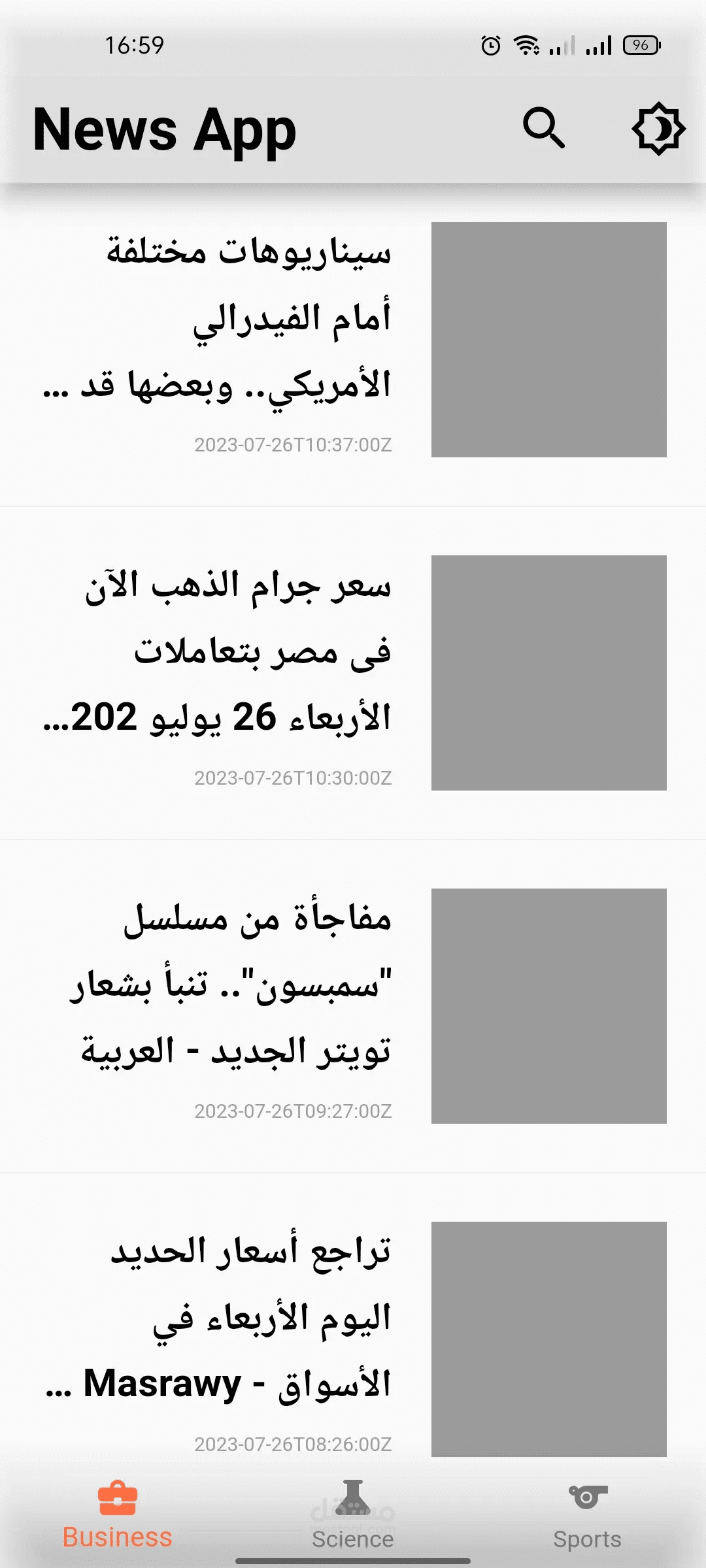 using API to get data and show it in 3 Screens Business,Science, Sports