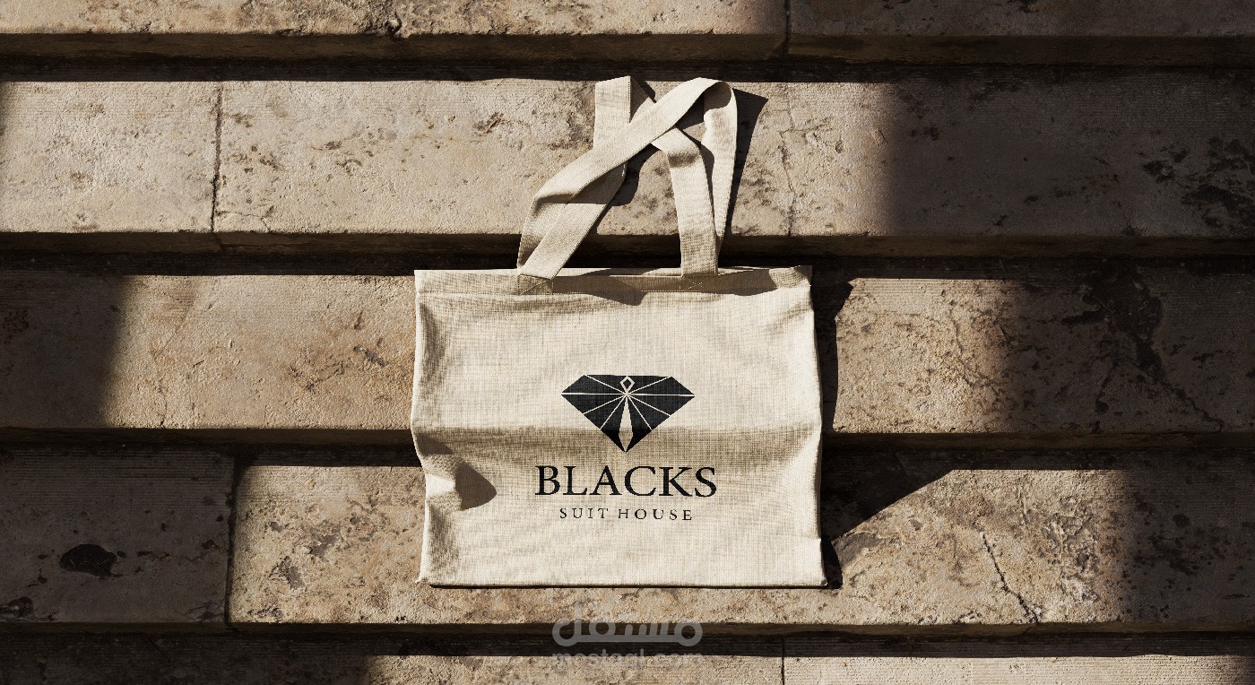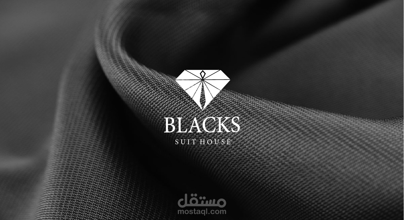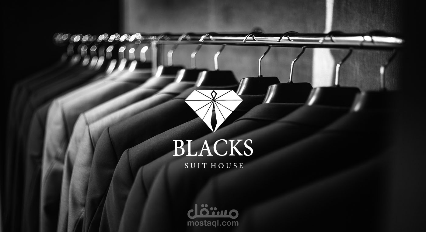 شرح الفكرة: الشعار مكون من جزئين وهما (الالماس الاسود) ، وهو يدل على الفخامة والرقي والجزء الأهم هو اللون الاسود الذي يشكل اسم الهوية (Blacks) ، أما الجزء الثاني وهي (الكرفتة) وهي تشمل جزء من الجوهرى وهذا يدل علي منتج المتجر وهي (البدلة).
