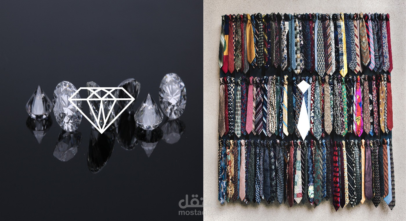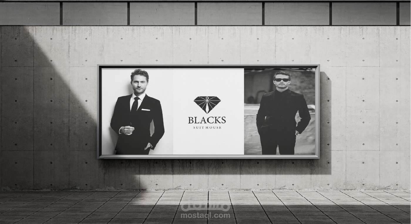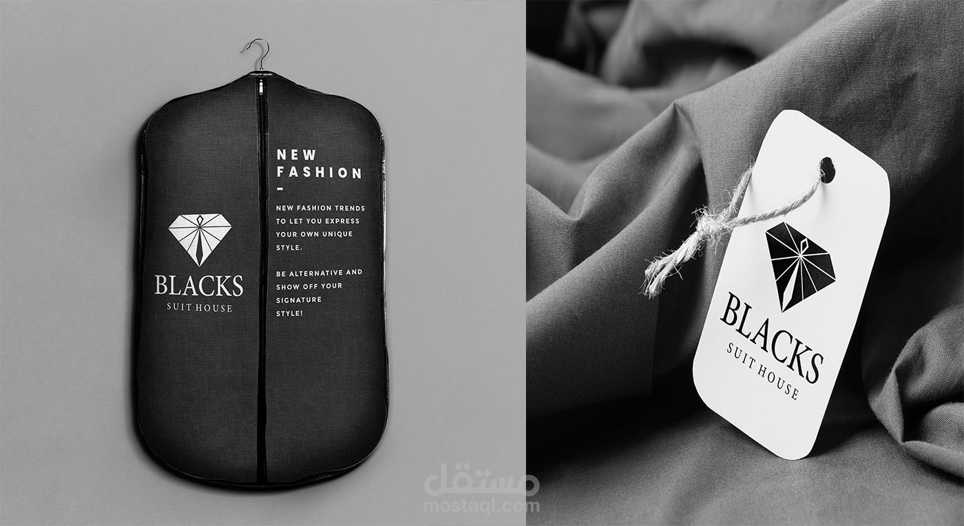 شرح الفكرة: الشعار مكون من جزئين وهما (الالماس الاسود) ، وهو يدل على الفخامة والرقي والجزء الأهم هو اللون الاسود الذي يشكل اسم الهوية (Blacks) ، أما الجزء الثاني وهي (الكرفتة) وهي تشمل جزء من الجوهرى وهذا يدل علي منتج المتجر وهي (البدلة).