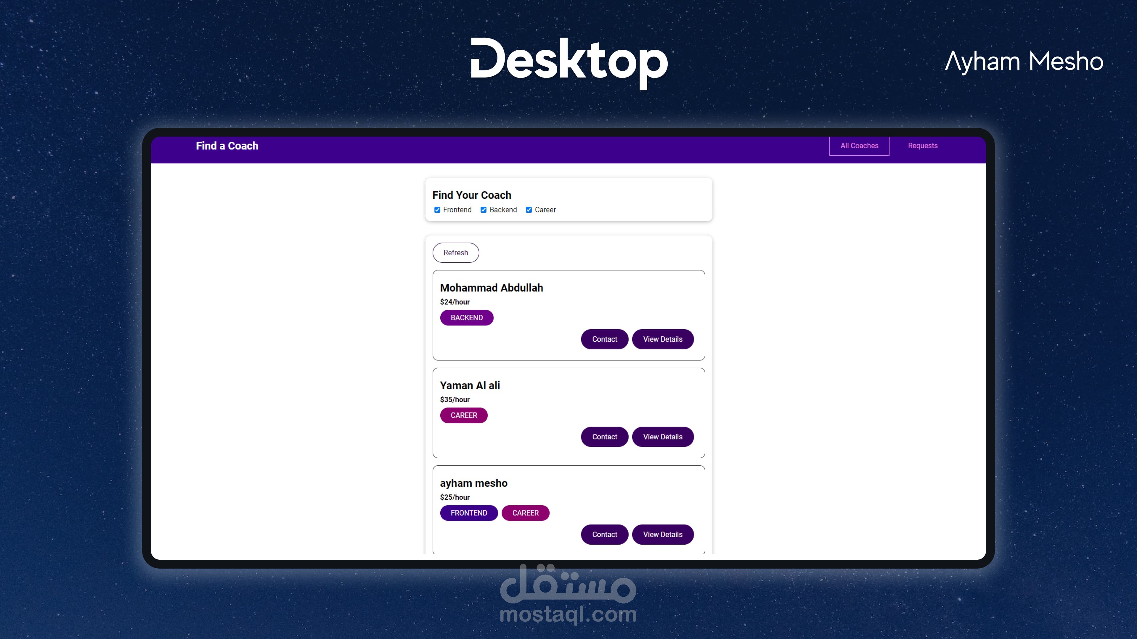 يتعلق المشروع بإنشاء منصة تجمع بين المدربين والمتدربين في مكان واحد، لتسهيل العثور على المدرب المثالي لك وبدء رحلتك التدريبية.
