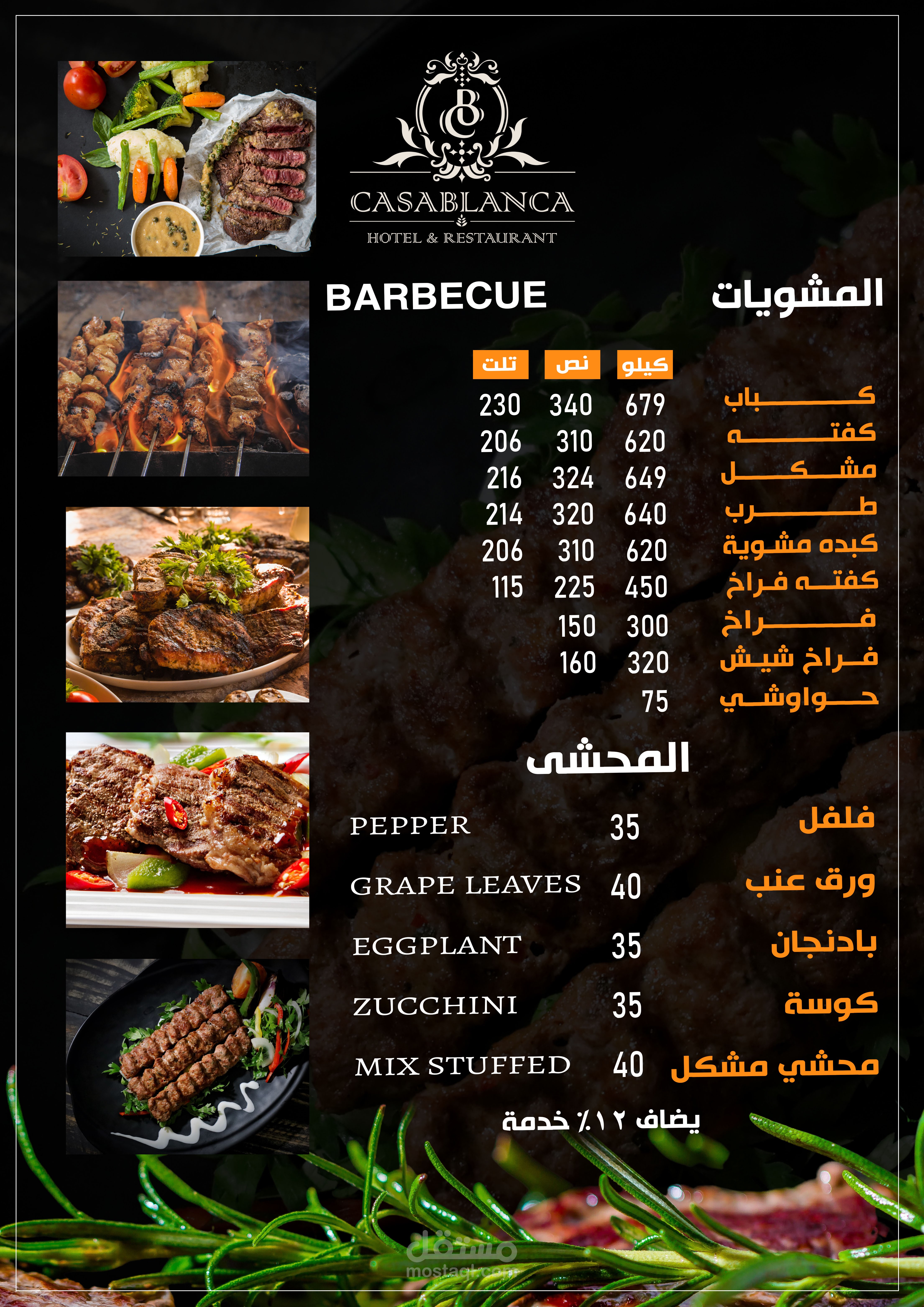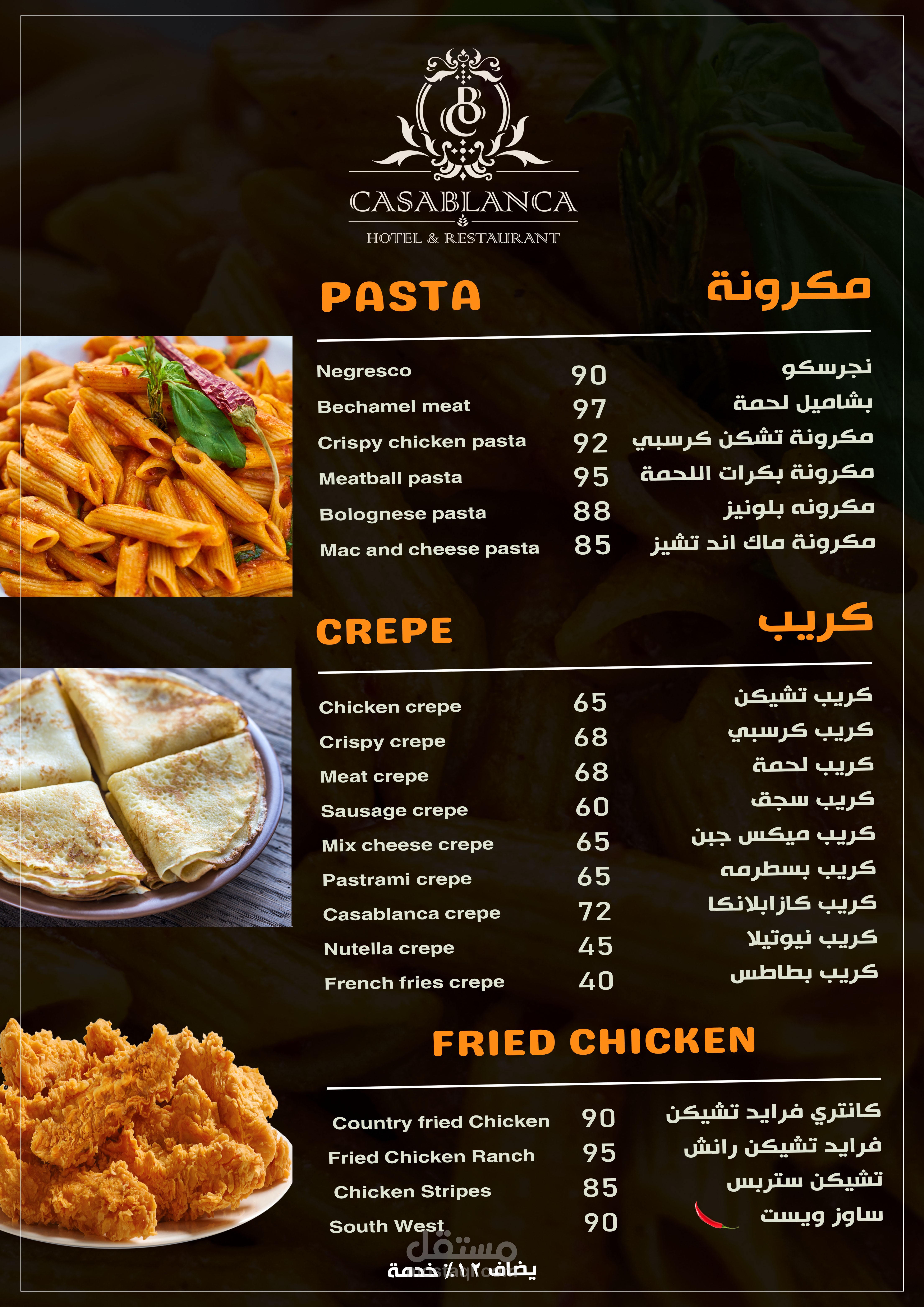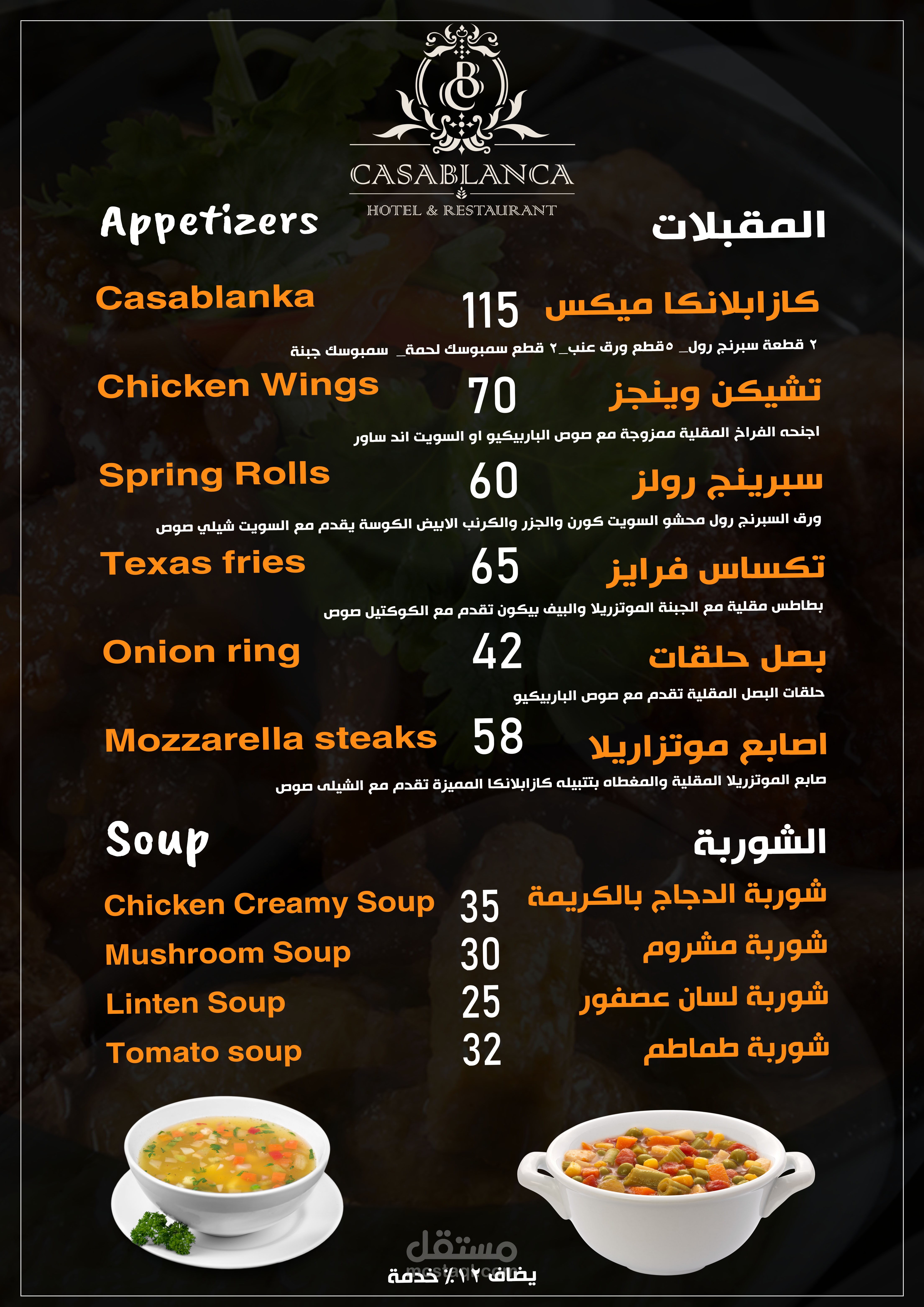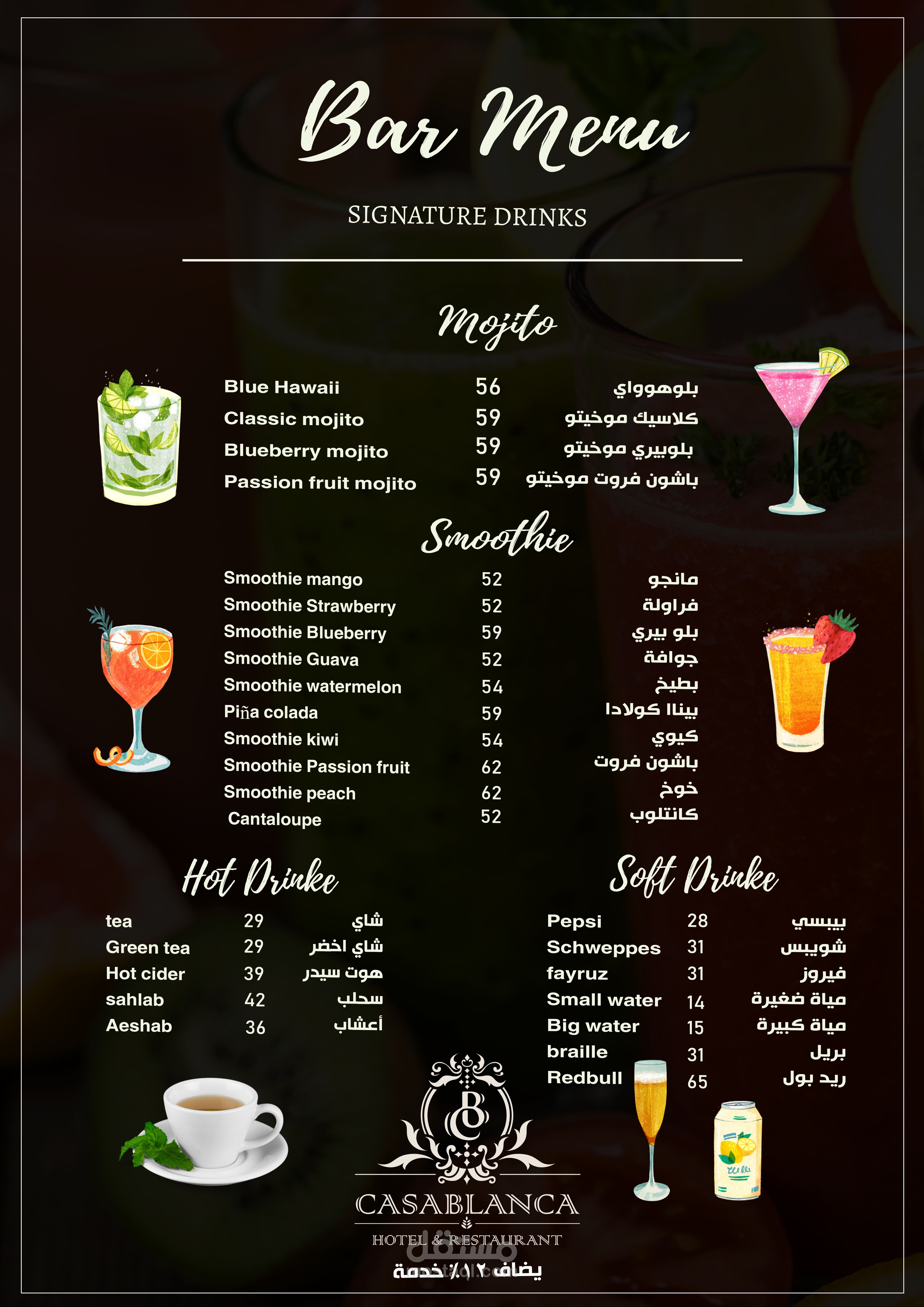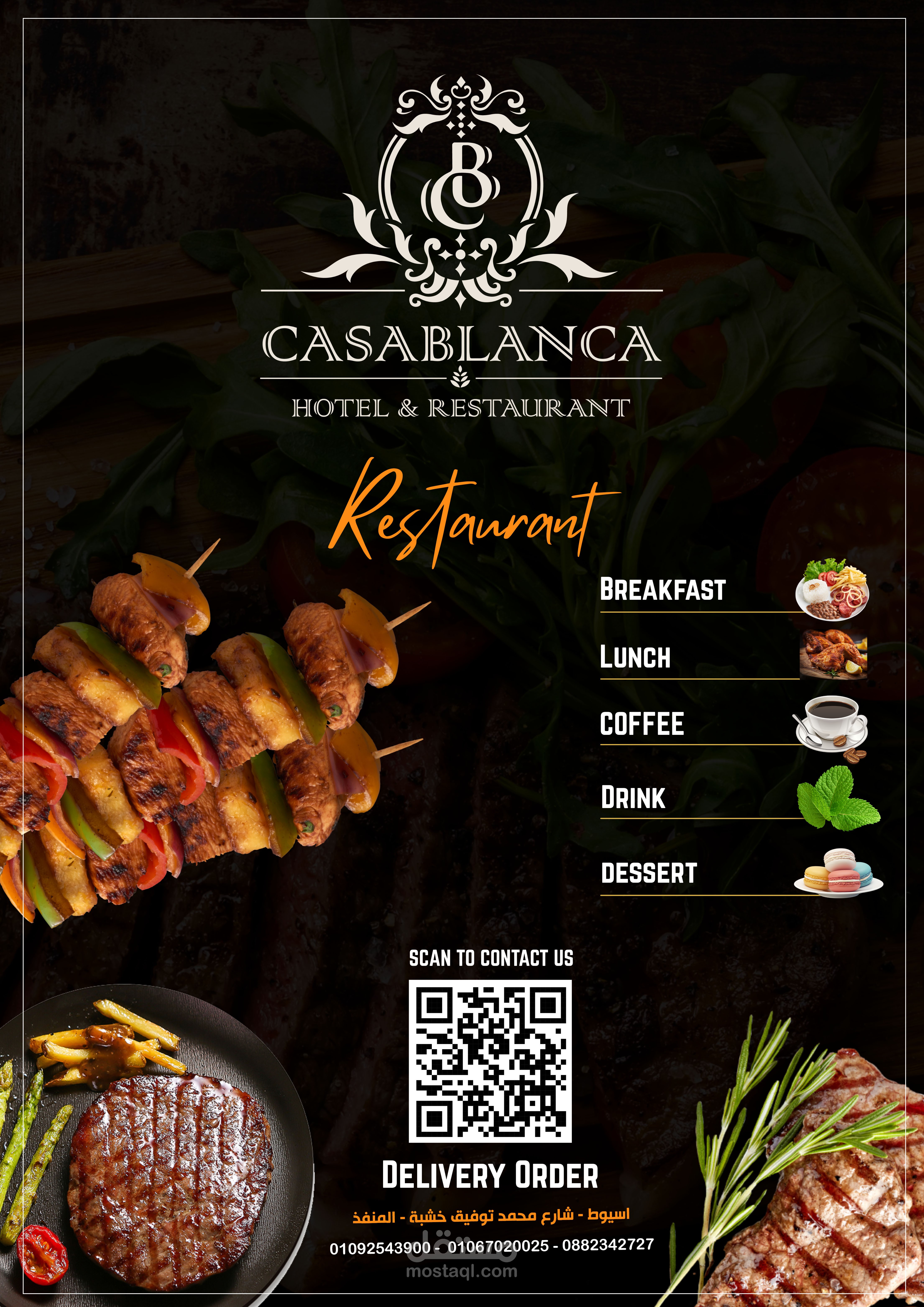 العمل عبارة عن منيو بنظام الكتيب 20 صفحة تشمل كل الاقسام والاصناف الموجودة بالمطعم تم مراعاة الاوان الخاصة بالفندق تم تنفيذ العمل باستخدام الفوتوشوب وتم طباعته وسلفنته بسلفان مط ليتناسب مع الوان التصميم وتم تسليم العمل ولاقي قبول الجميع