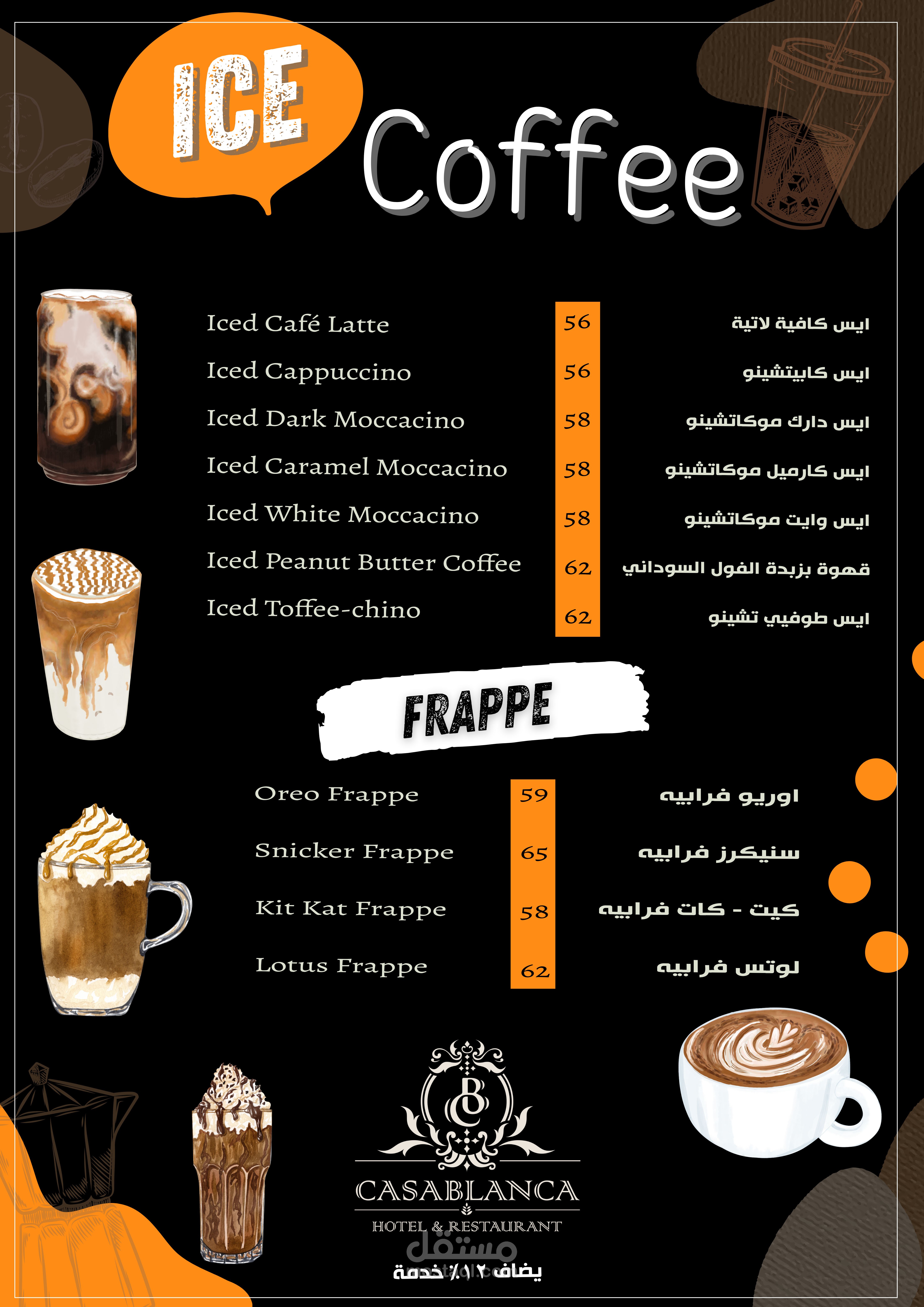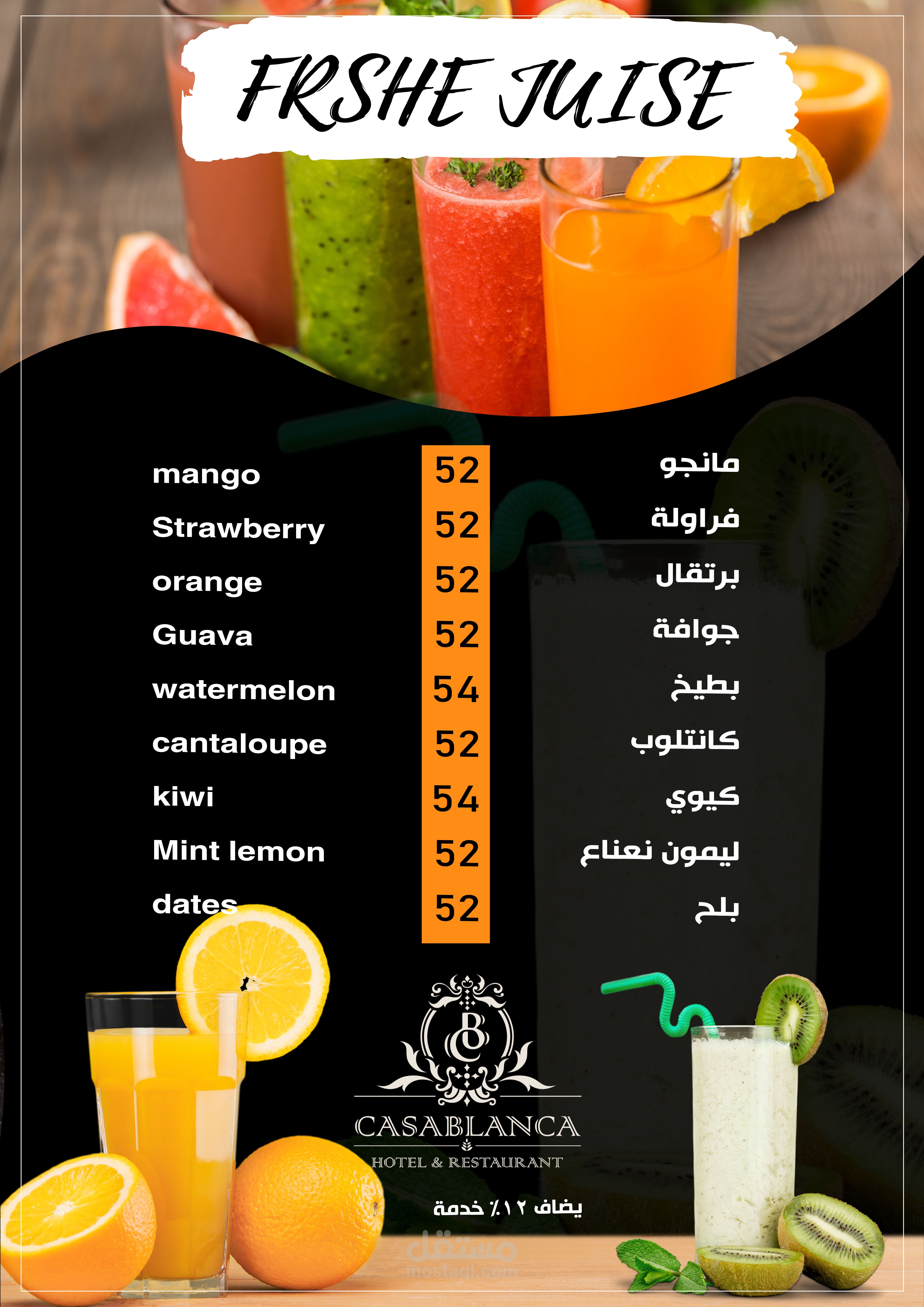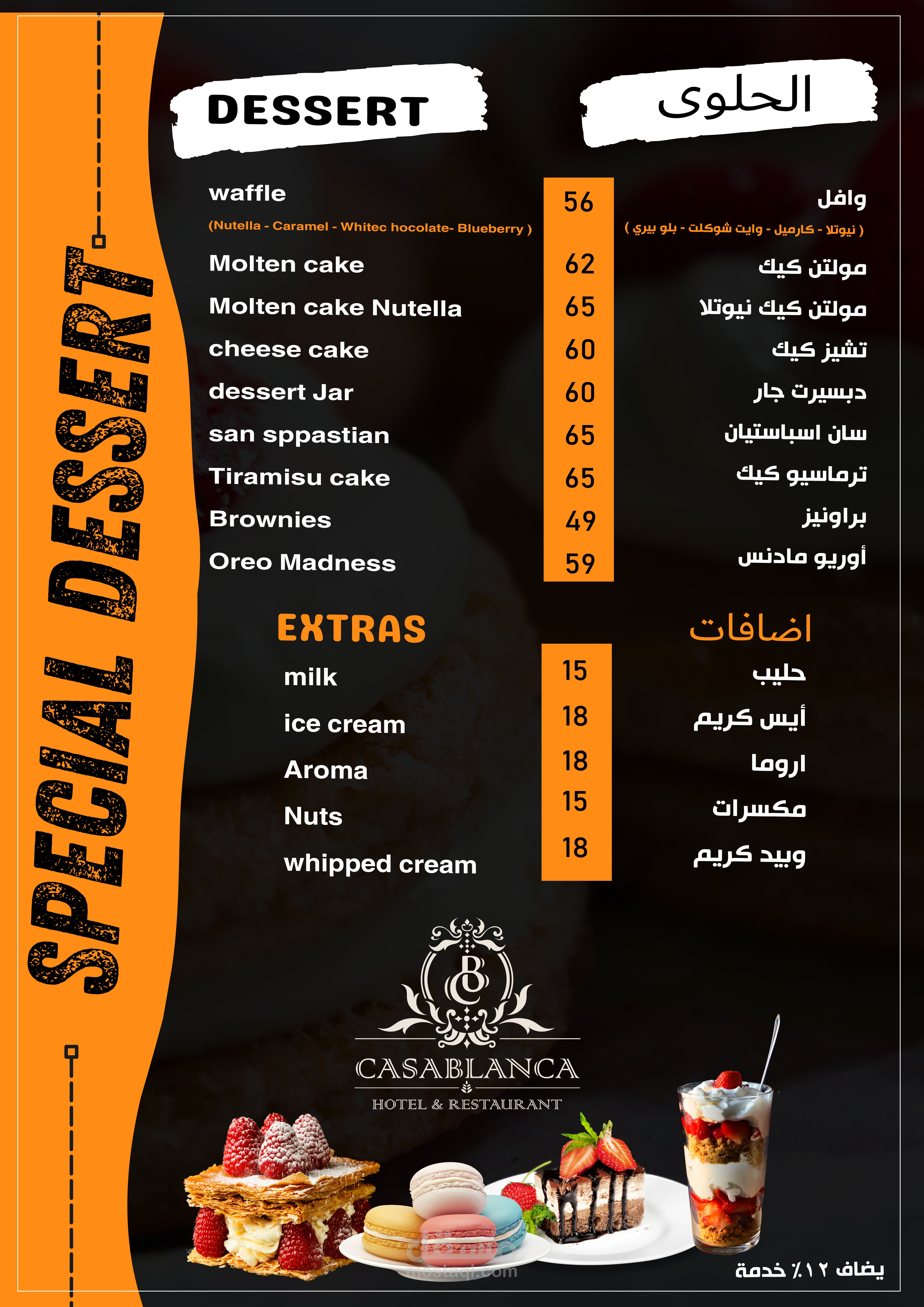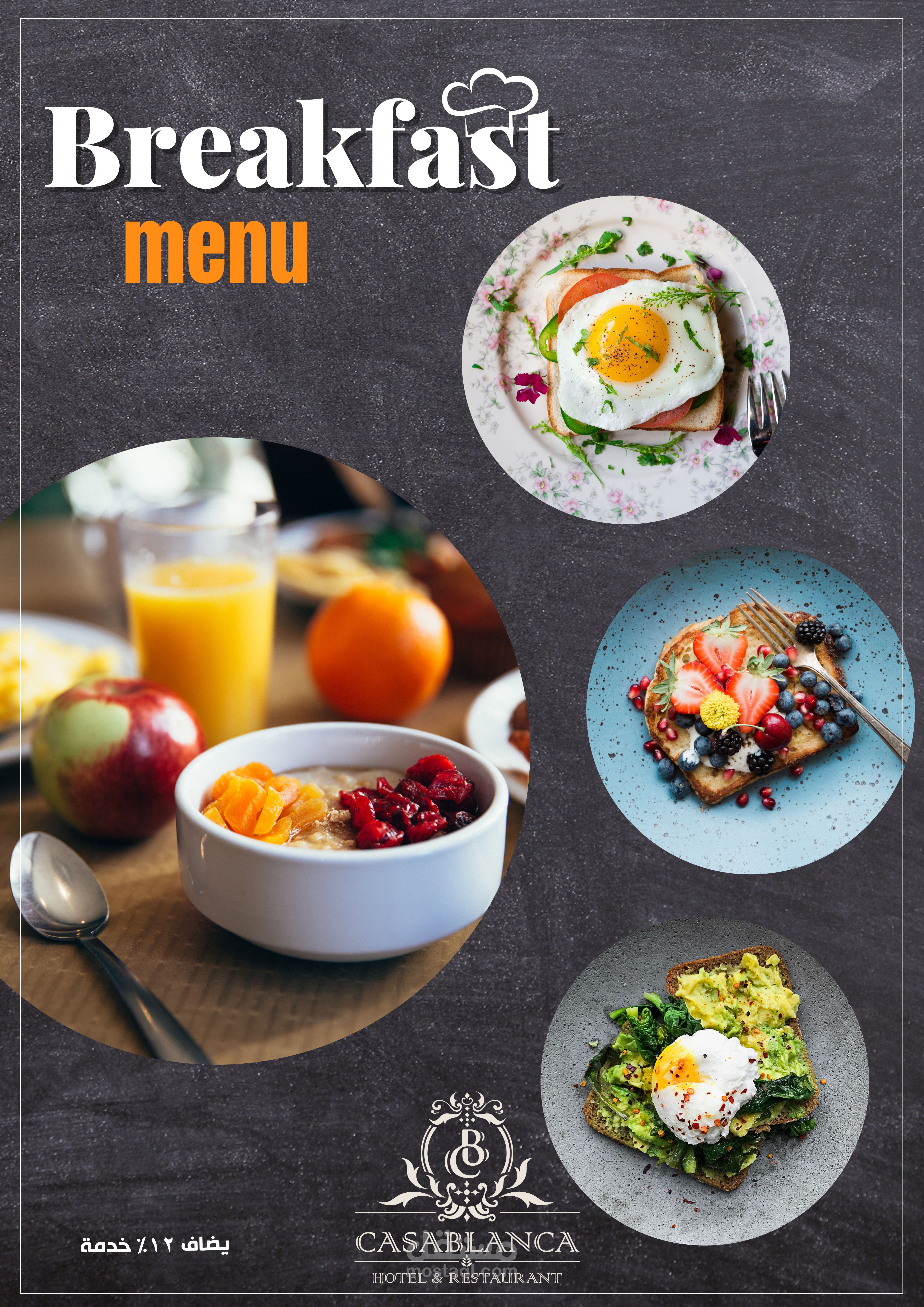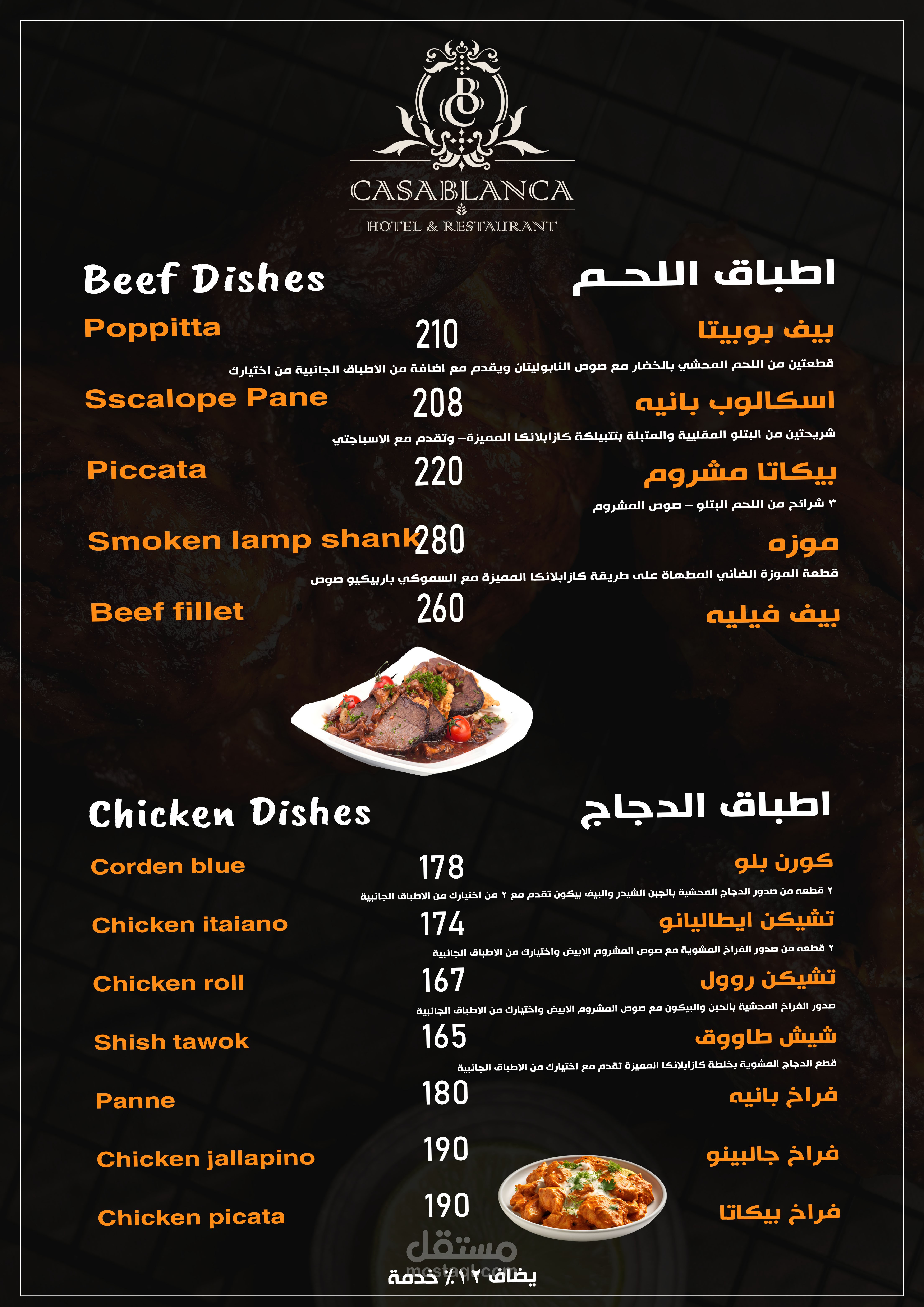 العمل عبارة عن منيو بنظام الكتيب 20 صفحة تشمل كل الاقسام والاصناف الموجودة بالمطعم تم مراعاة الاوان الخاصة بالفندق تم تنفيذ العمل باستخدام الفوتوشوب وتم طباعته وسلفنته بسلفان مط ليتناسب مع الوان التصميم وتم تسليم العمل ولاقي قبول الجميع
