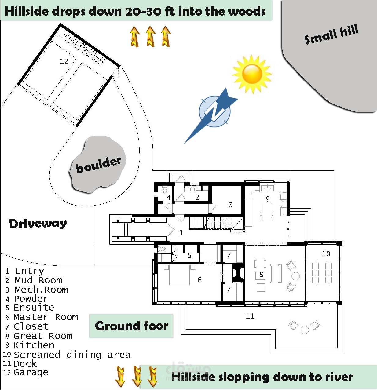 The kitchen and the living room were located to achieve maximum day light exposure through the glass walls and celling .the location of the stairs is a designed in a manner to collect maximum sun light maintaining smooth flow of hot air on the two floors .