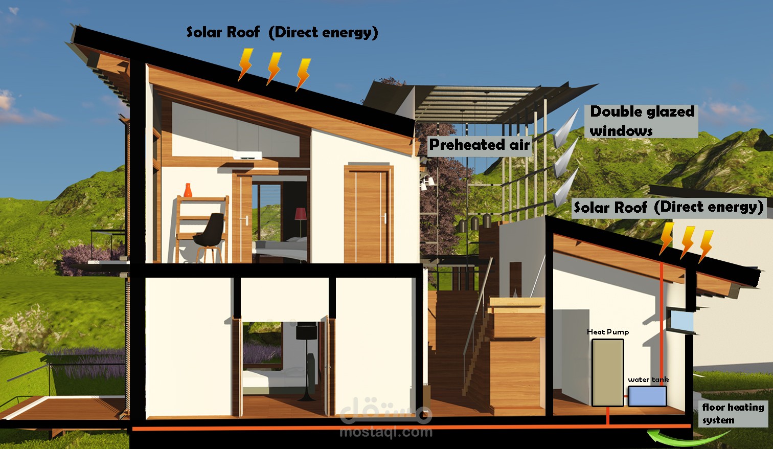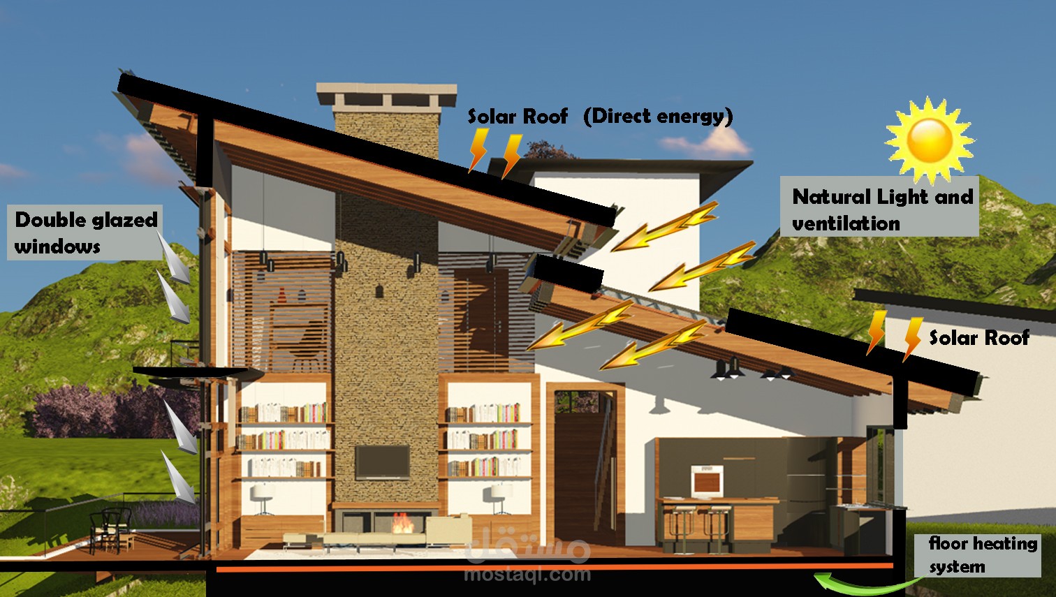 Tesla Solar system: Tesla Solar system is proposed with glass solar tiles on the entire roof(except the entrance and stairs area) in order to generate power requirement including heating (floor heating system) you also have a propane boiler as a backup.