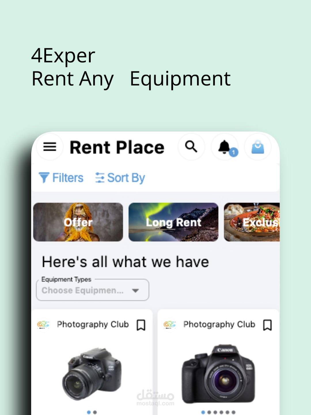 1- تأجير الكاميرات والمعدات: يتيح 4Exper للمصورين استئجار الكاميرات، والعدسات، ومعدات الإضاءة، والإكسسوارات الأخرى التي يحتاجونها لجلسات التصوير. لديهم مجموعة واسعة من المعدات المتاحة للإيجار بأسعار تنافسية.