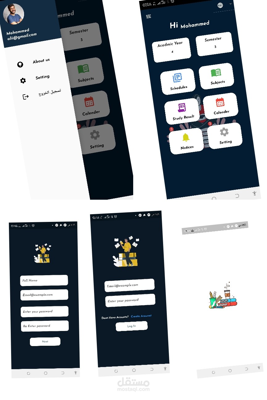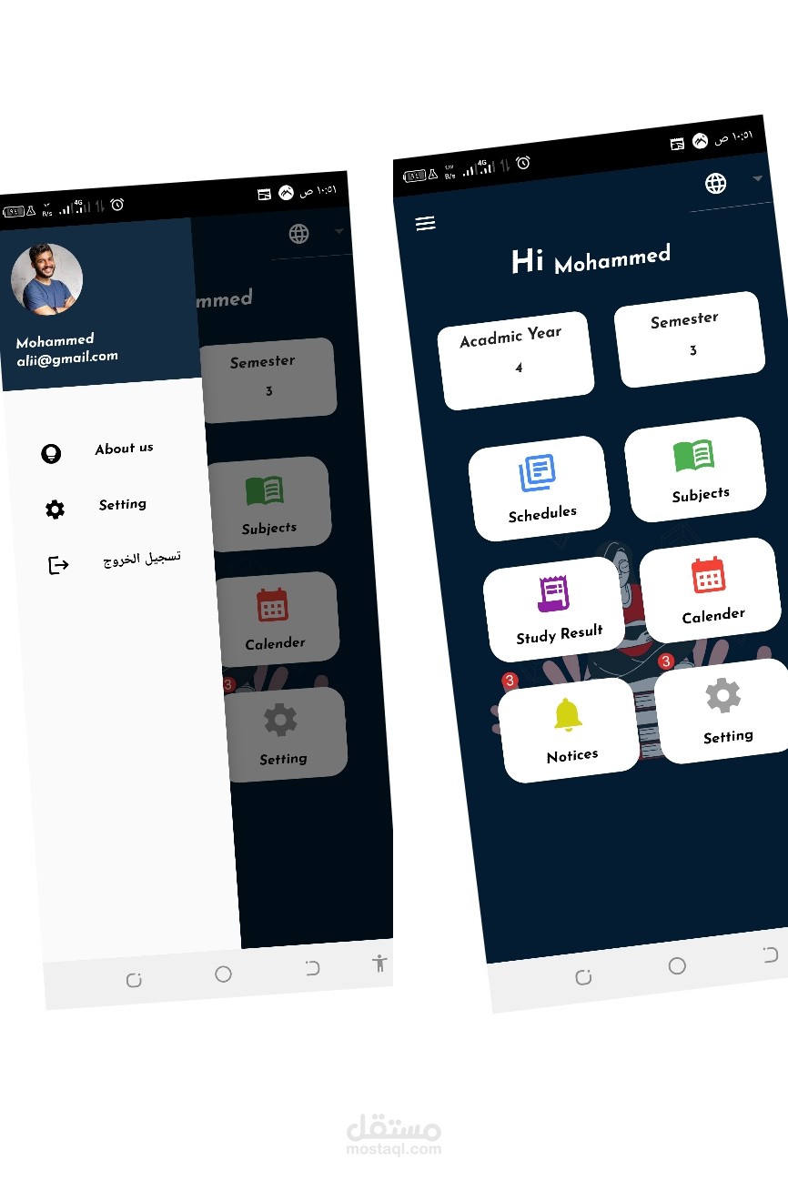 احد أعمالي الاولى والذي يتمثل في تطبيق لخدمات الطلاب التي تتمثل في معرفة النتيجة الدراسية ومعرفة مواعيد المحاضرات والدروس والجداول الدراسية