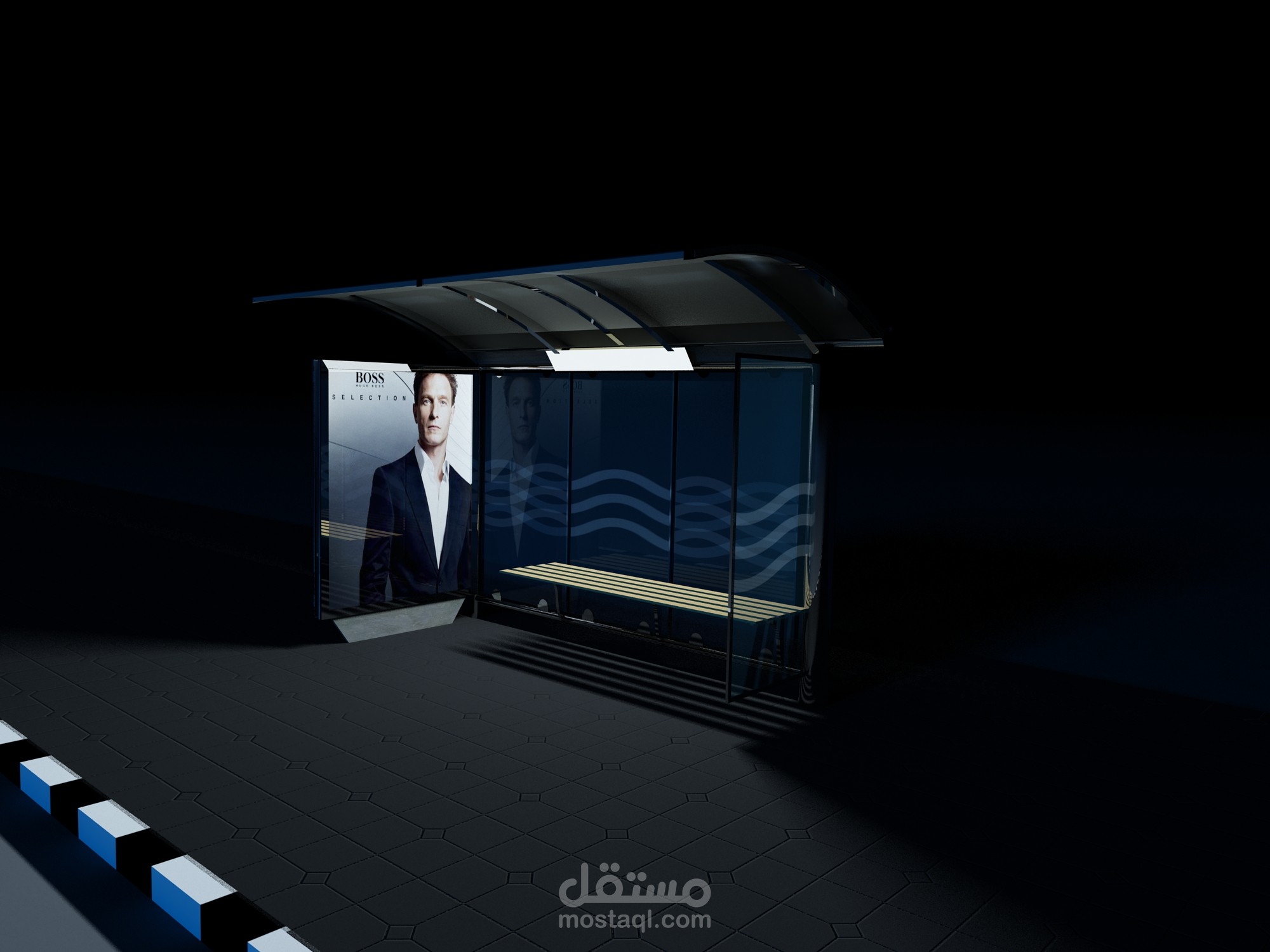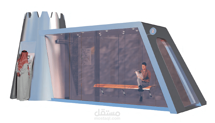 ١- ابتكار وتصميم موقف للباصات من الحجر والزجاج يناسب تراث البيئة الخليجية والبناء العمراني للمنطقة يحوي الموقف نظام تبريد ATM مع لوحة للاعلانات