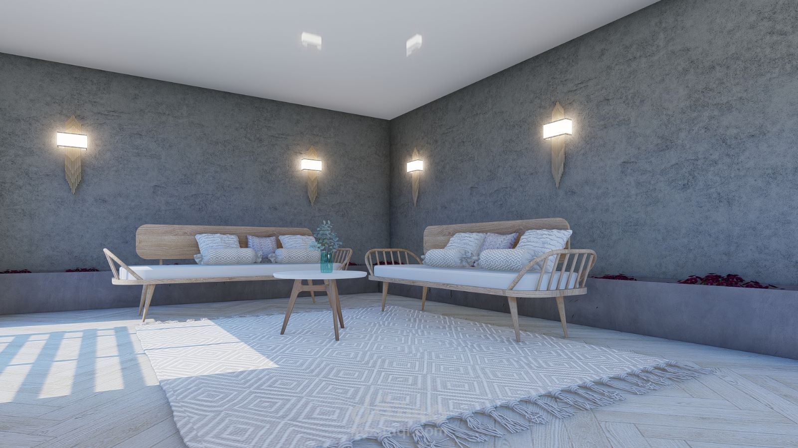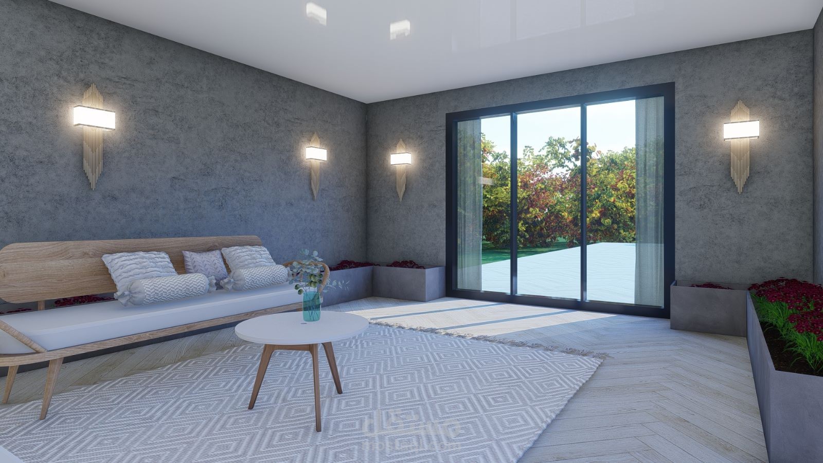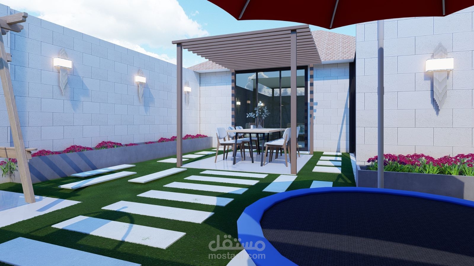 تصميم حديقة سطح تتكون من غرفة شتاء وطاولة سفرة للإفطار ومساحة مخصصة للترامبولين وأحواض زراعة بشكل جميل ومريح ويتناسب مع متطلبات العميل.