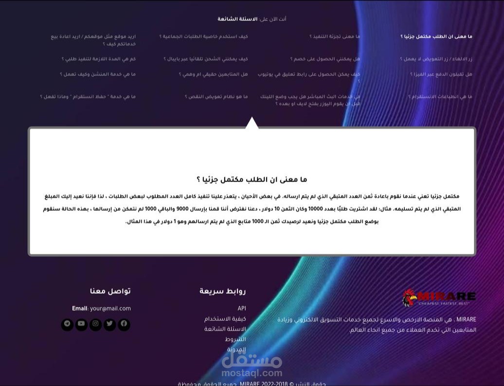 باختصار، قمت بتصميم وتنفيذ موقع ويب متخصص لبيع متابعين مواقع التواصل الاجتماعي مع التركيز على تصميم مرئي مبتكر وتجربة مستخدم سهلة. قمت بتنفيذ نظام قوي وموثوق لإدارة الطلبات والتسليم، وتوفير ميزات أمان وتحليلات قوية لتحقيق أداء ممتاز ونجاح المشروع.