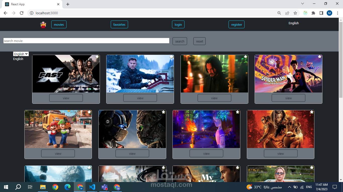 this is movie website by react js , display the the treanding movie in the world from api in cards and you can show details by click view button and you can add to favorites list