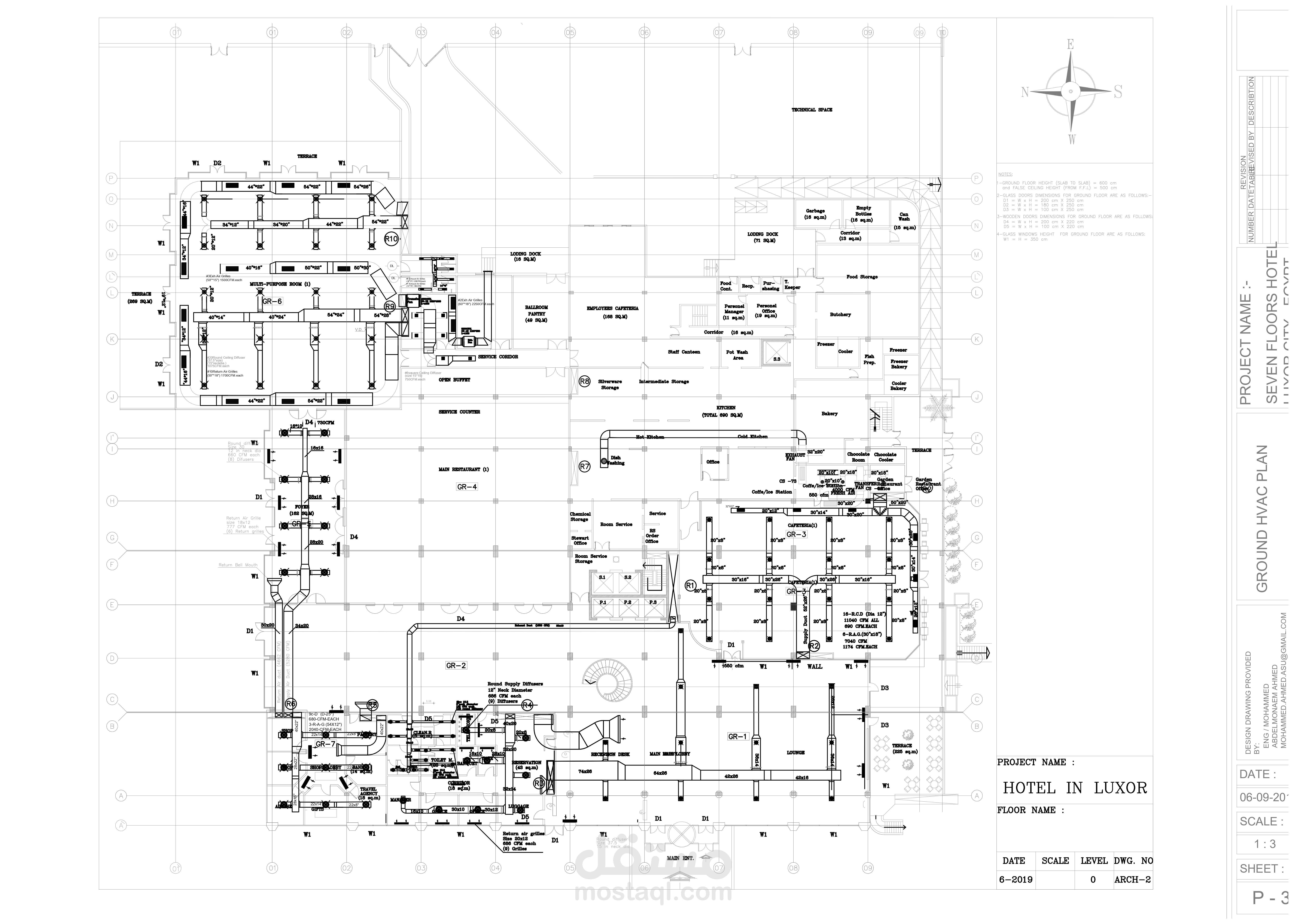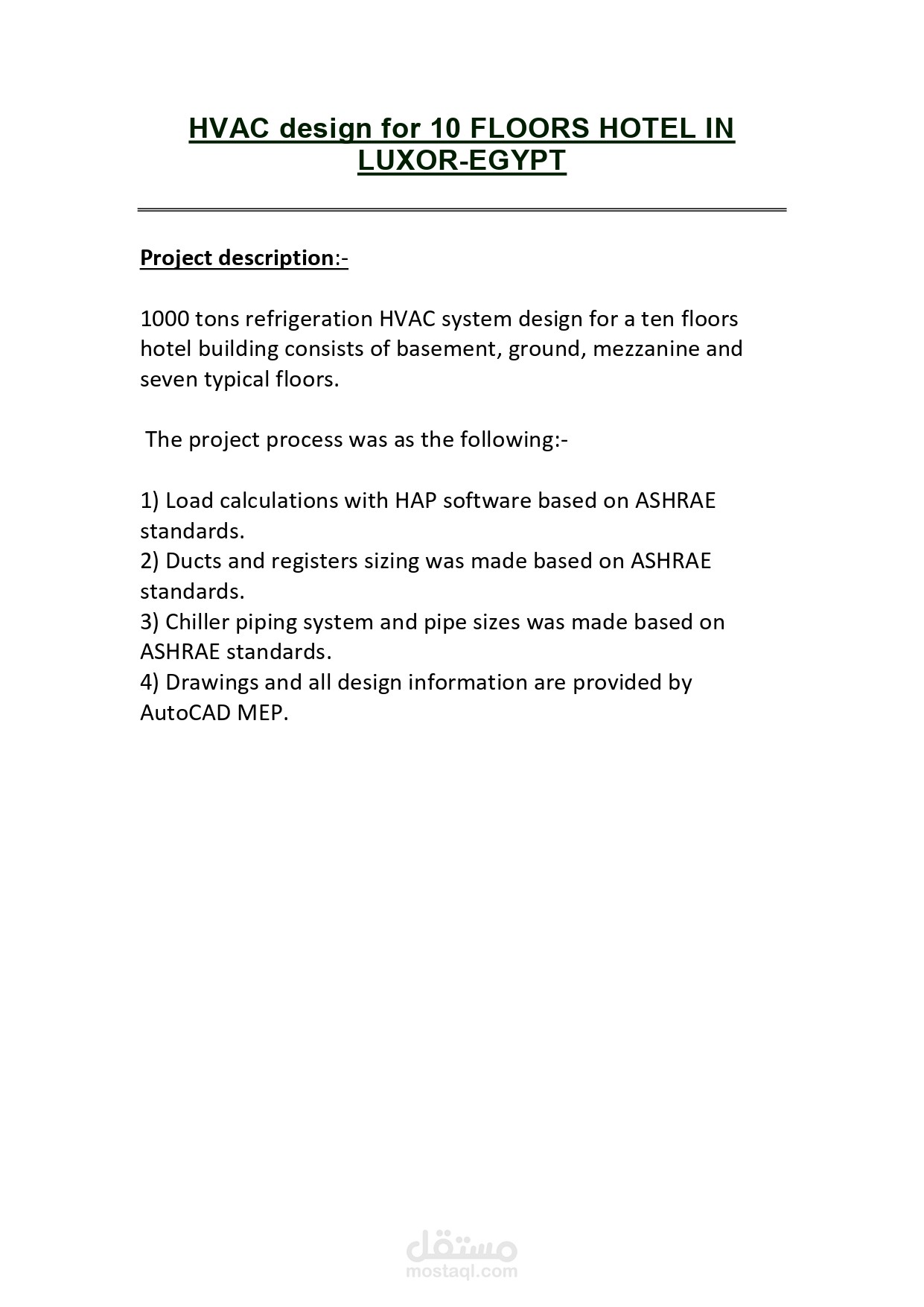 1000 tons refrigeration HVAC system design for a ten floors hotel building consists of basement, ground, mezzanine and seven typical floors.
