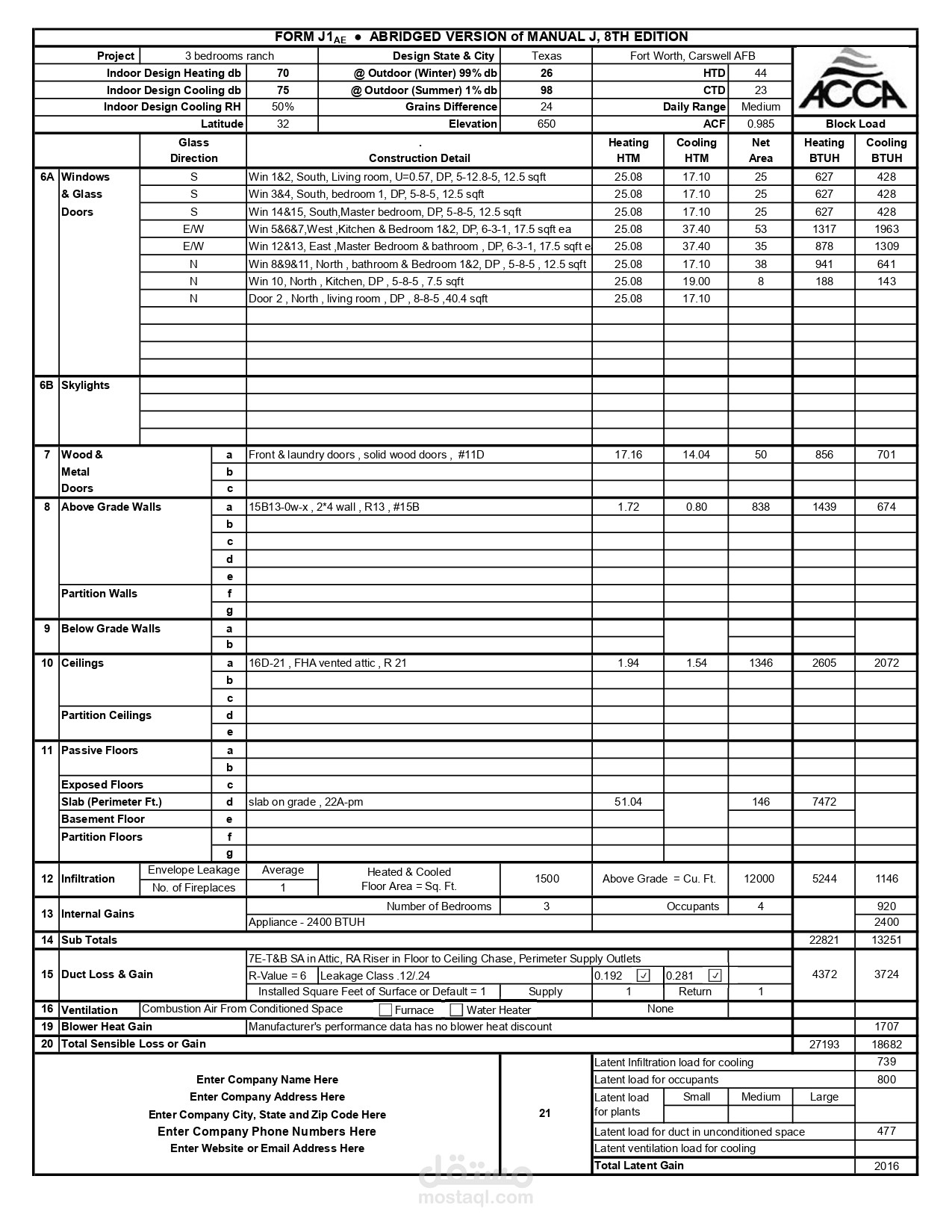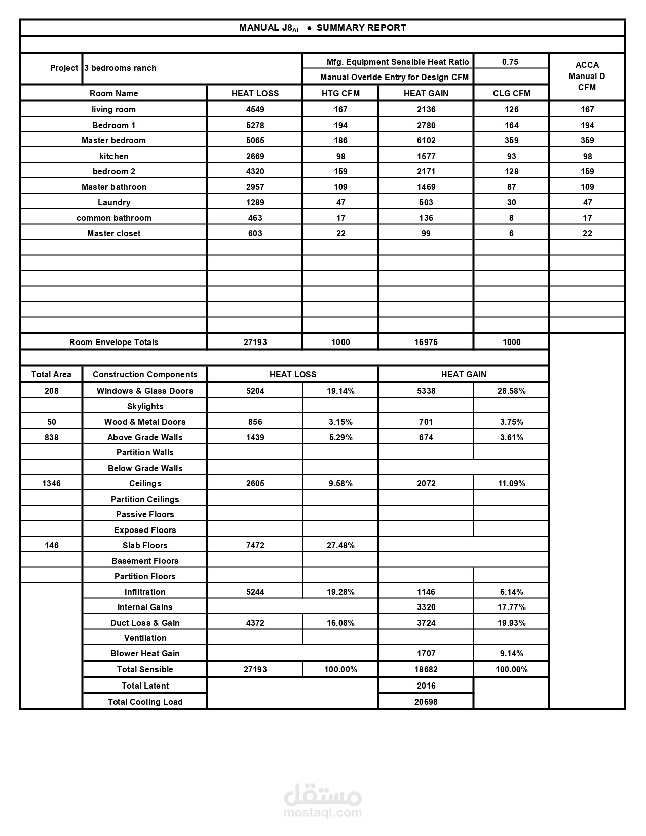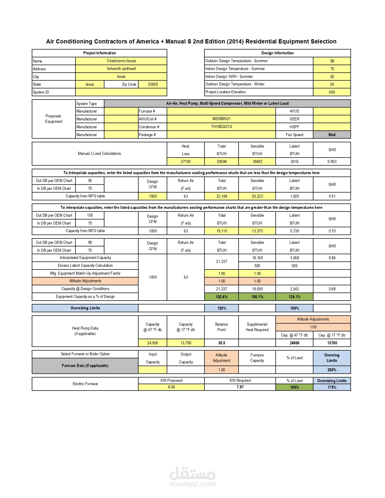 1) Manual J load calculations with ACCA manual J spreadsheet was done.
