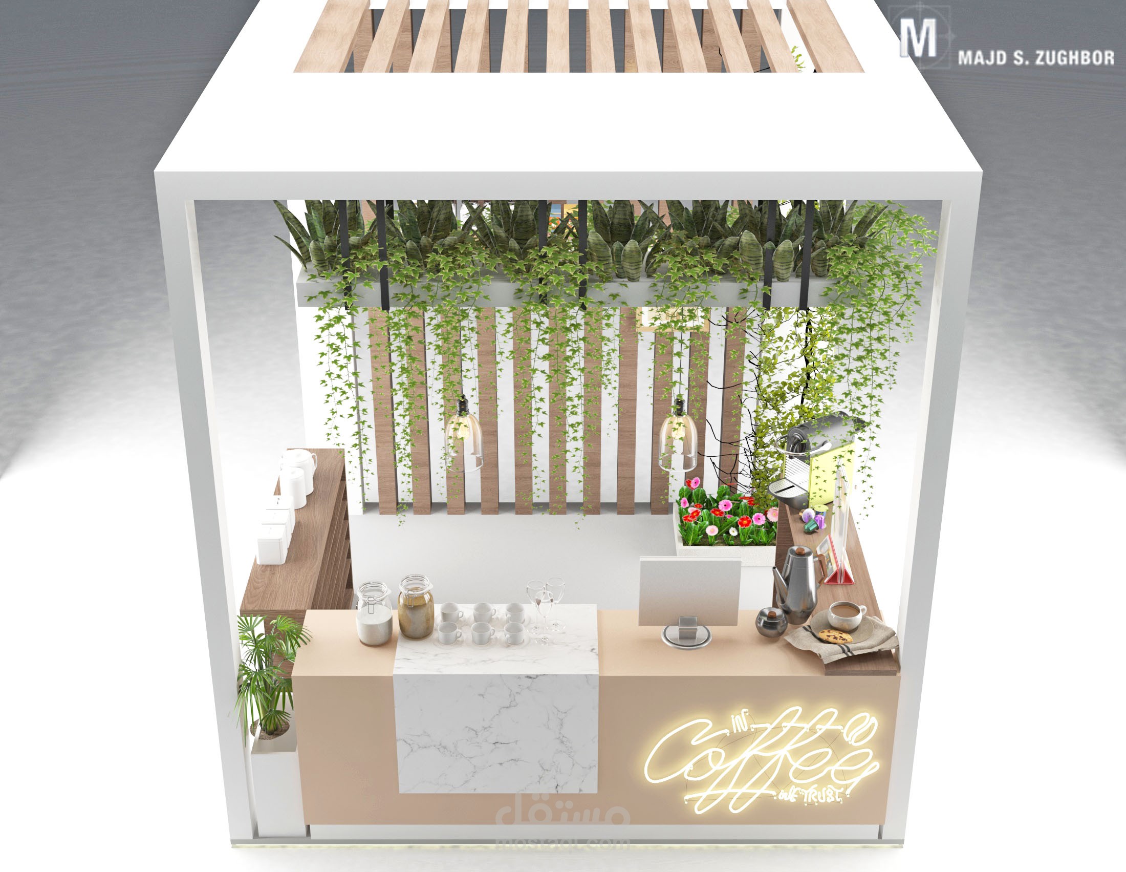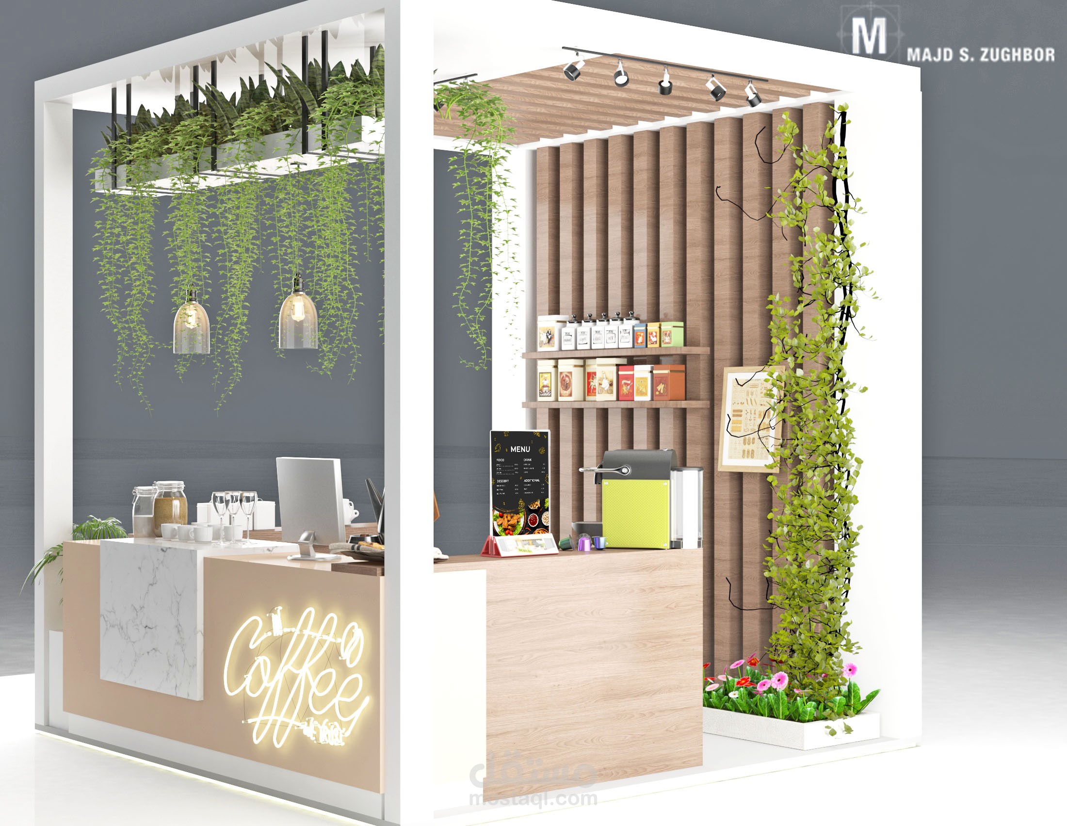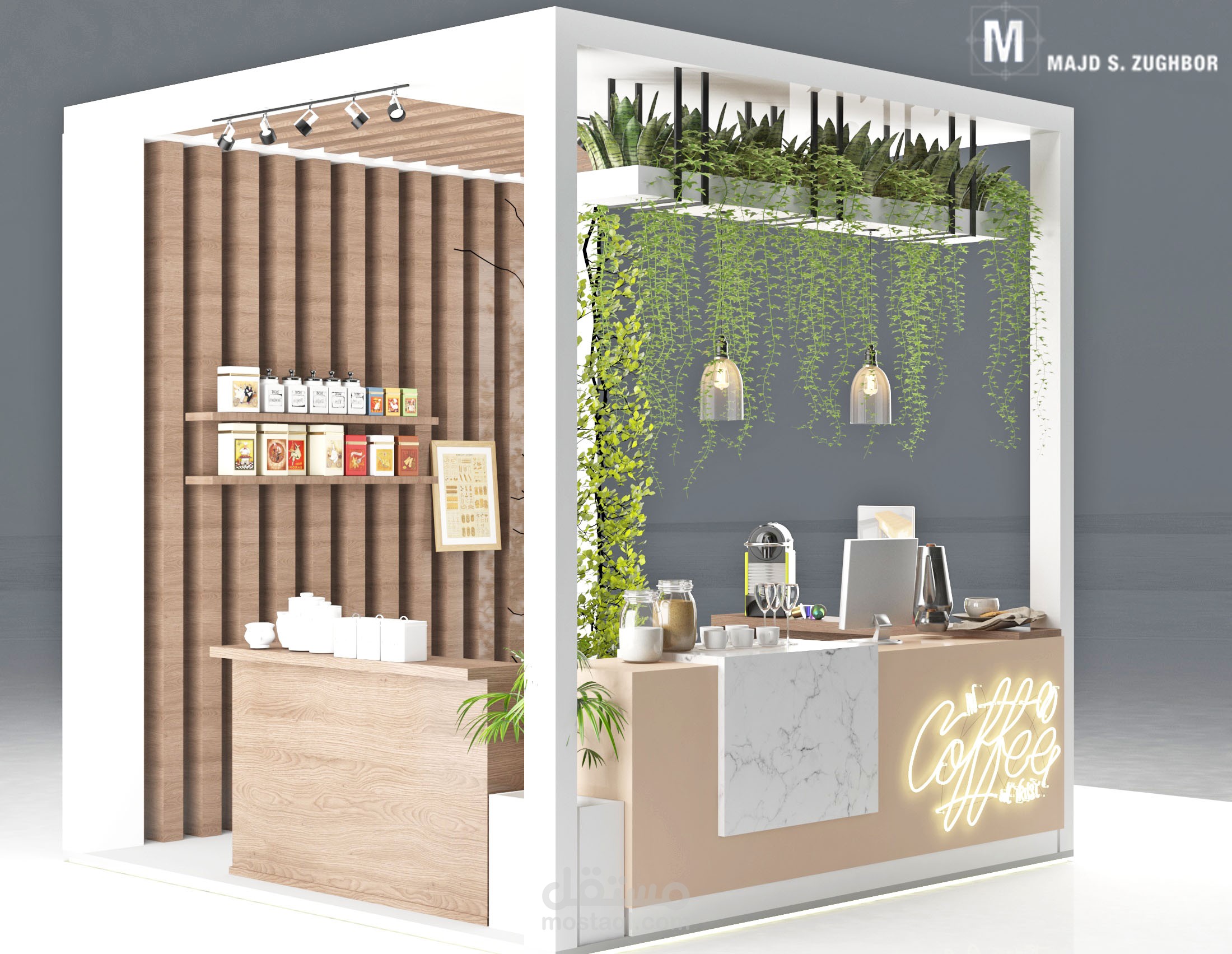 تصميم كوفي صغير ، داخل مول تجاري يقدم المشروبات السريعة والقهوة ، يحمل نفس الطابع والطراز المعماري لأفرع المحل المنتشرة في مناطق مختلفة .
