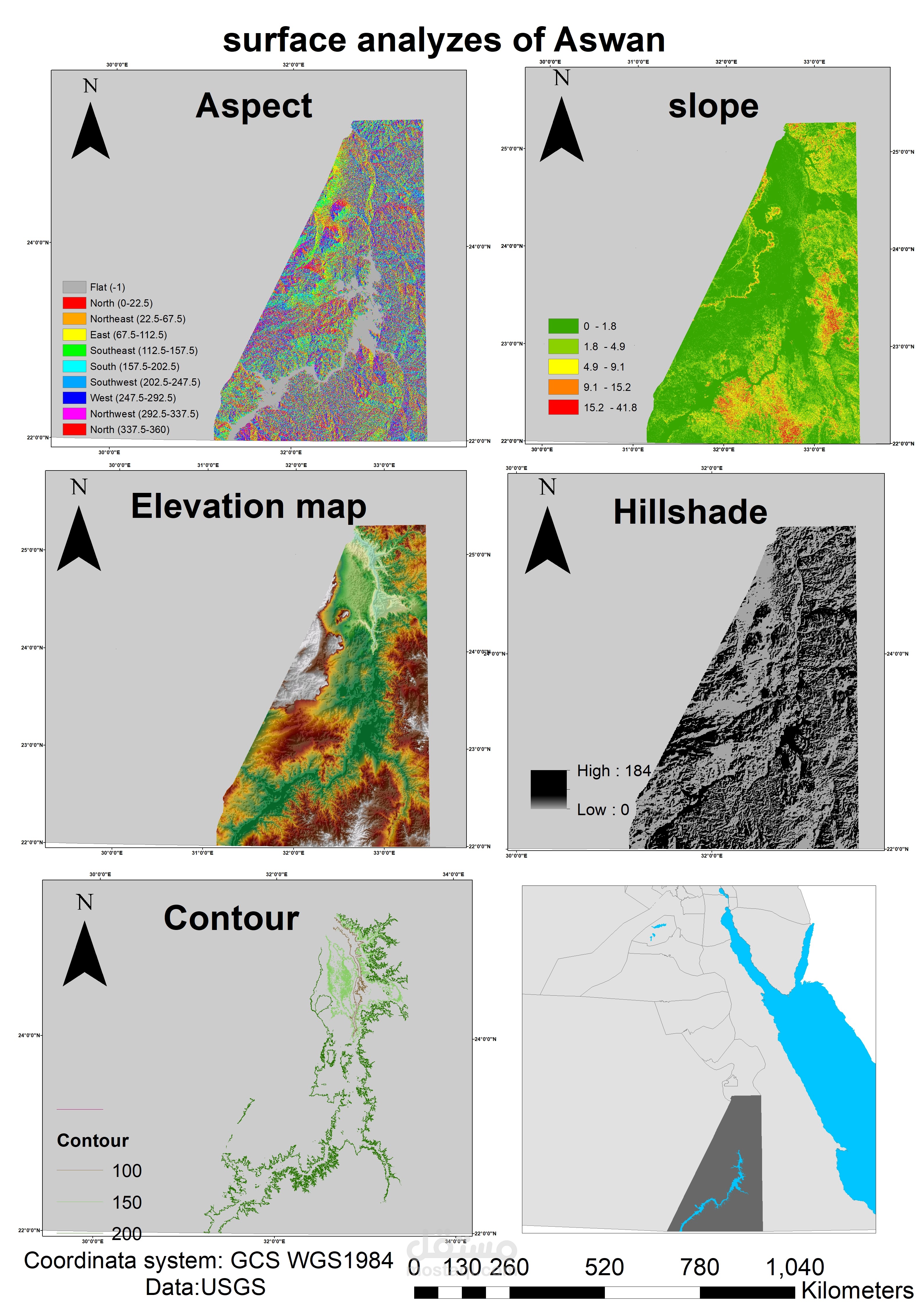 هذا العمل يمثل عدة تحليلات للسطح بمختلف انواعها مثل الانحدار واتجاه الانحدار وارتفاع السطح وخطوط الكنتور لمحفظة اسوان