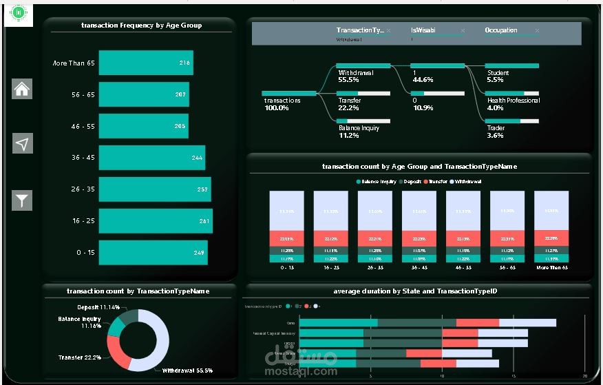 ٣. تحليل الفئة العمرية التي تقوم بأكبر عدد من المعاملات، وتحديد نوع المعاملات الأكثر انتشارًا بينهم.