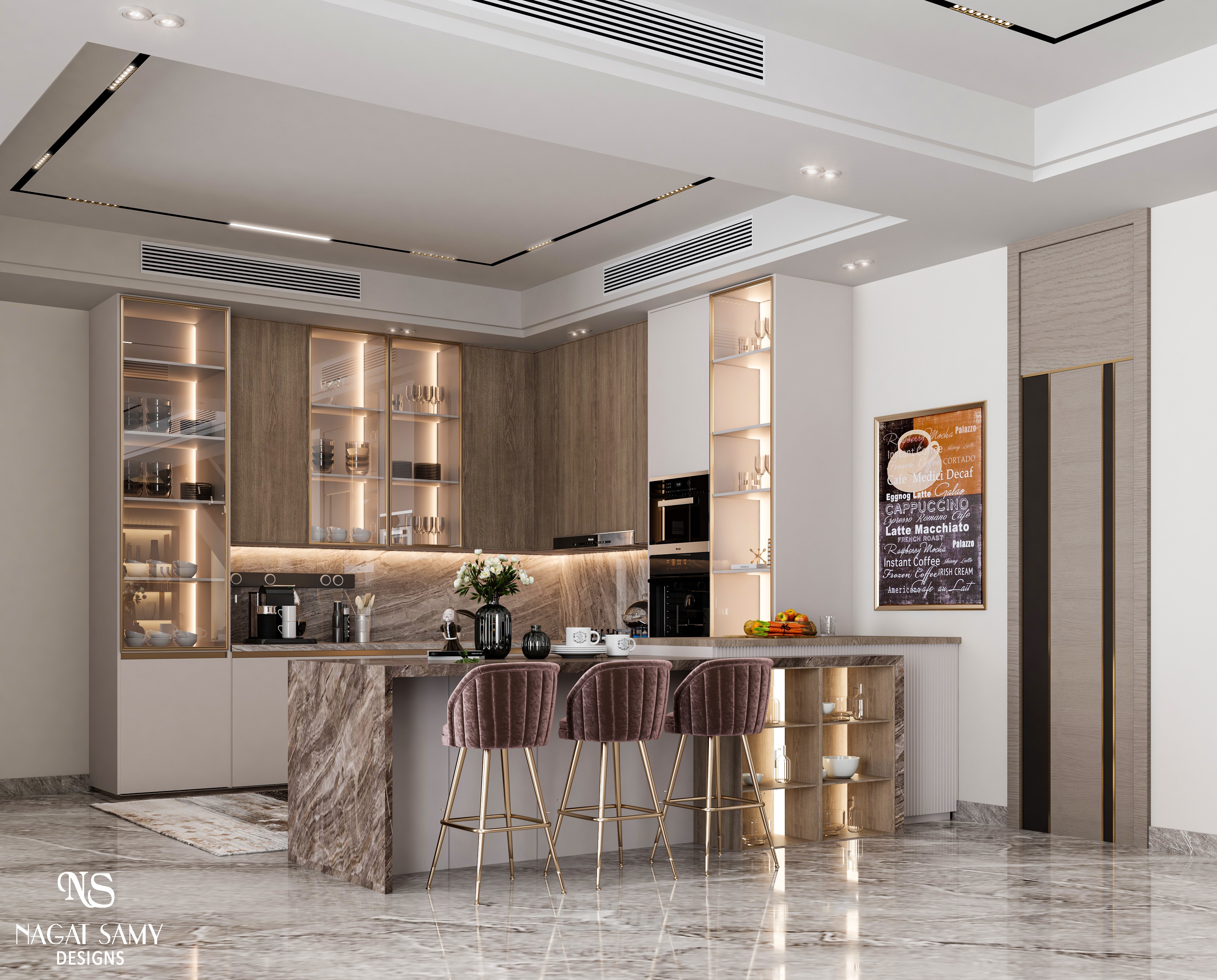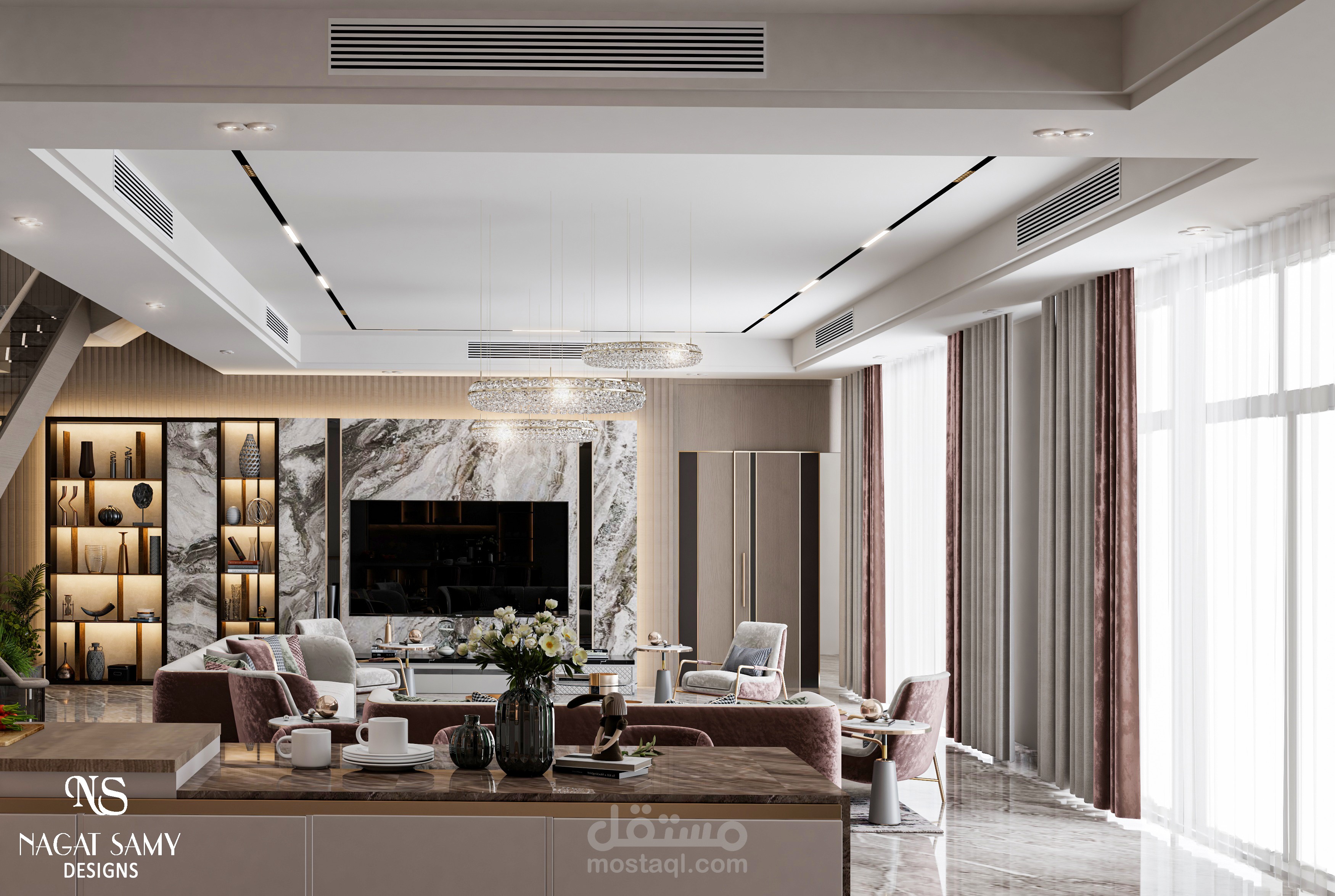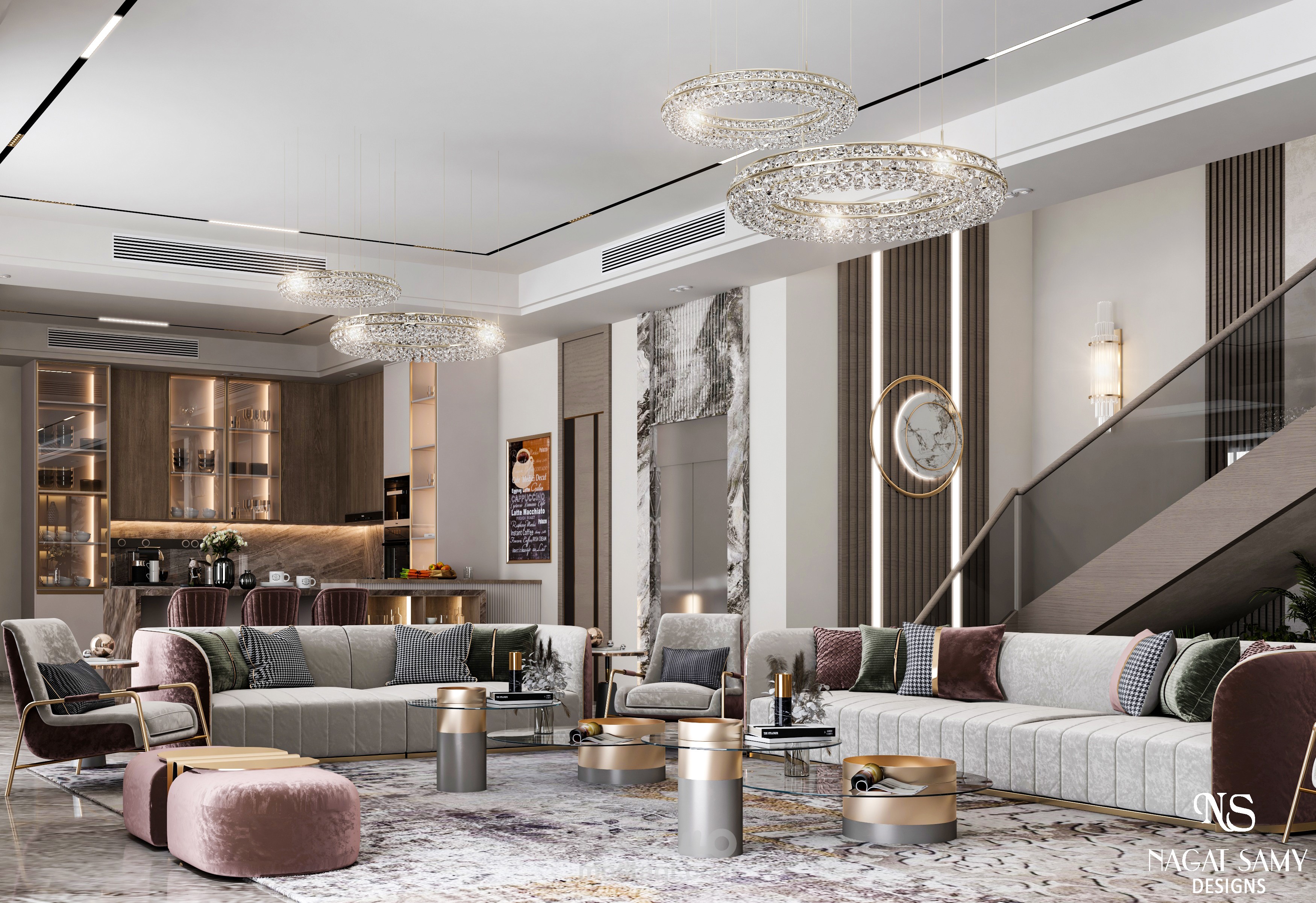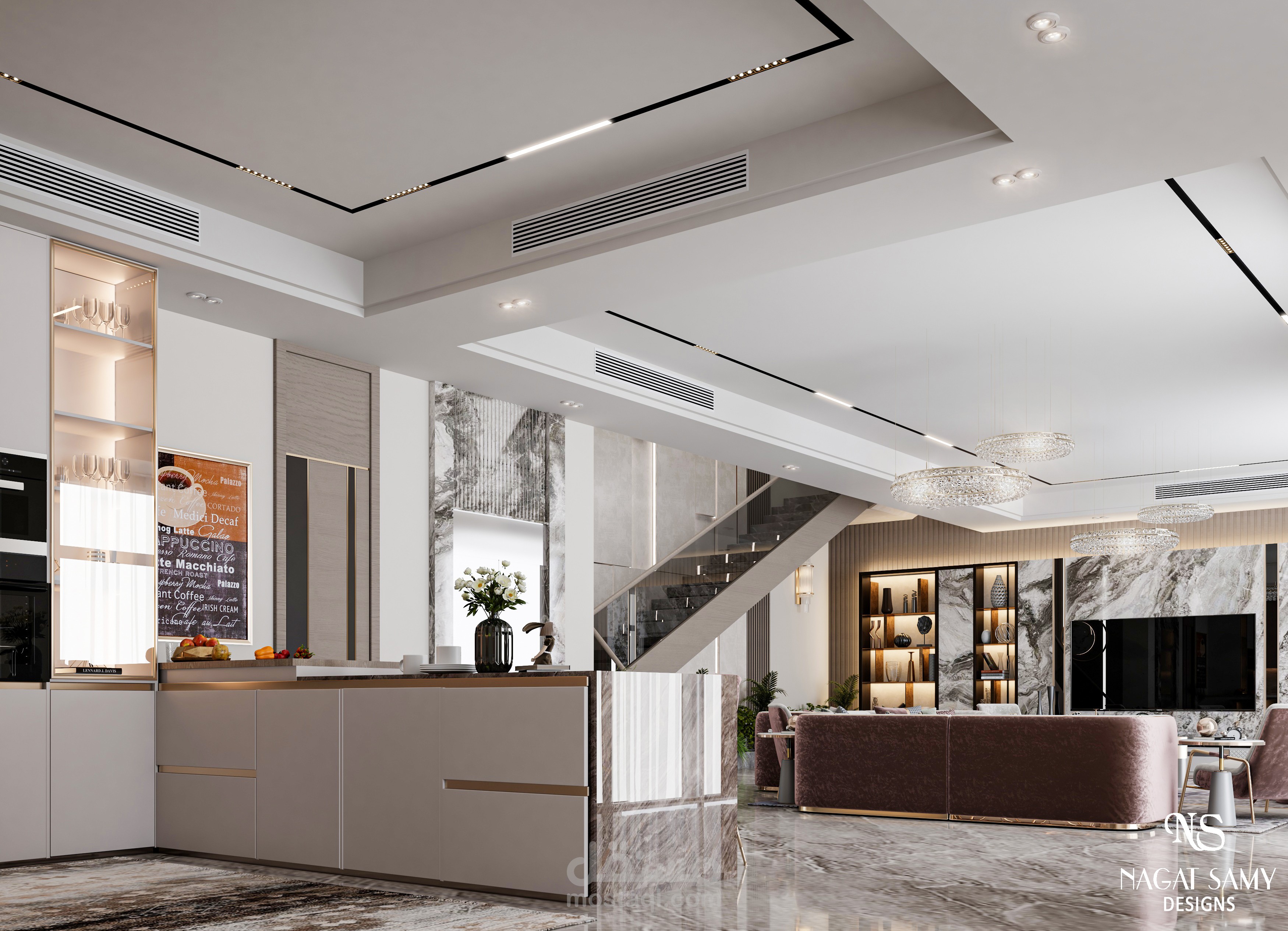 تصميم معيشة عائلية بجزء مطلخ مفتوح عليه بتصميم مودرن بسيط مع مراعاة الزوق العام