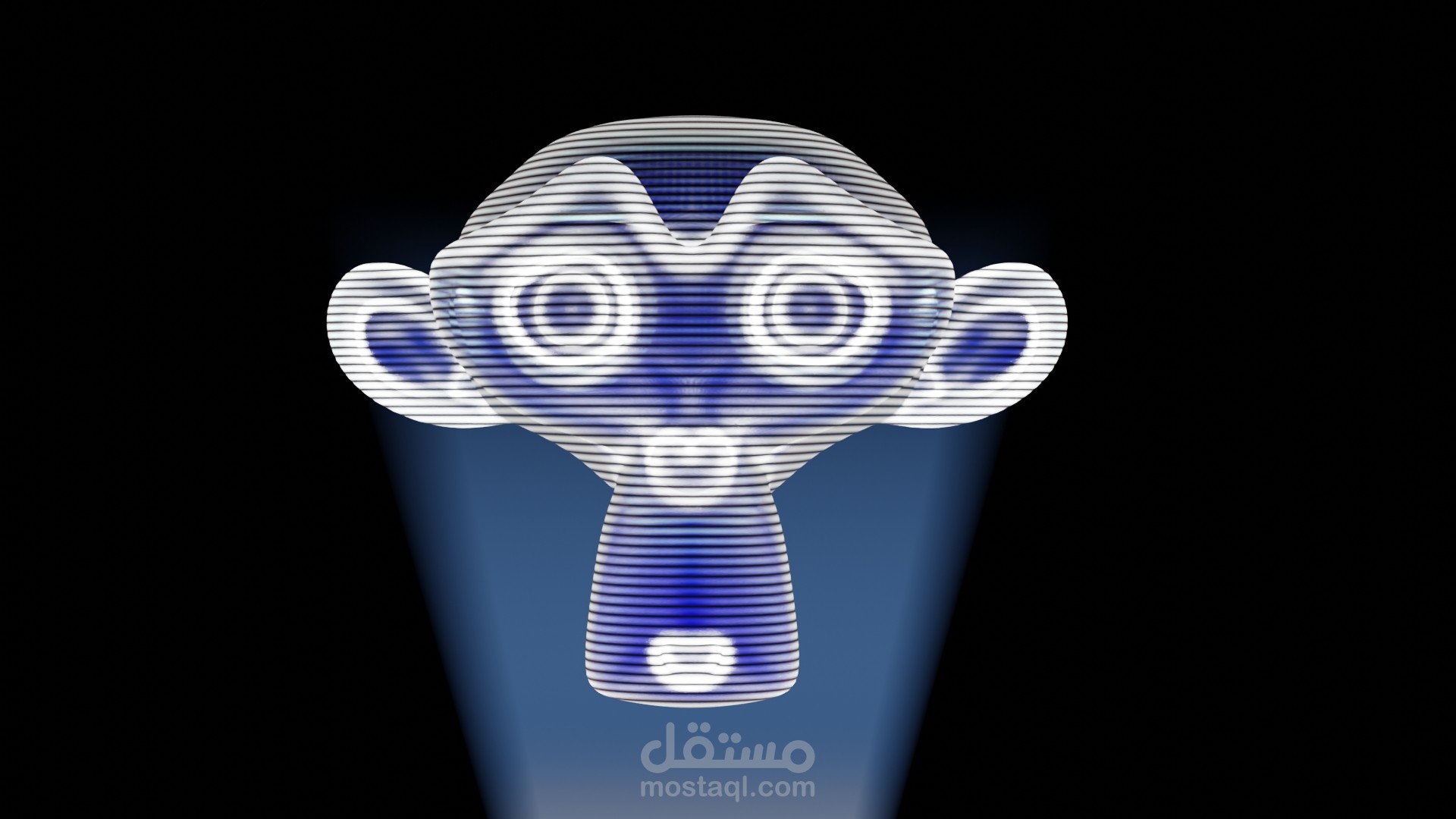 تمت الاستعانة بنموذج جاهز ثلاثي الأبعاد واضافة تأثير الهولوجرام عليه بواسطة برنامج بلندر