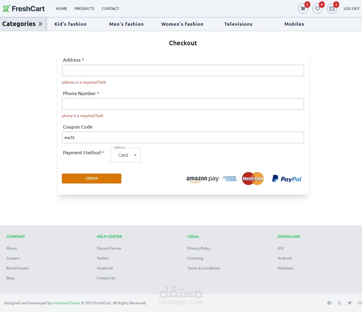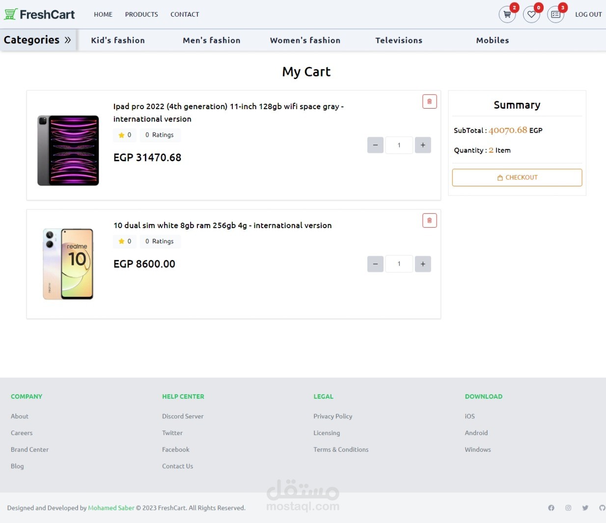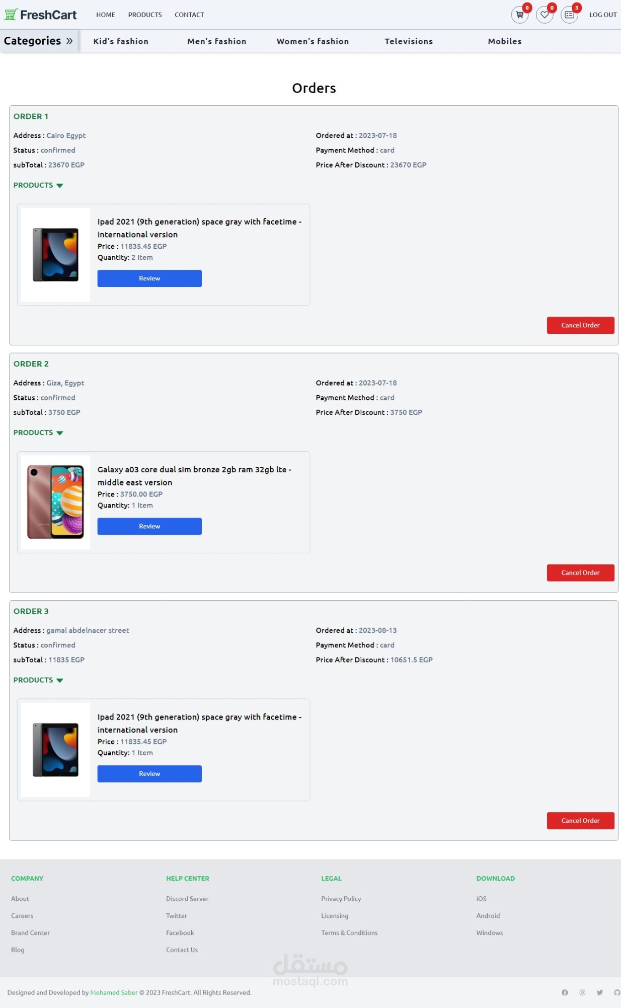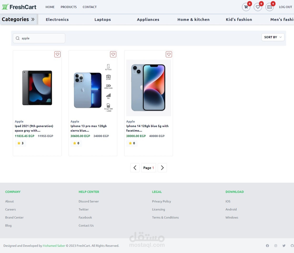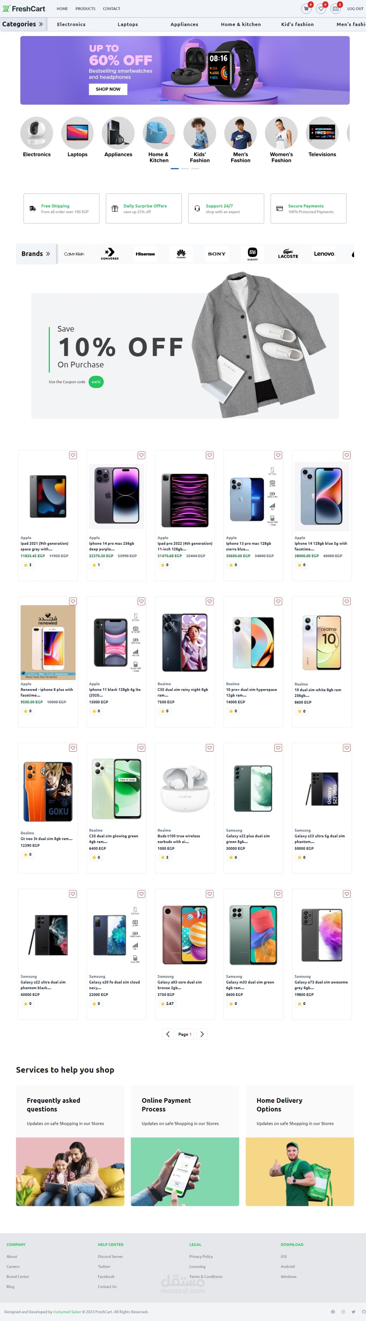 E-commerce website can show products , classification them to categories and subCategories and brands and can sort them by price and top rated and customer can add products to favorites list and add productsto cart and buy by cards or cash