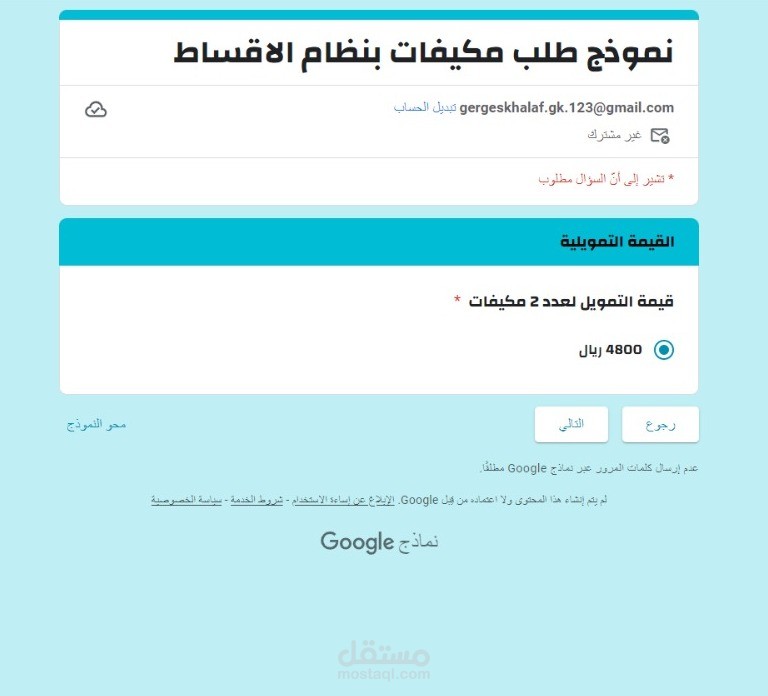تم انشاء نموذج جوجل فورم احترافي لسحب البيانات لنظام تقسيط المكيفات والقيمة التكليفية وقيمة التمويل الخاصة بالمكيفات ومدة التمويل لادراج المشترين حسب الحاجة التي يريدها .
