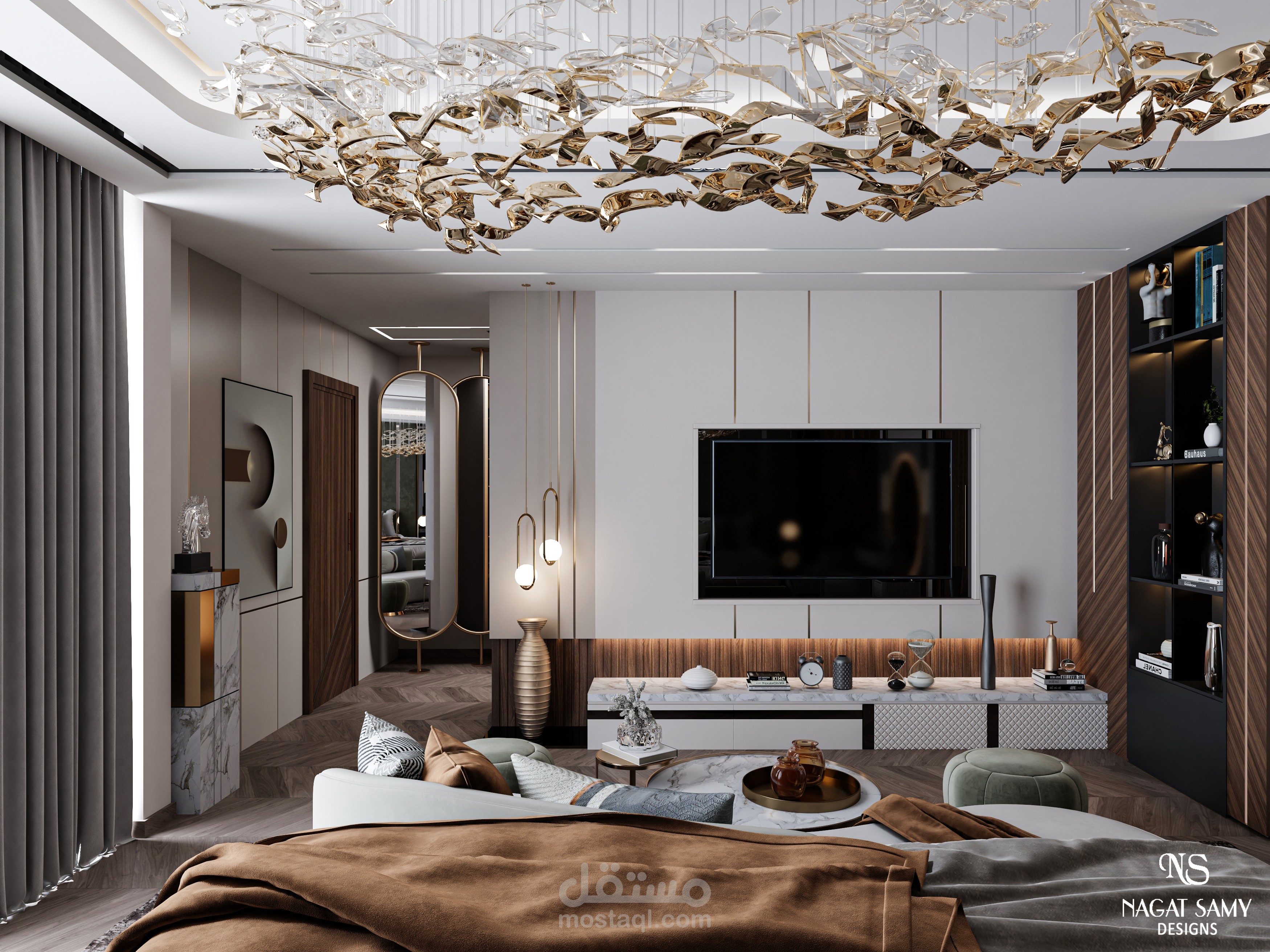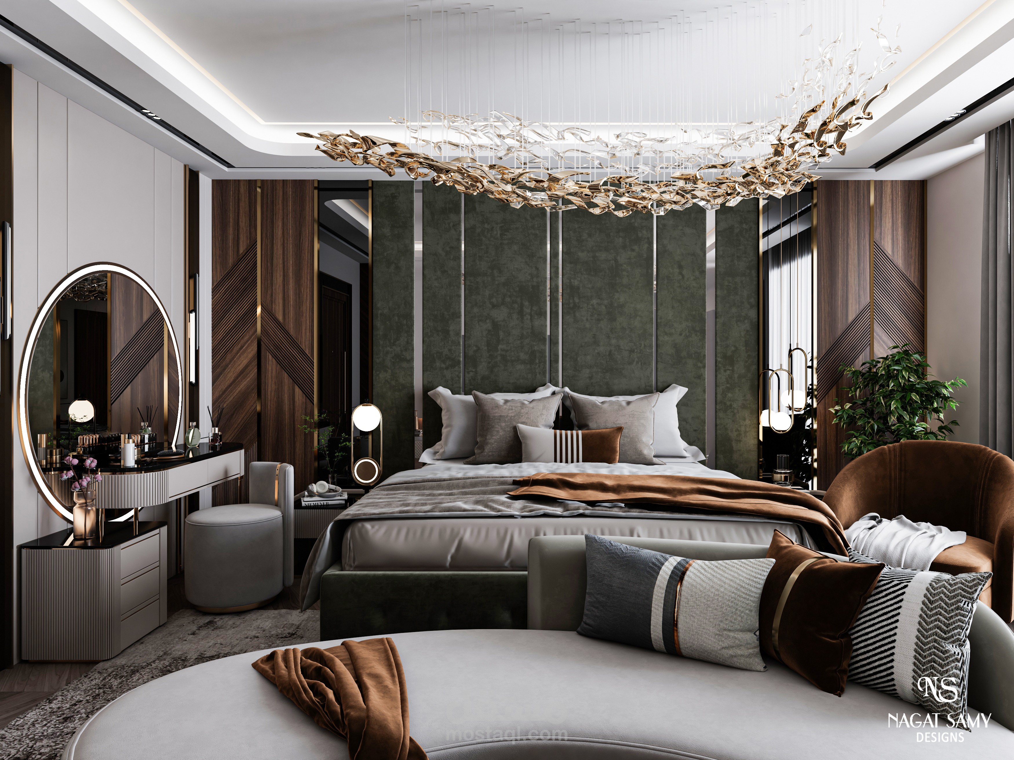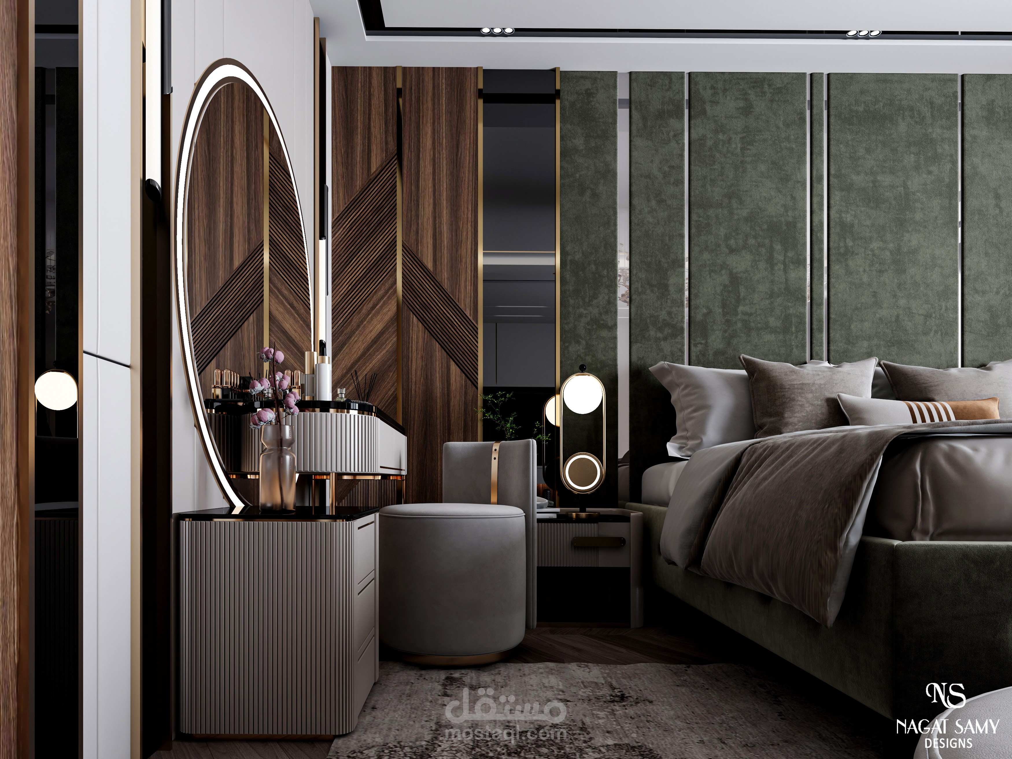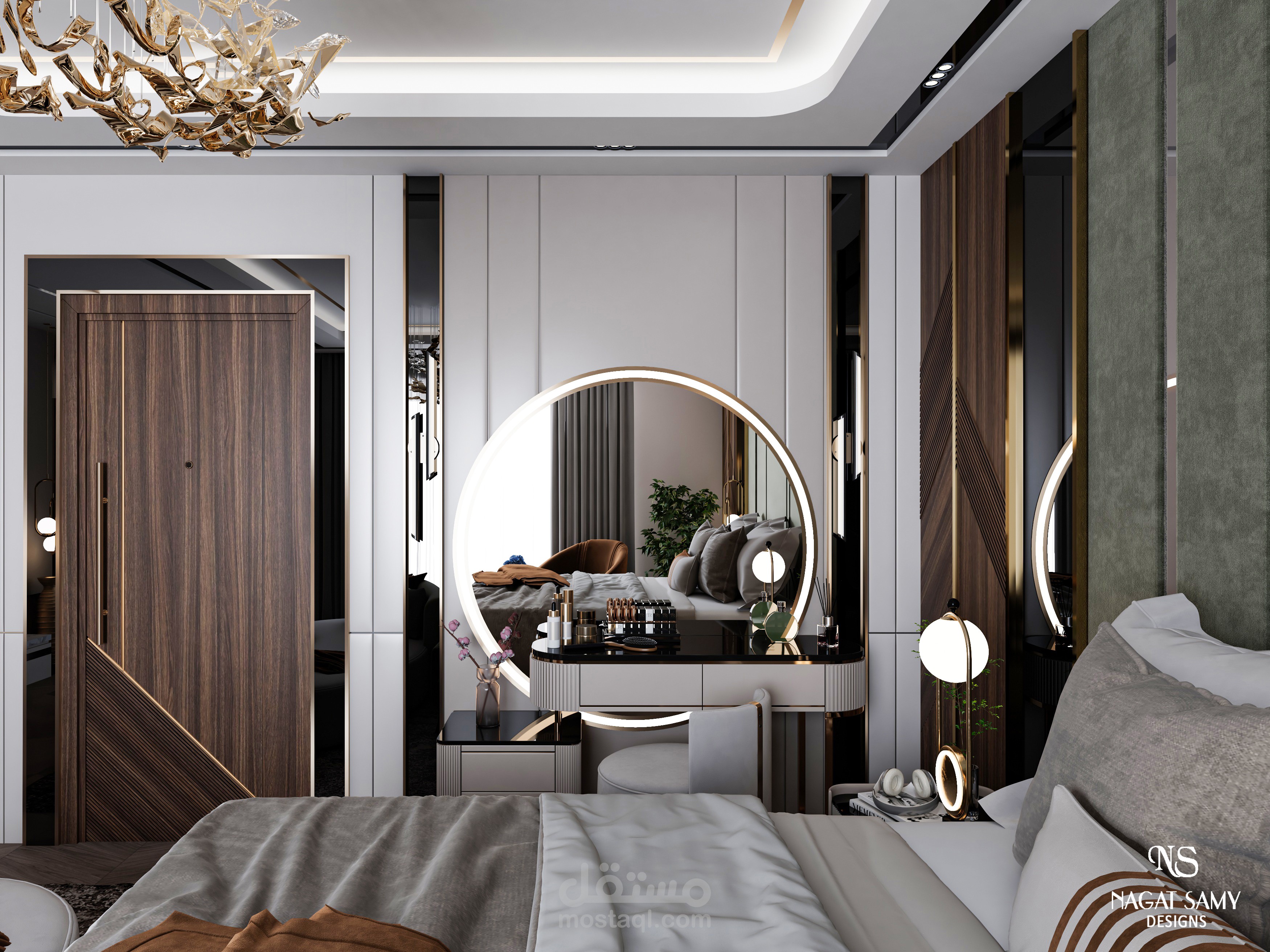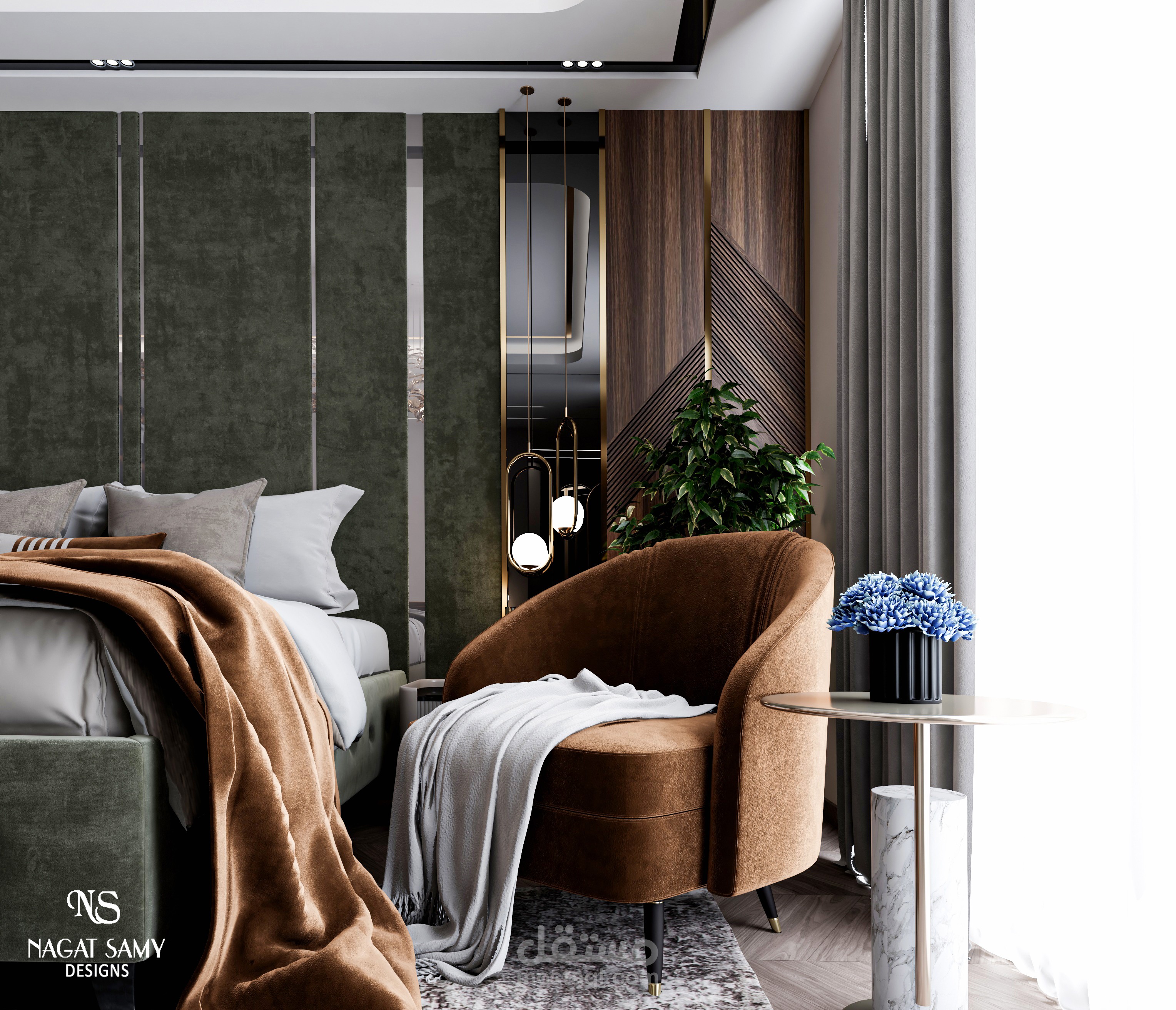 غرفة نوم رئيسية مودرن حسب طلبات العميل بالوان هادئة وتوحى بالبهجه