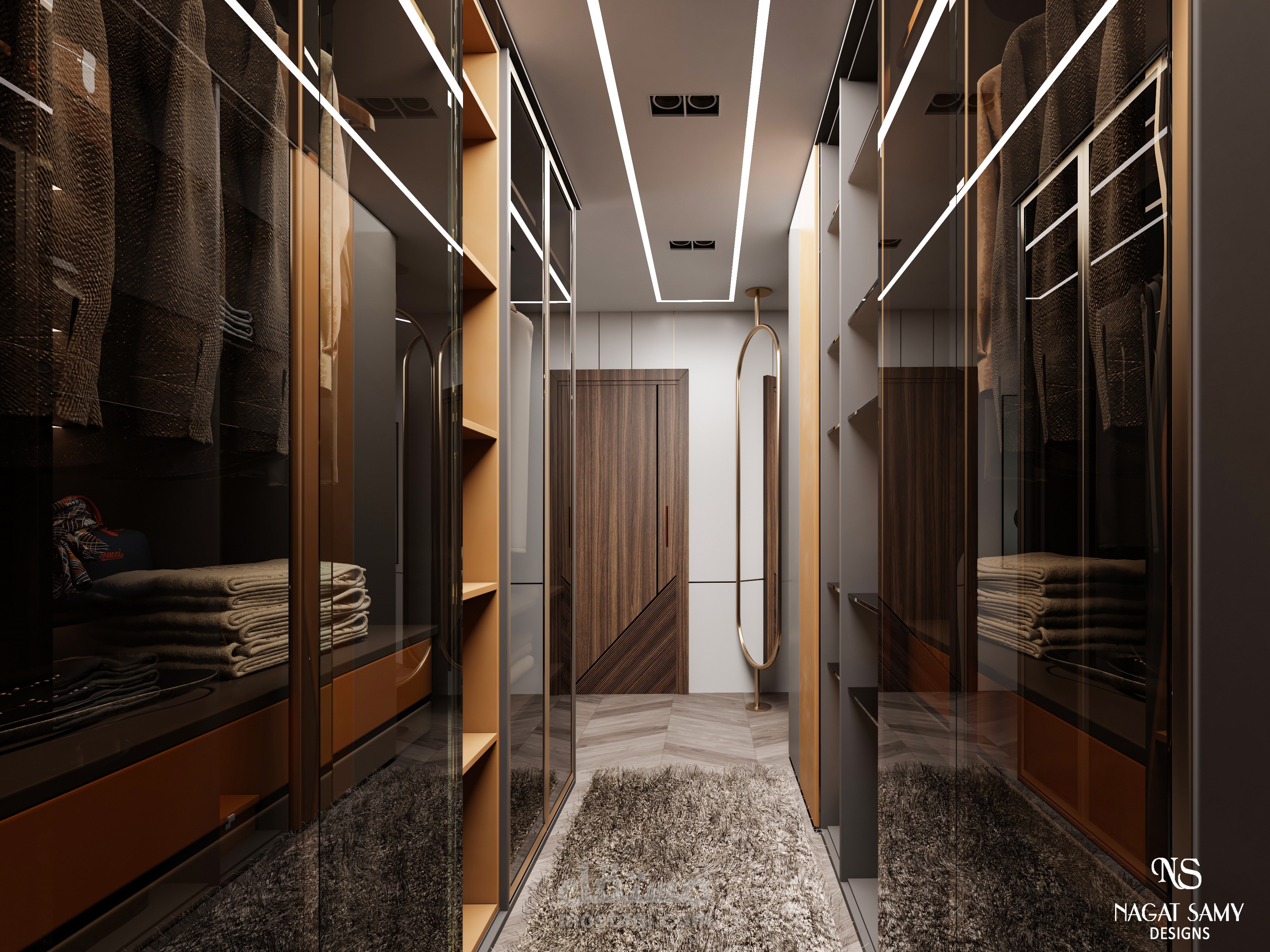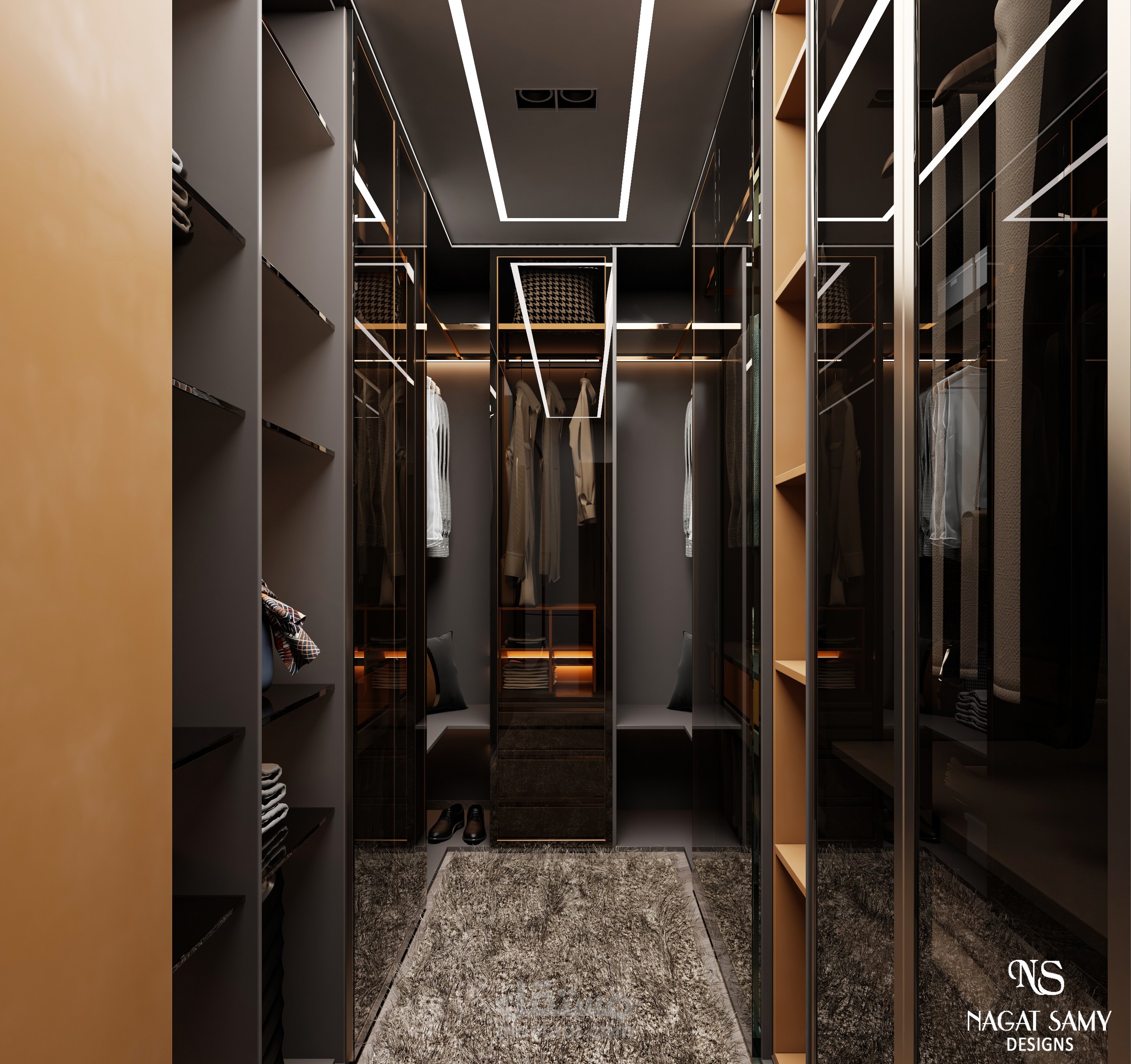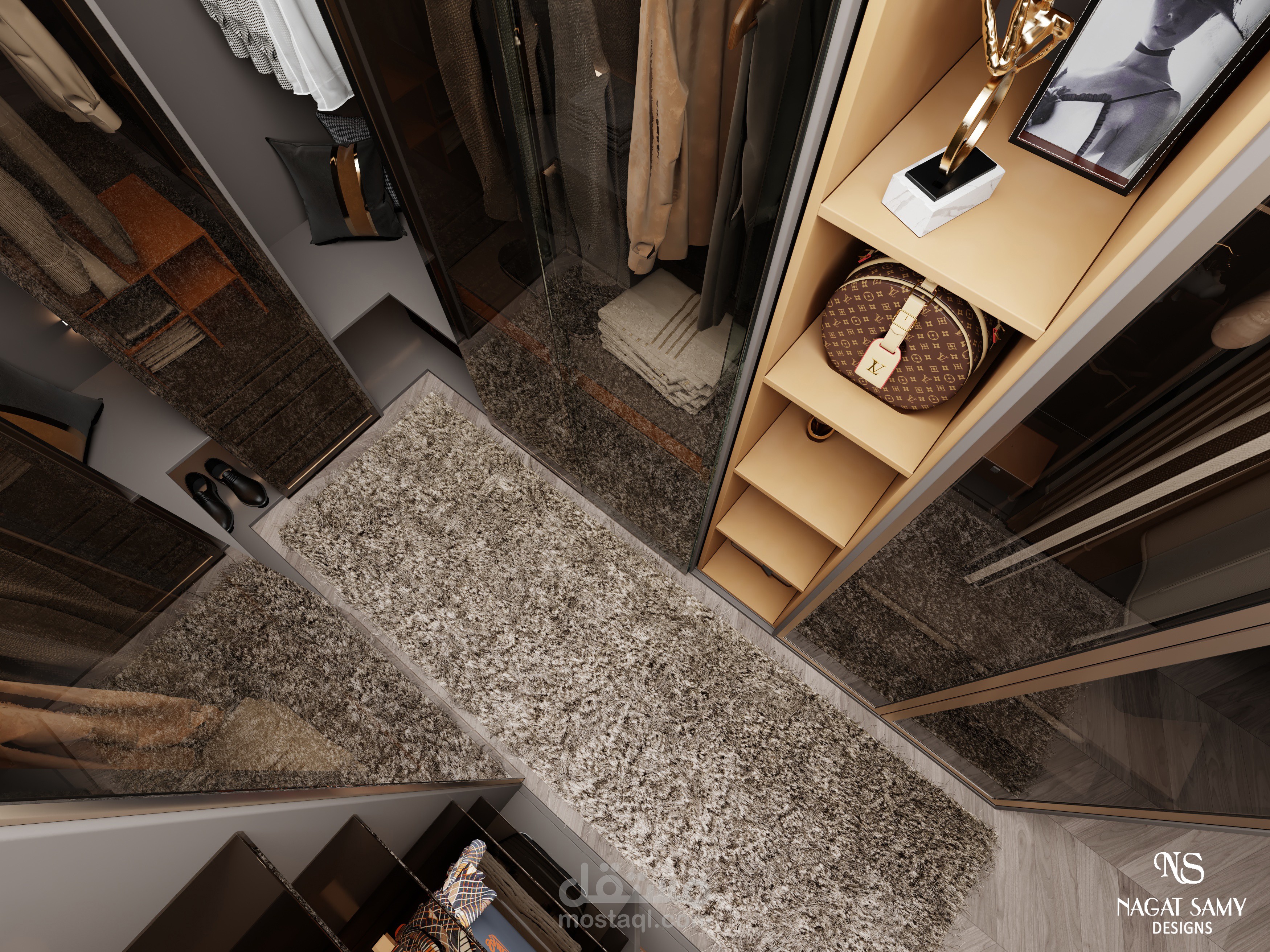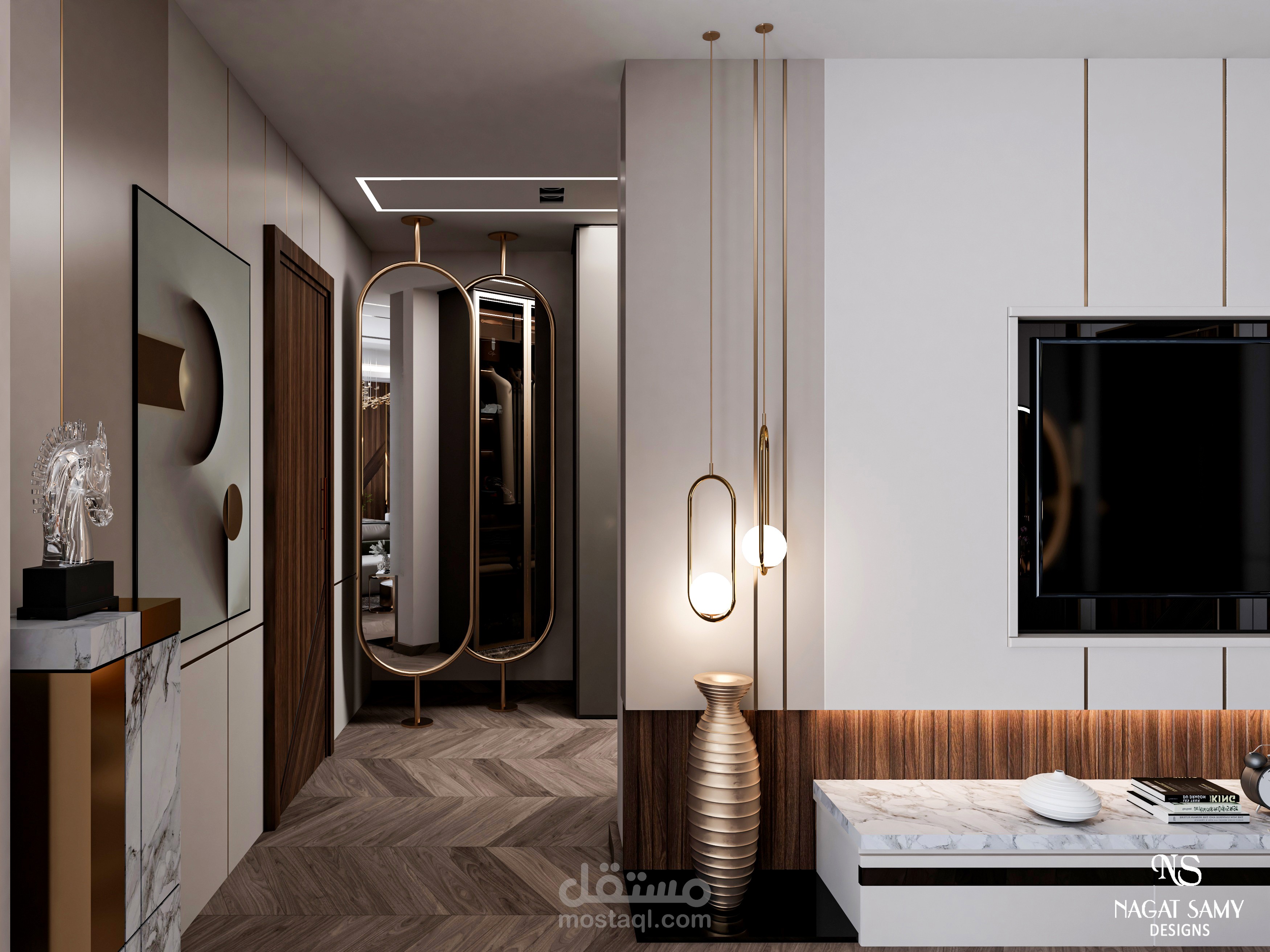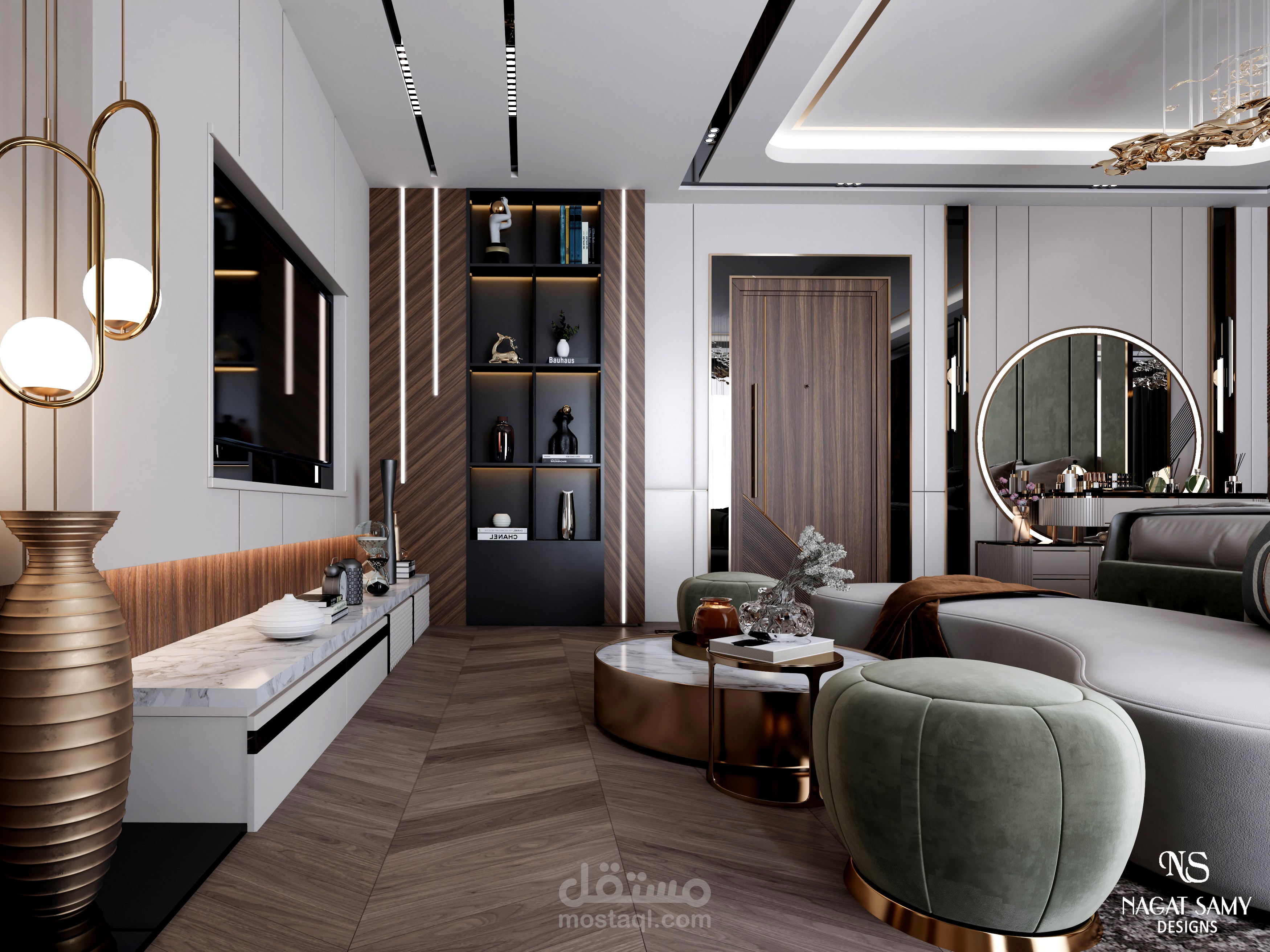 غرفة نوم رئيسية مودرن حسب طلبات العميل بالوان هادئة وتوحى بالبهجه