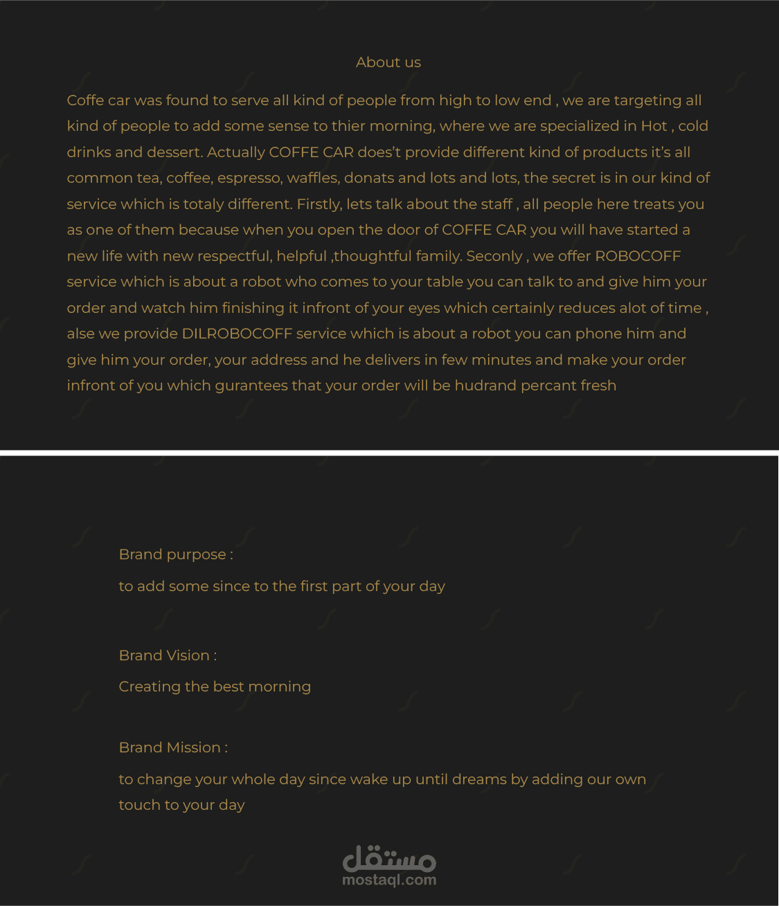 Coffe car was found to serve all kind of people from high to low end , we are targeting all kind of people to add some sense to thier morning, where we are specialized in Hot , cold drinks and dessert. Actually COFFE CAR does’t provide different kind of products it’s all common tea, coffee, espresso, waffles, donats and lots and lots, the secret is in our kind of service which is totaly different. Firstly, lets talk about the staff , all people here treats you as one of them because when you open the door of COFFE CAR you will have started a new life with new respectful, helpful ,thoughtful family. Seconly , we offer ROBOCOFF service which is about a robot who comes to your table you can talk to and give him your order and watch him finishing it infront of your eyes which certainly reduces alot of time , alse we provide DILROBOCOFF service which is about a robot you can phone him and give him your order, your address and he delivers in few minutes and make your order infront of you which gurantees that your order will be hudrand percant fresh