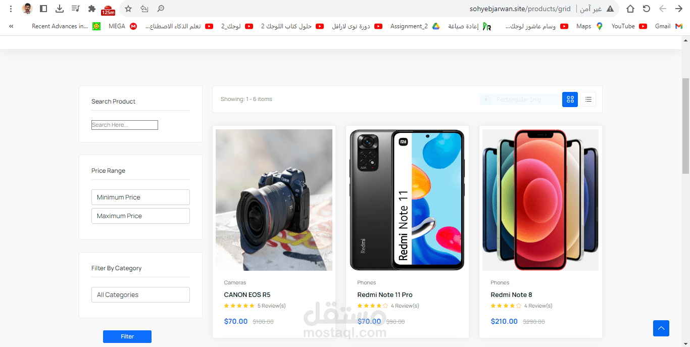 5- صفحة ال(ShopGrids) وفيها يتم عرض جميع المنتجات واستخدام فلاتر في البحث حتى يتم تنقيتها.
