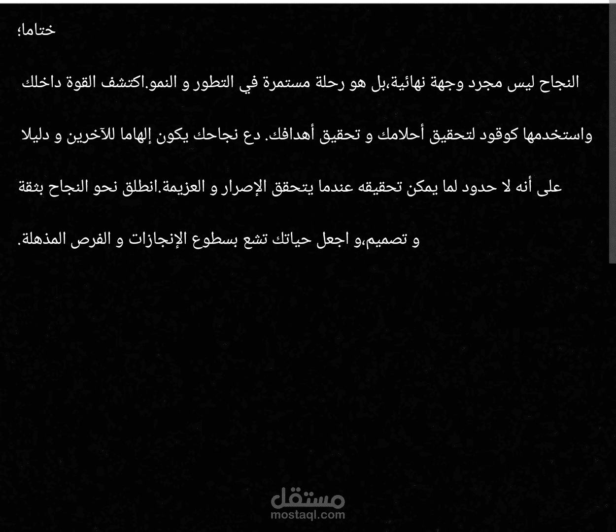 اختتمت المقال بملخص للنقاط الرئيسية وتعزيز الفكرة بأن النجاح هو رحلة مستمرة يقودها العزيمة والتفاني.